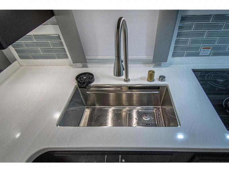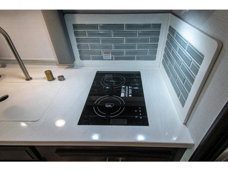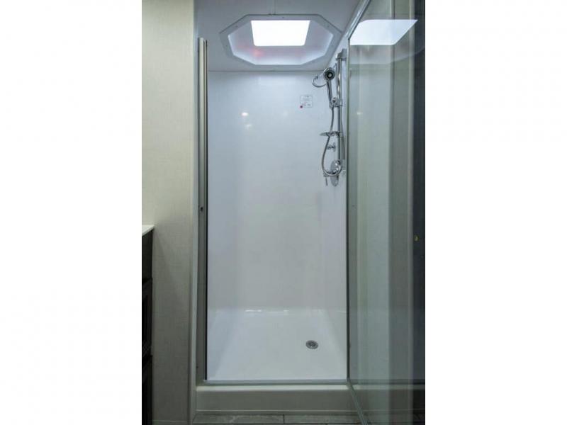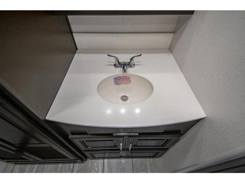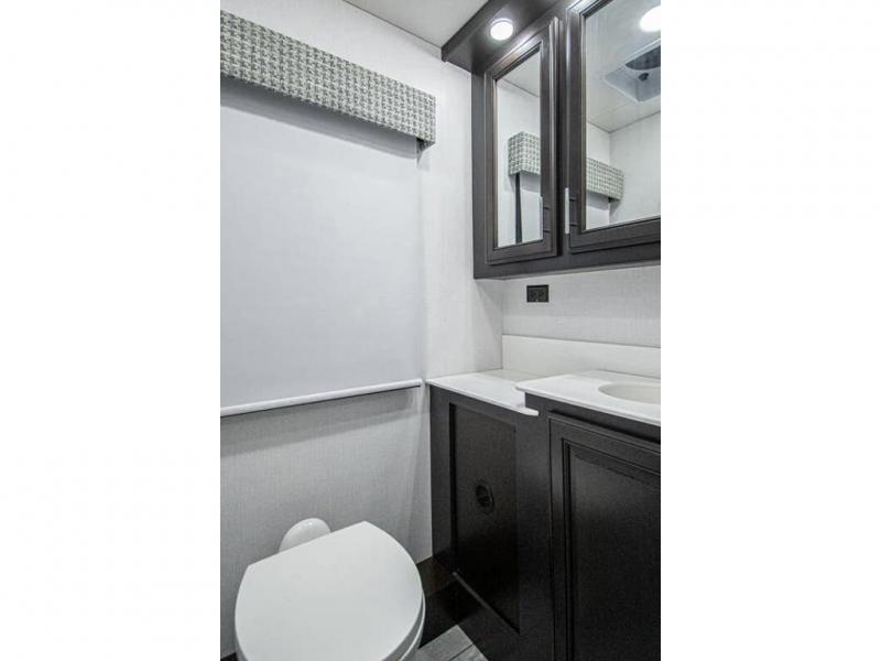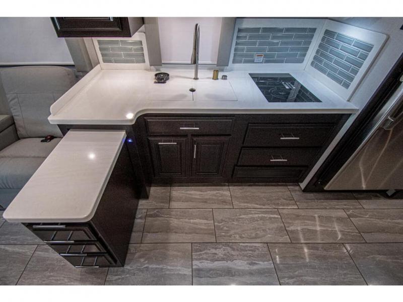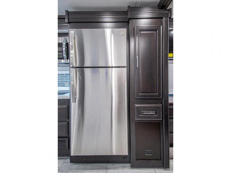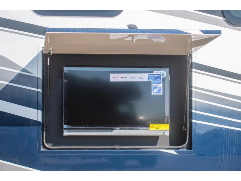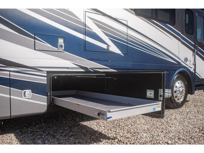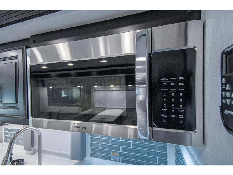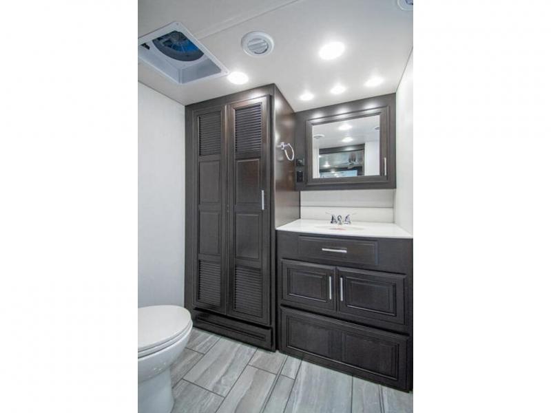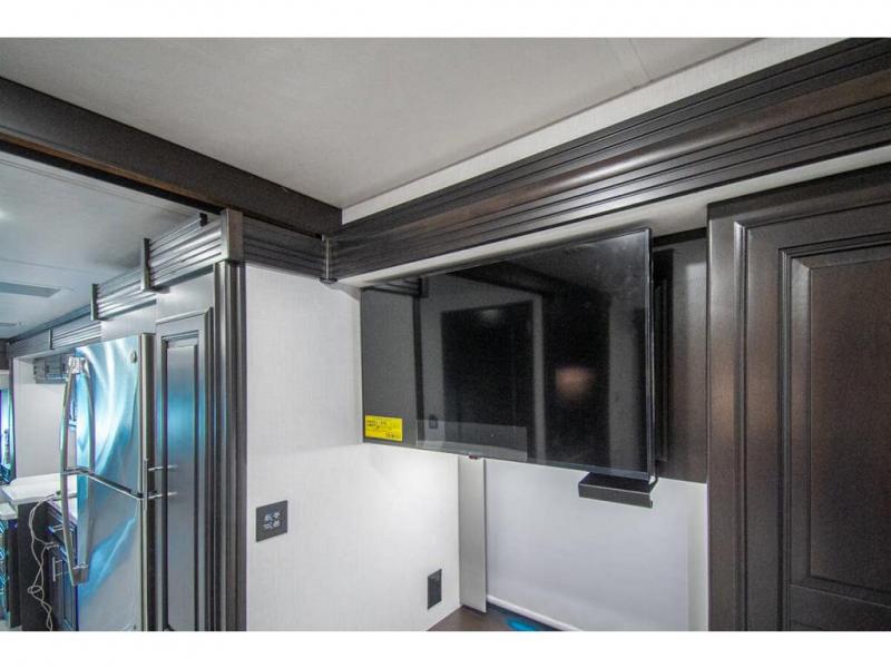 Triple slides plus a bath and a half means more guests can tag along in this comfortable coach. The master bedroom features a dresser base and a wardrobe, plus a 32" bedroom TV to watch your favorite shows at night. You will love the full rear bath that includes a spacious shower, cabinet storage, and a stackable washer and dryer. The main living area will feel more like home with a fireplace, two sofas, a booth dinette, and a 50" LED TV. This coach also includes a double door residential refrigerator, an over-the-range convection microwave, plus a large pantry to store snacks and paper goods.