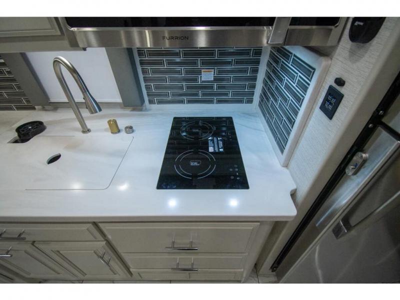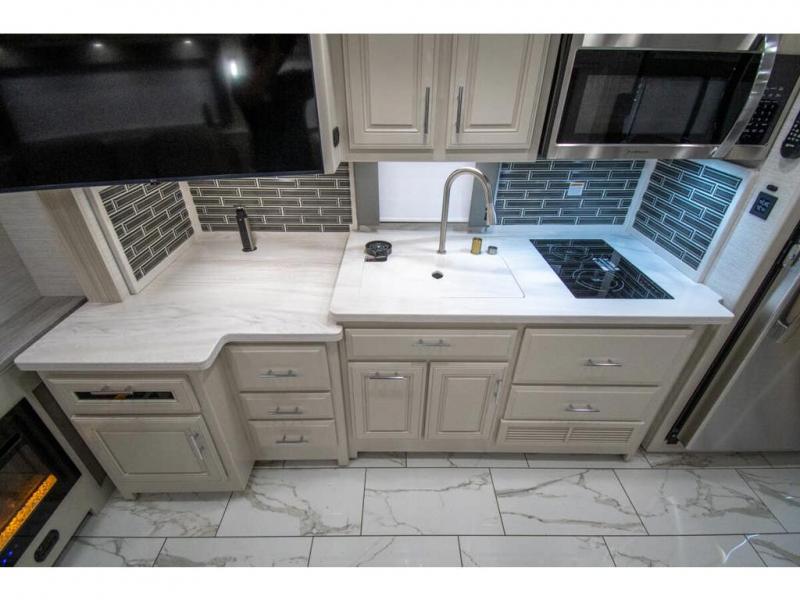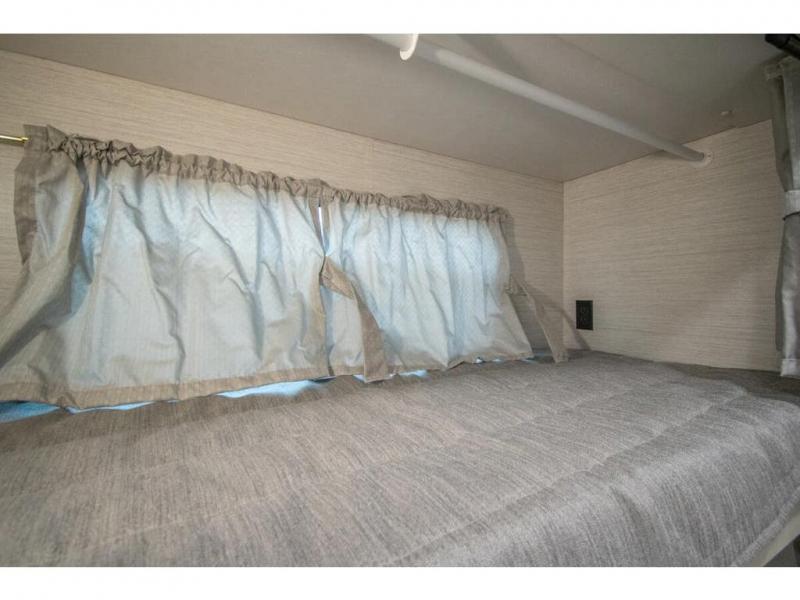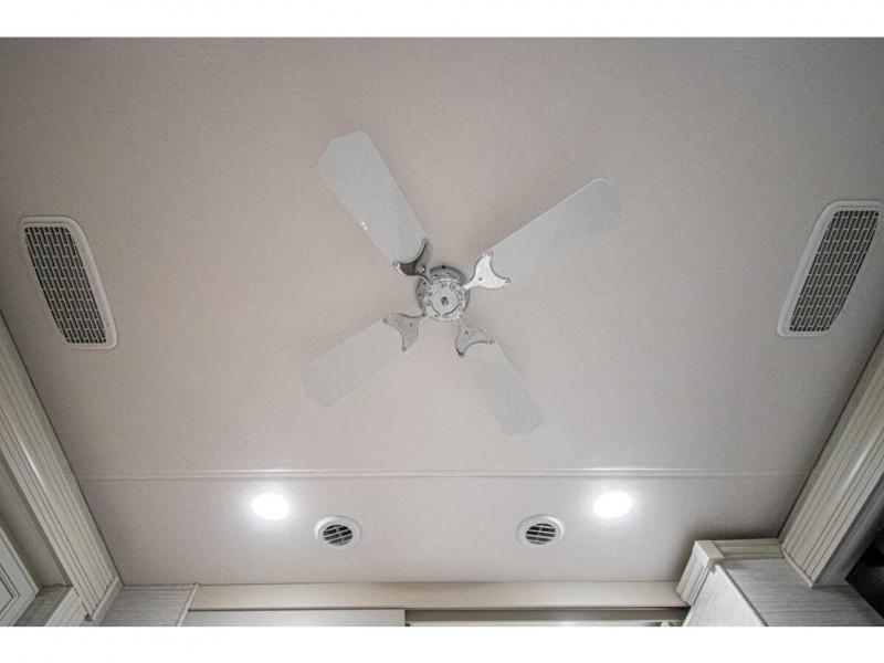 Nothing says comfort like triple slides, two full baths, plus bunk beds! You'll enjoy all that and more in this cozy coach. The large wardrobe/bunk beds are right across from one of the full baths for convenience, and the other full bath is tucked away in the back for privacy. There is a king bed slide out in the master bedroom, as well as a 32'' LED TV and a bedroom ceiling fan to keep the air flowing. The little ones will love the overhead bunk lift, and any other guests can sleep on the hide-a-bed sofa or the booth dinette. When it comes time to cook meals, the two burner electric induction cooktop and convection microwave will get the job done, and the residential refrigerator can store all the perishables.