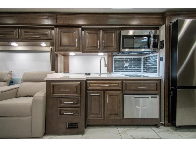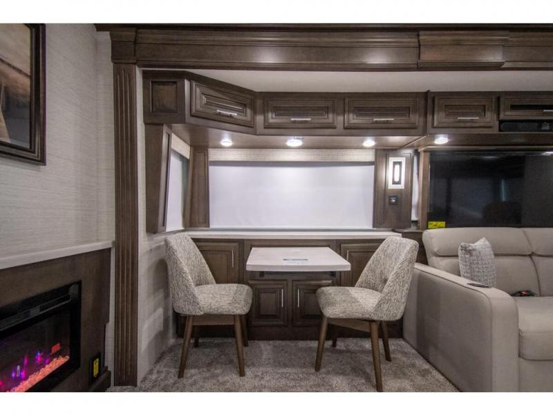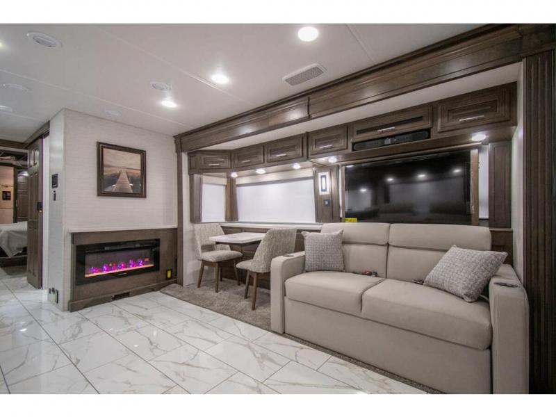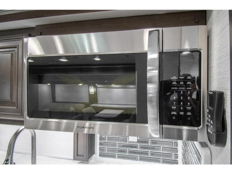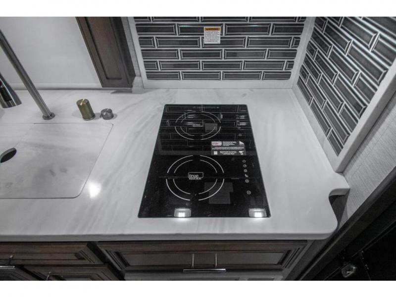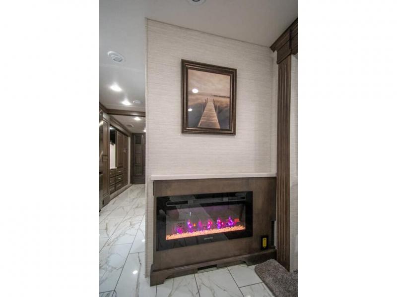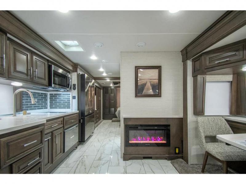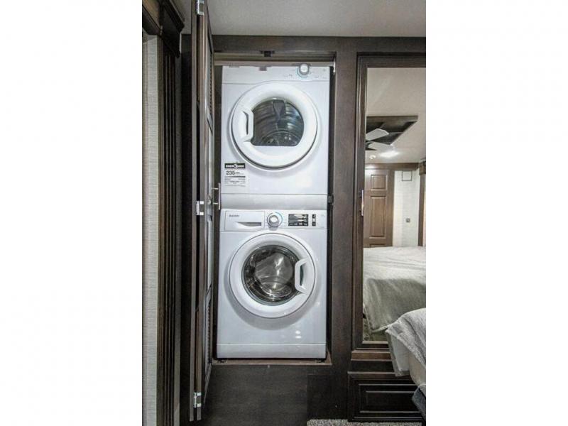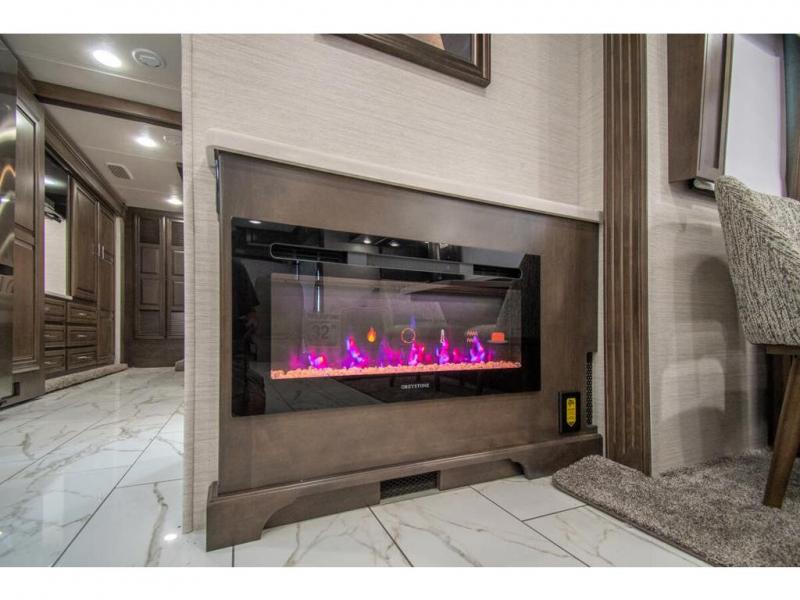 Fall in love with adventure when you travel in this triple slide out coach. Your crew can relax the sofa/bed, the hide-a-bed sofa, or the booth dinette. You will enjoy the fireplace, plus there is a 32" overhead TV, a 32" LED TV in the bedroom, and an exterior 40" LED TV. The kitchen includes everything you would find at home, including a 30" over-the-range convection microwave, a two burner electric induction cooktop, and a 23 cu. ft. French door residential refrigerator. You and your spouse will have the rear private bedroom all to yourselves with a slide out Tilt-A-View king bed, two wardrobes, and a stackable washer and dryer!