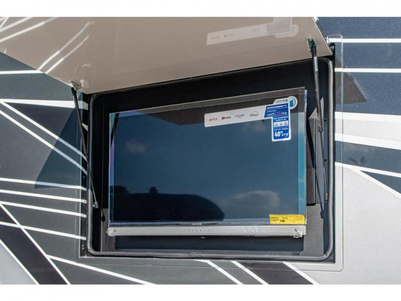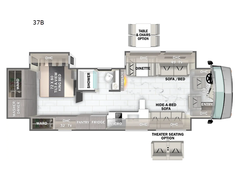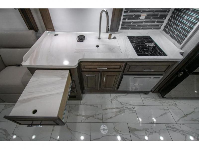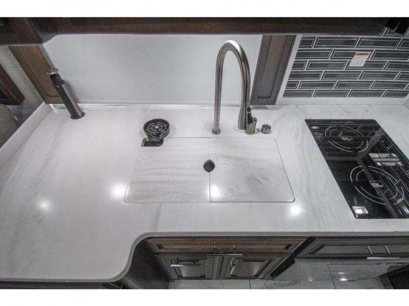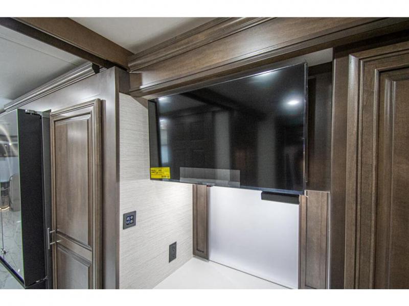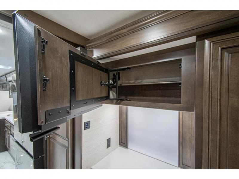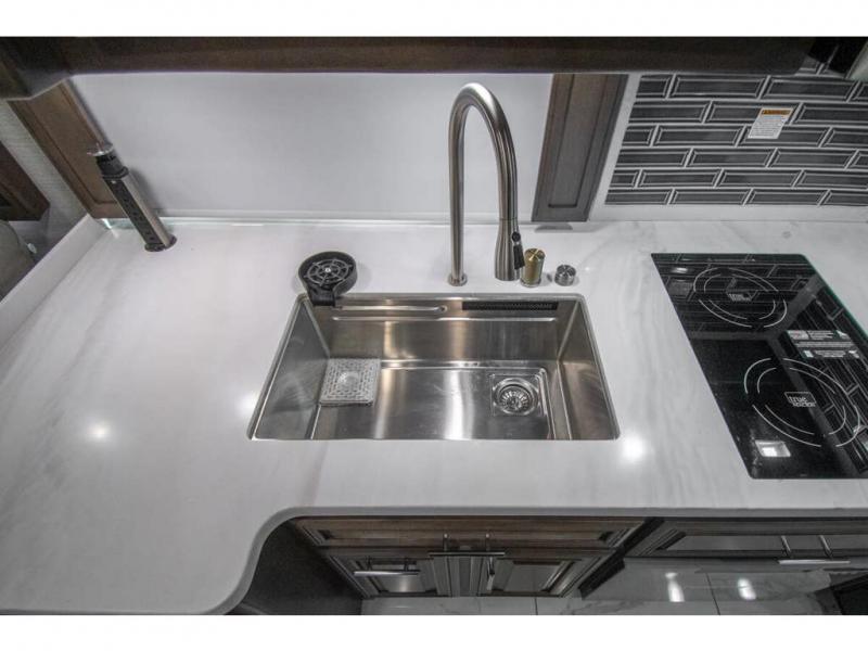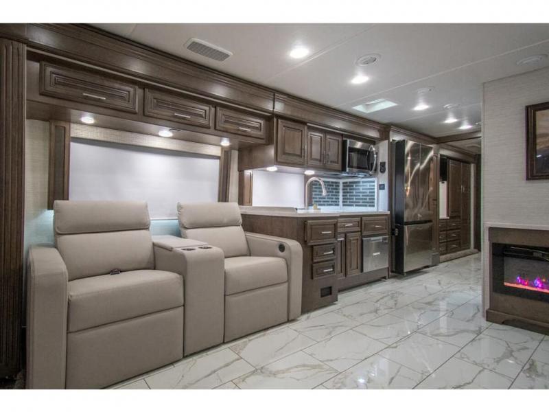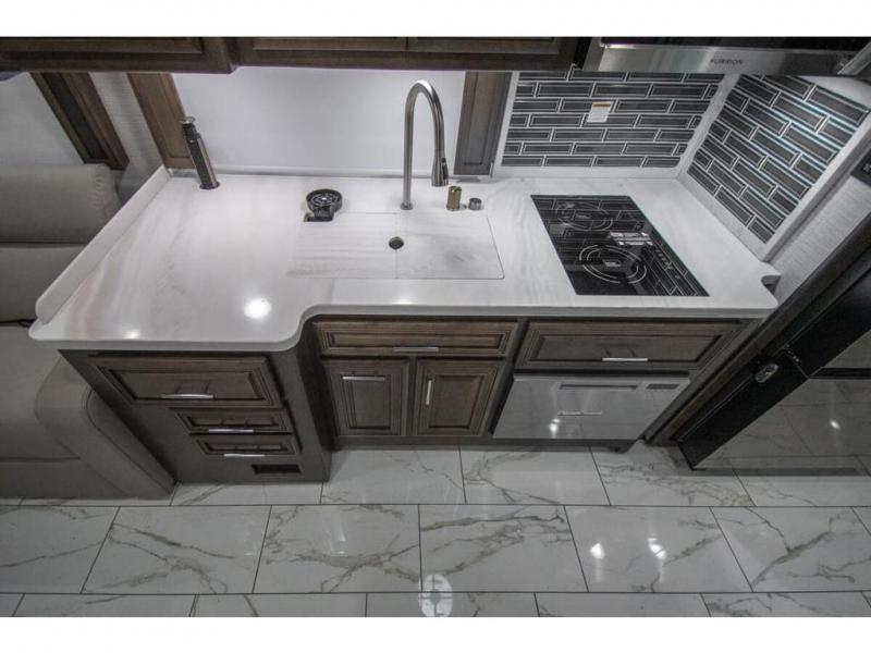 Fall in love with adventure when you travel in this triple slide out coach. Your crew can relax the sofa/bed, the hide-a-bed sofa, or the booth dinette. You will enjoy the fireplace, plus there is a 32" overhead TV, a 32" LED TV in the bedroom, and an exterior 40" LED TV. The kitchen includes everything you would find at home, including a 30" over-the-range convection microwave, a two burner electric induction cooktop, and a 23 cu. ft. French door residential refrigerator. You and your spouse will have the rear private bedroom all to yourselves with a slide out Tilt-A-View king bed, two wardrobes, and a stackable washer and dryer!