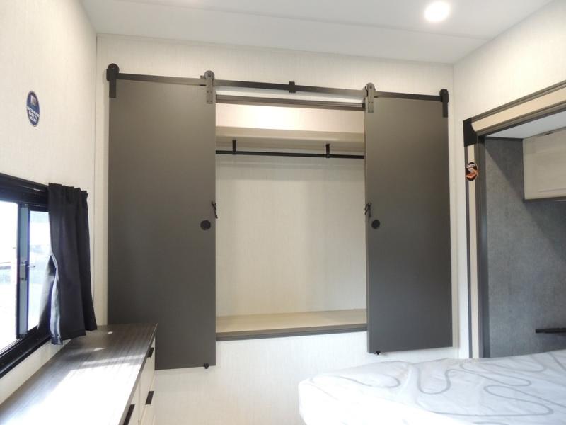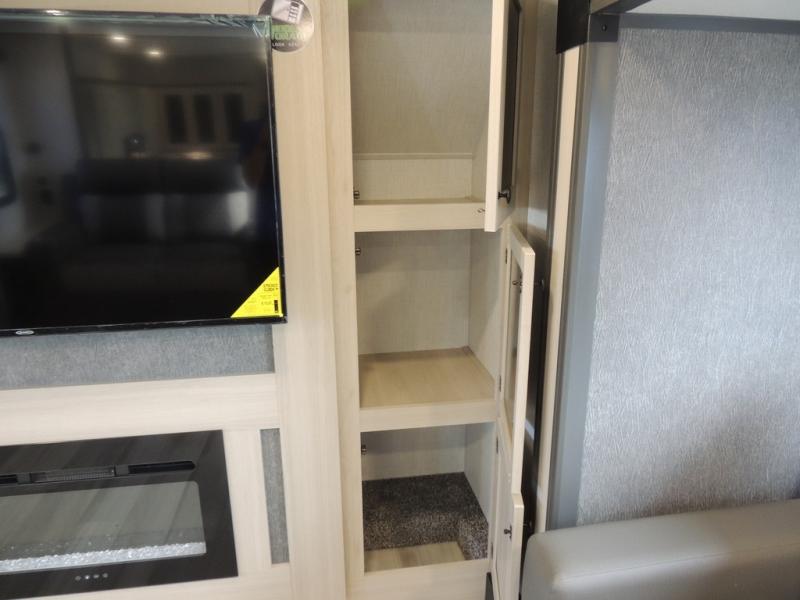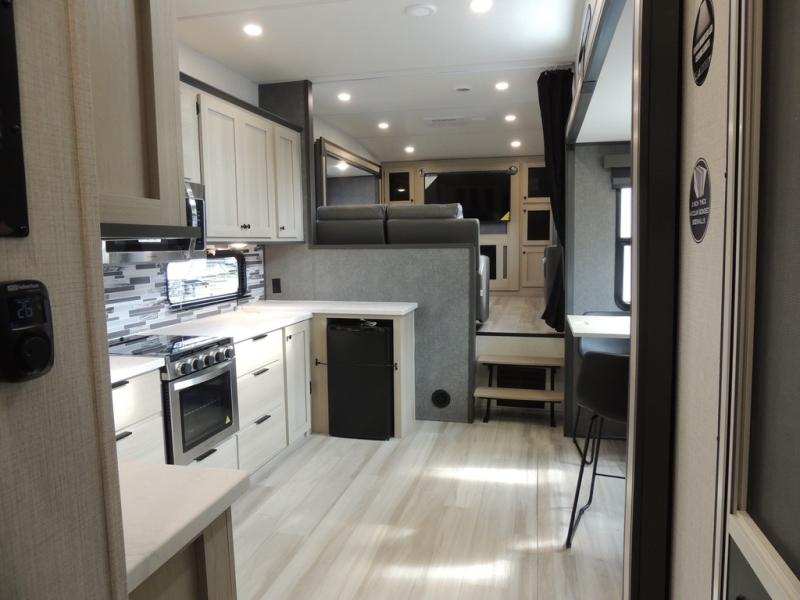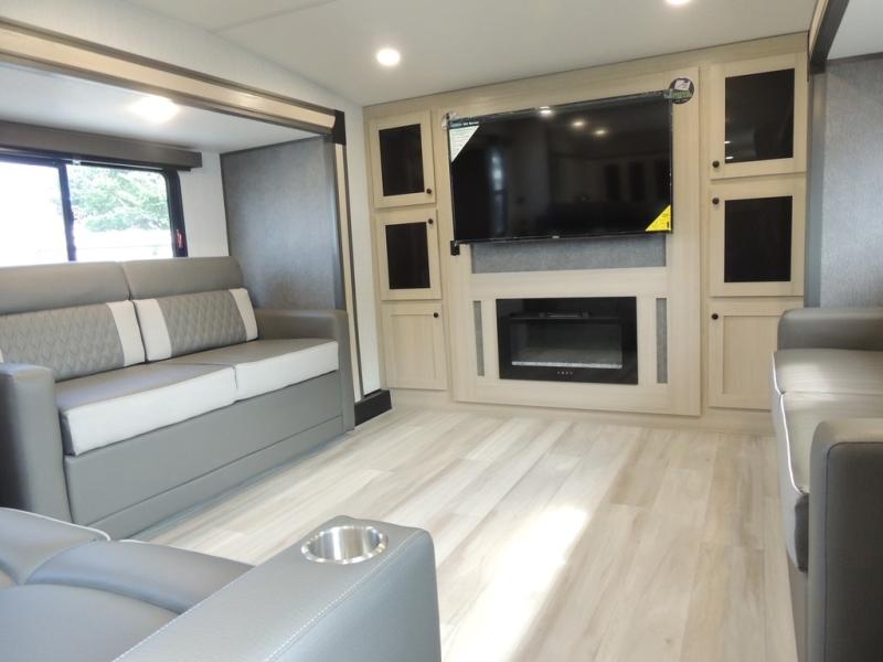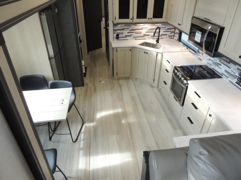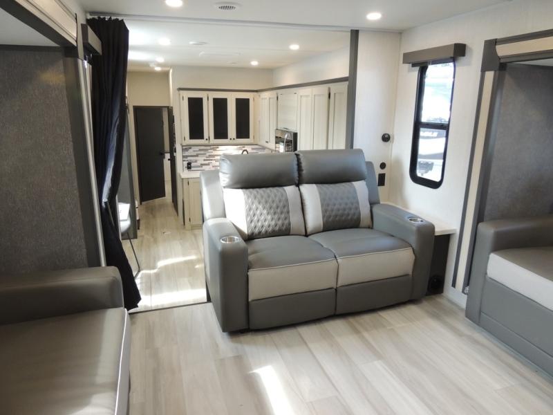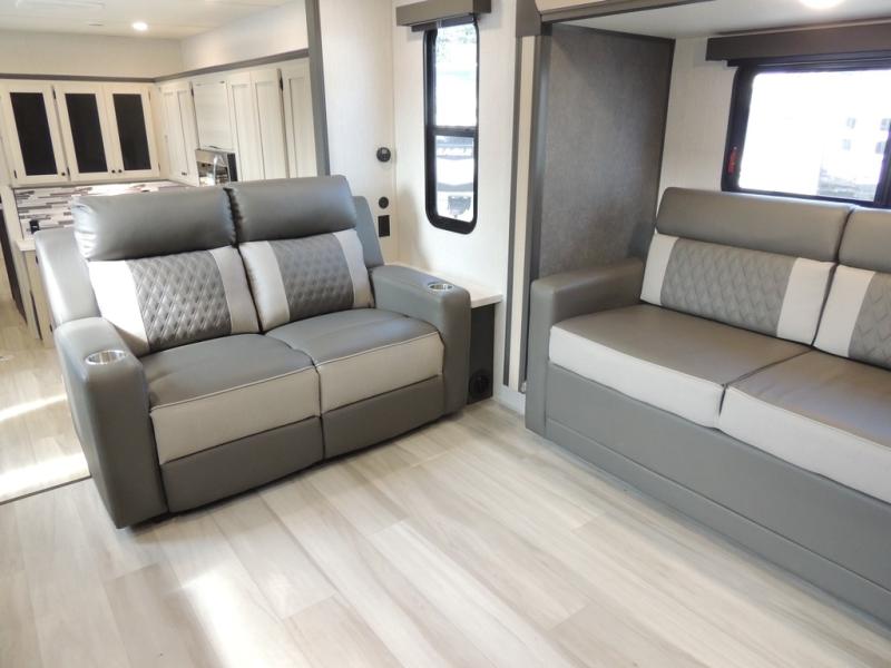 This fifth wheel is packed with features to make each trip enjoyable! The middle kitchen might be your favorite room with wrap-around counter space, a pantry, and a 16-cu. ft. 12V refrigerator for food storage. You can dine at the hi-top table and chairs here or sit in the front living area on the dual sofas and theater seating! This area can become your guest's bedroom at night since there are dual opposing slides and wardrobe storage for their things. You will also find a full-length wardrobe in the rear private bedroom, along with a king bed slide out, plus washer and dryer prep! And of course, there is a full bath so everyone can stay clean each day!