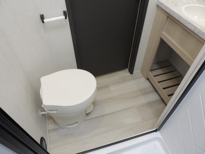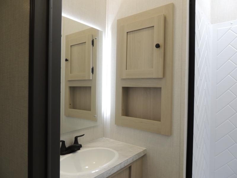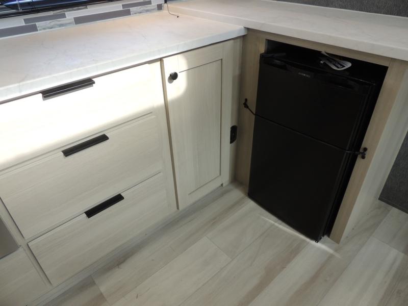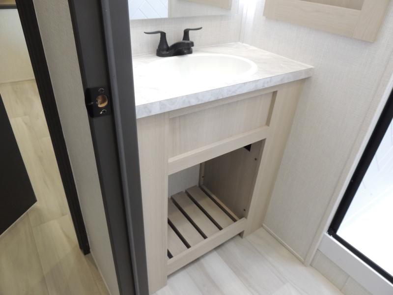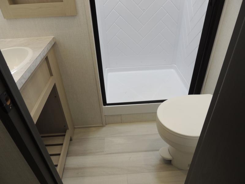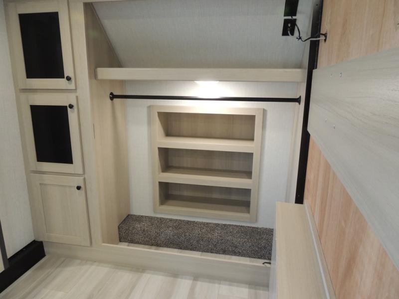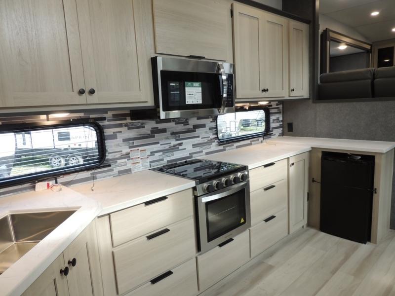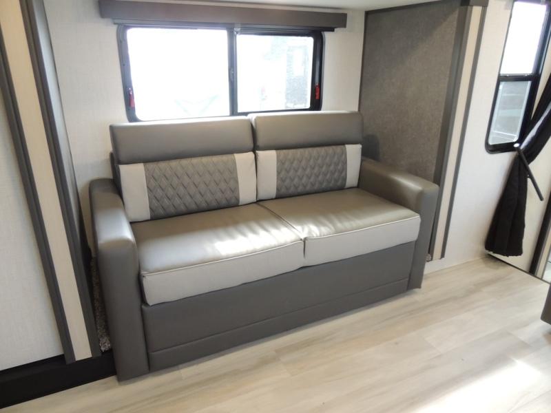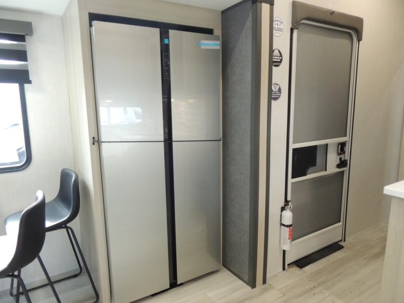 This fifth wheel is packed with features to make each trip enjoyable! The middle kitchen might be your favorite room with wrap-around counter space, a pantry, and a 16-cu. ft. 12V refrigerator for food storage. You can dine at the hi-top table and chairs here or sit in the front living area on the dual sofas and theater seating! This area can become your guest's bedroom at night since there are dual opposing slides and wardrobe storage for their things. You will also find a full-length wardrobe in the rear private bedroom, along with a king bed slide out, plus washer and dryer prep! And of course, there is a full bath so everyone can stay clean each day!