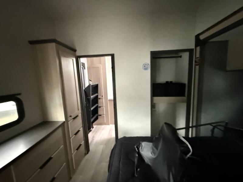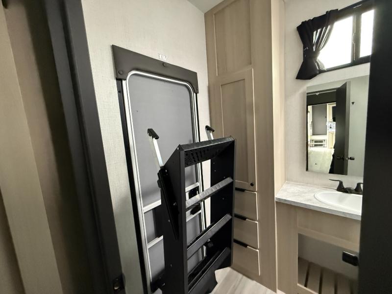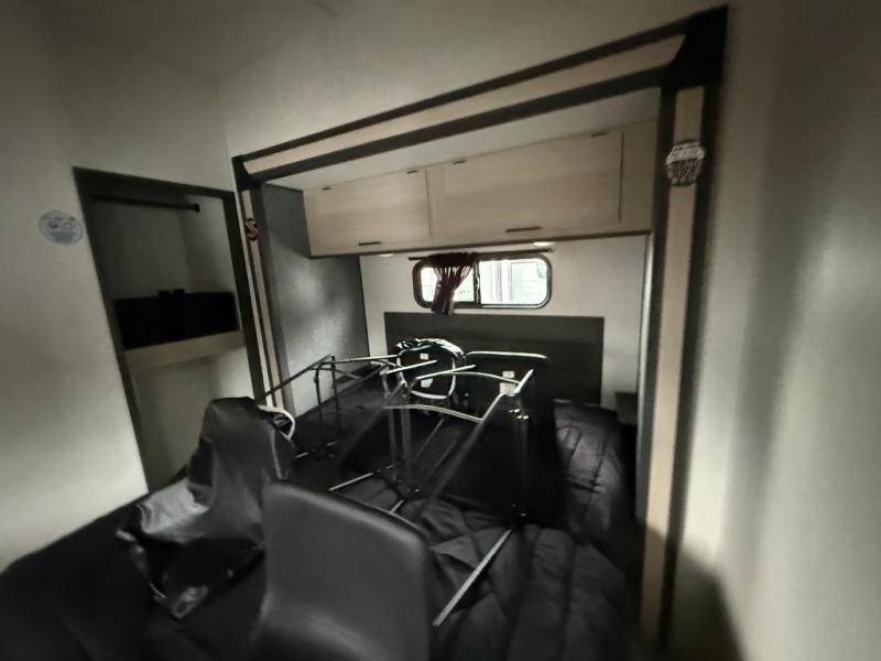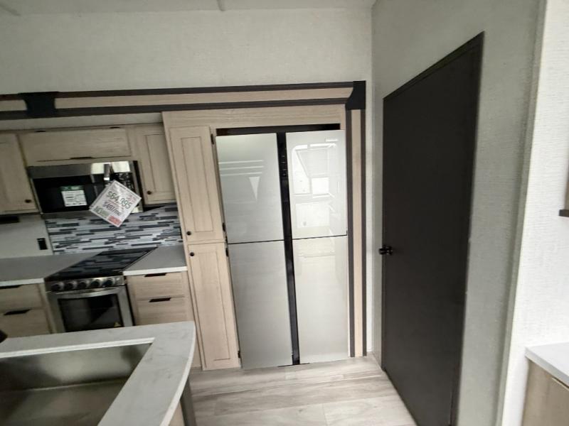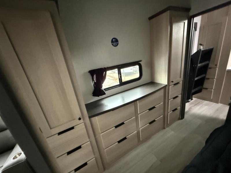 If you're ready for fun, look for further than this dual entry Cardinal fifth wheel! It will be so easy to travel with friends and family since there is a master bedroom with a 66" x 80" king bed and a full rear bath, plus a front bunkhouse suite with bunk beds, a full-size bed, and a second full bath! The chef of your crew can whip up breakfast in the morning on the 21" 2-in-1 oven range or in the over-the-range microwave. There is also a 16-cu. ft. 12V refrigerator and walk-in pantry for food storage! The super sofa slide out sits across from the entertainment center and fireplace for easy viewing in the evening, or you may just find yourselves outdoors visiting with campground neighbors!