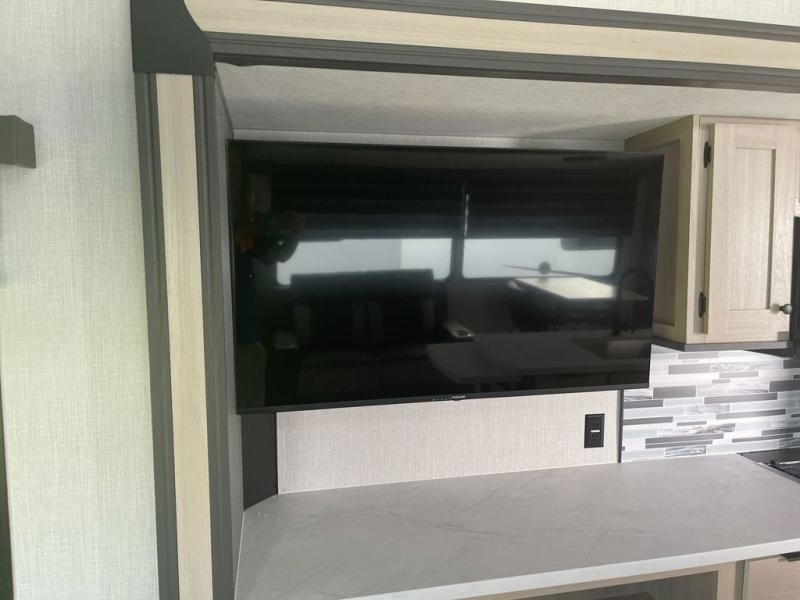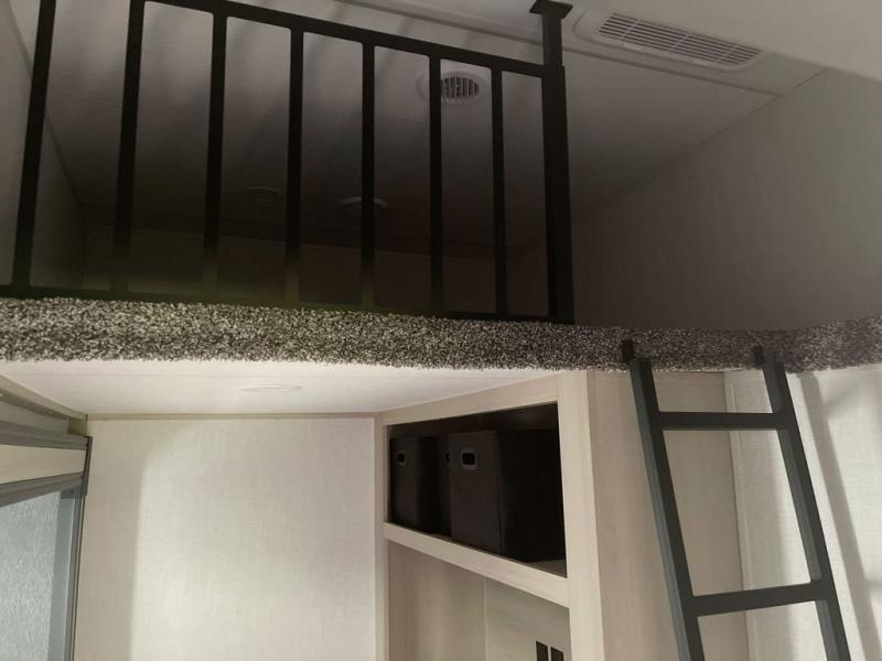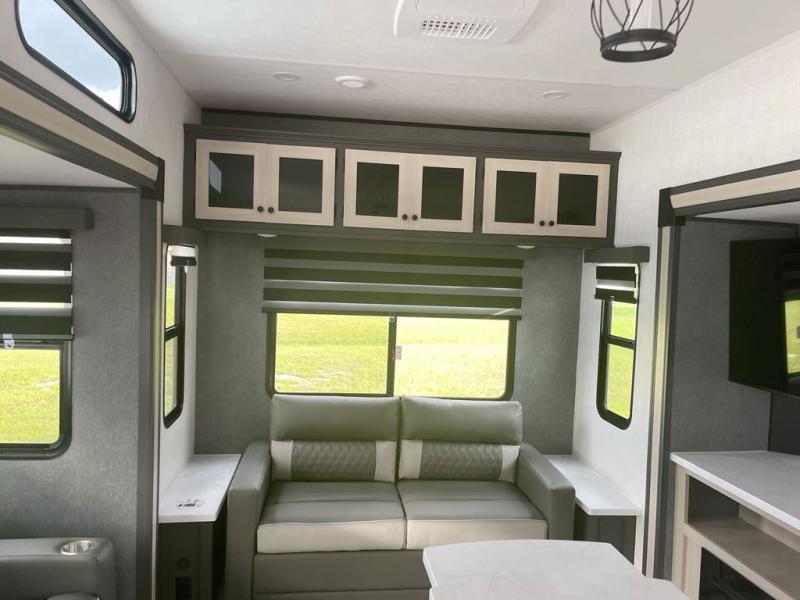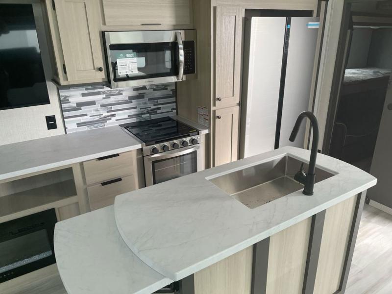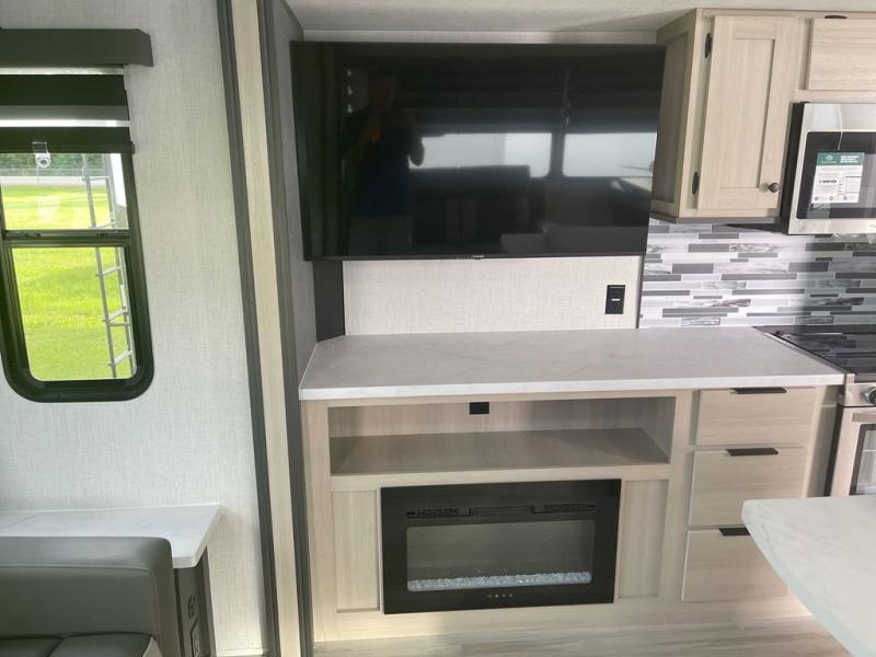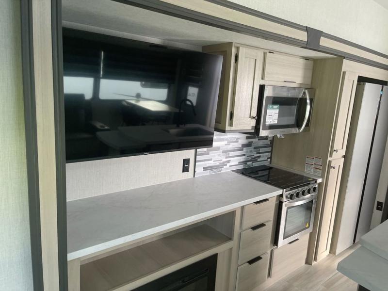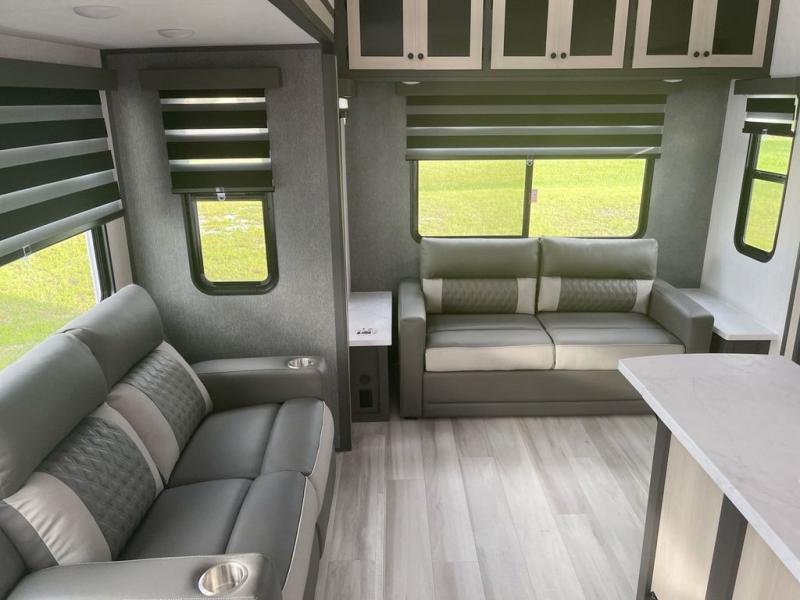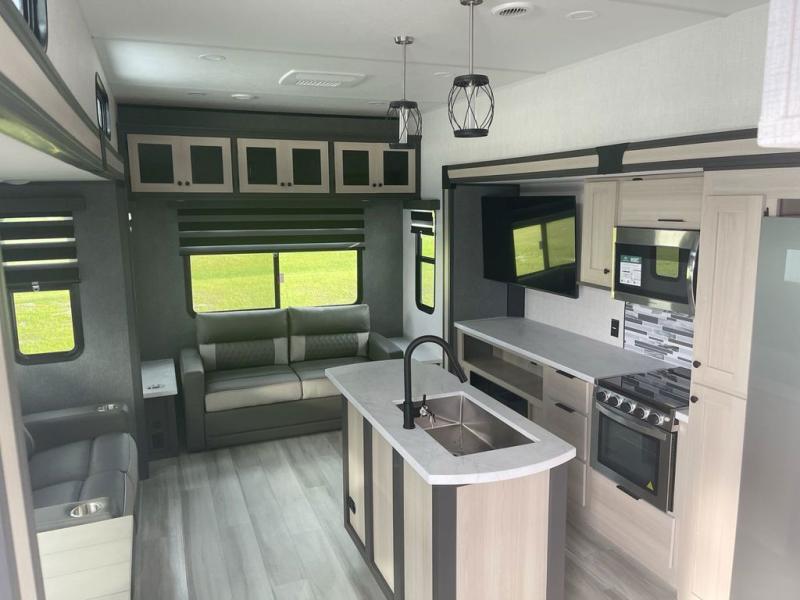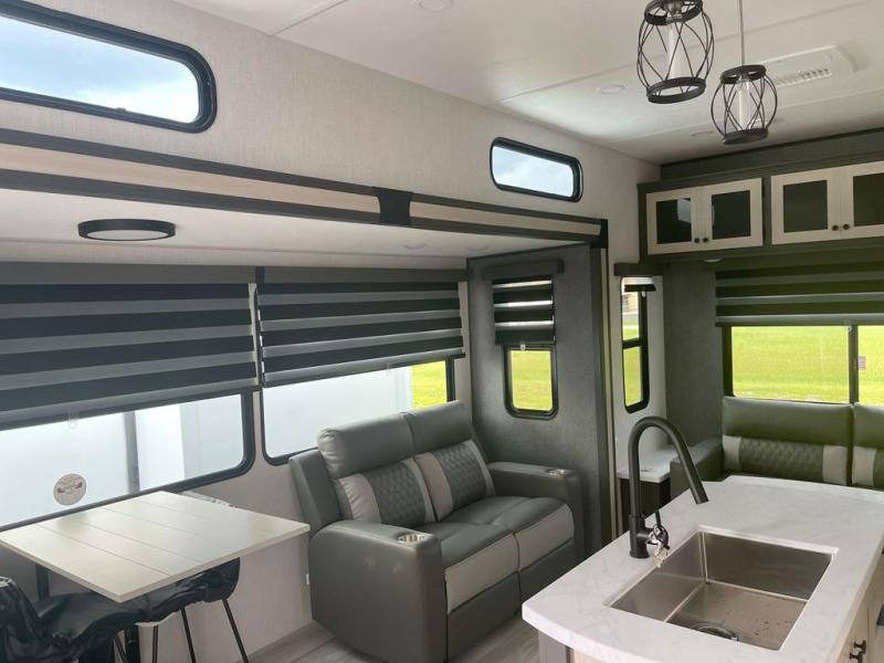 Wow! You won't believe the features found in this luxury fifth wheel that can sleep up to nine each night! Your guests or the kids will absolutely love the middle bunkroom with a hide-a-bed sofa and bunk beds plus a loft above for even more sleeping or storage space. There is also a desk/wardrobe here, which will allow you to utilize this space as an office as well! You'll have your own space in the front private bedroom on the king bed slide out, and there is a walk-in wardrobe to keep your clothes tidy. There is even washer and dryer prep for the option to keep those clothes clean! The chef of your group will have everything they need to prepare meals, including a 21" 2-in-1 oven range, an over-the-range microwave, a 16 cu. ft. 12V refrigerator, plus a kitchen island for more counter space. In the evenings, your crew can get cozy on the rear sofa and theater seats across from the entertainment center and fireplace, or you might just play a game at the hi-top table and chairs!