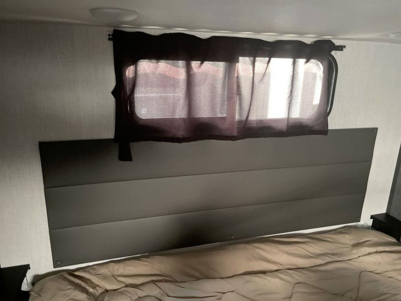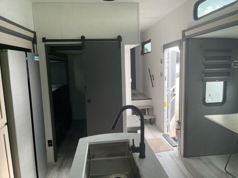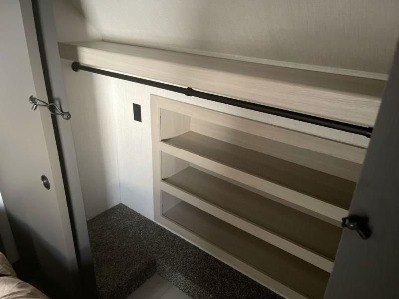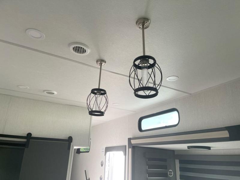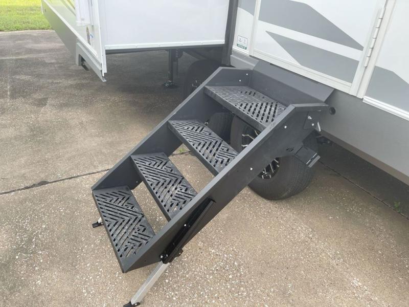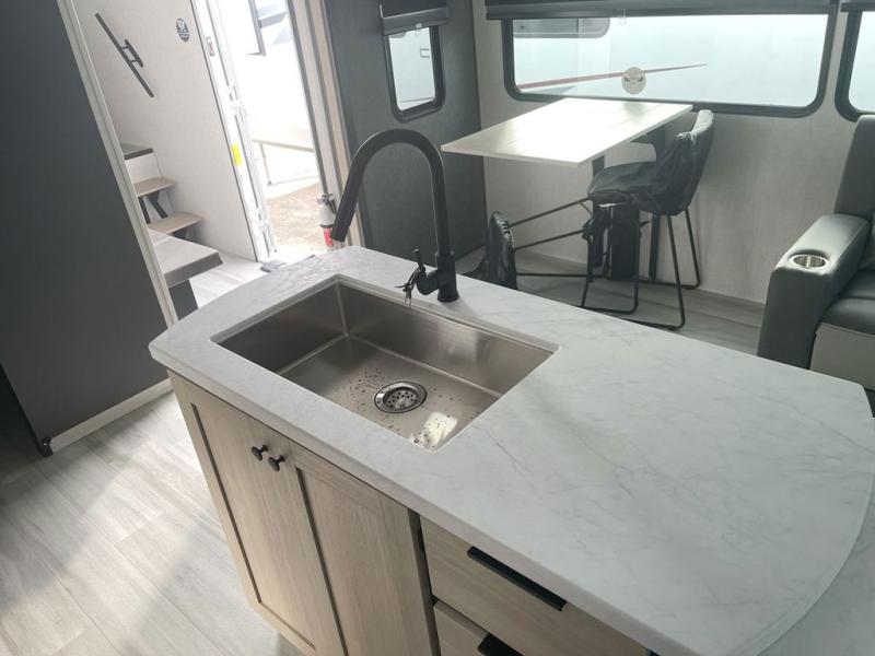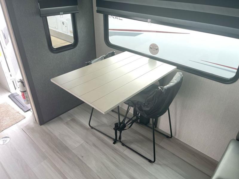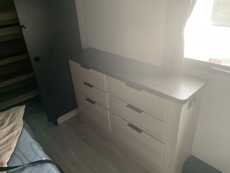 Wow! You won't believe the features found in this luxury fifth wheel that can sleep up to nine each night! Your guests or the kids will absolutely love the middle bunkroom with a hide-a-bed sofa and bunk beds plus a loft above for even more sleeping or storage space. There is also a desk/wardrobe here, which will allow you to utilize this space as an office as well! You'll have your own space in the front private bedroom on the king bed slide out, and there is a walk-in wardrobe to keep your clothes tidy. There is even washer and dryer prep for the option to keep those clothes clean! The chef of your group will have everything they need to prepare meals, including a 21" 2-in-1 oven range, an over-the-range microwave, a 16 cu. ft. 12V refrigerator, plus a kitchen island for more counter space. In the evenings, your crew can get cozy on the rear sofa and theater seats across from the entertainment center and fireplace, or you might just play a game at the hi-top table and chairs!