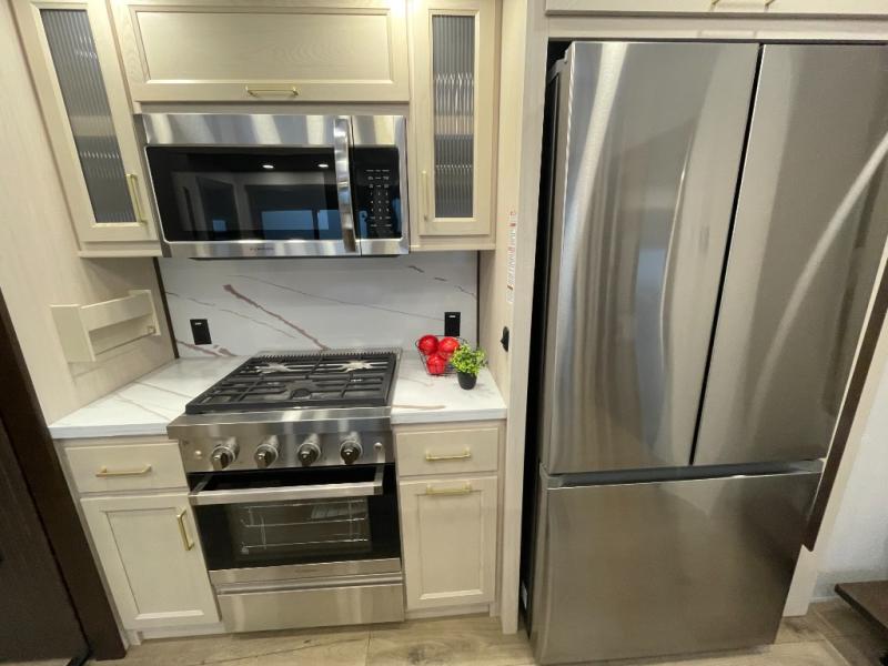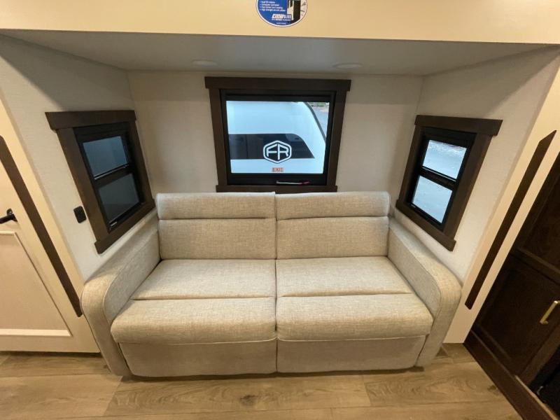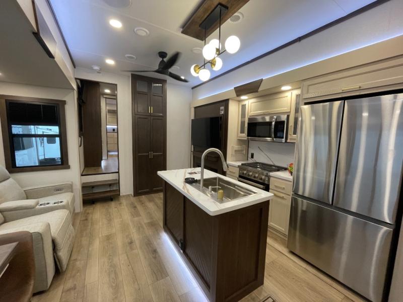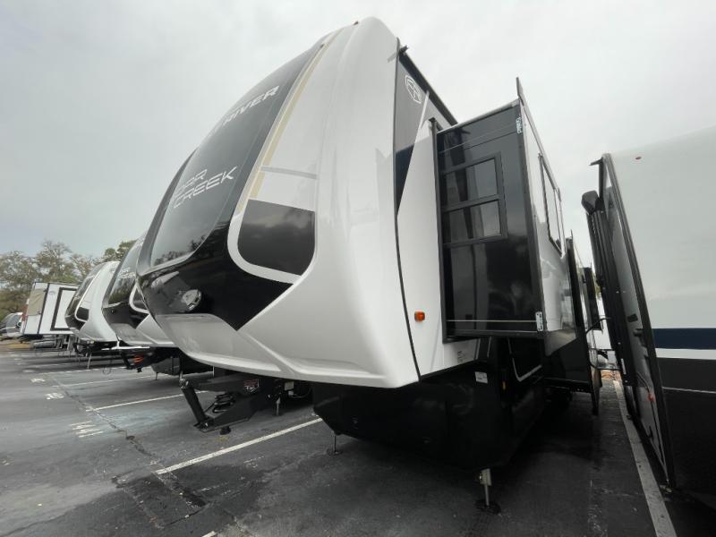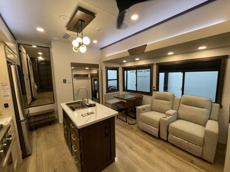 With any Cedar Creek fifth wheel by Forest River, you will find a quality-built RV with your comfort in mind! The all-aluminum super structure on 16" centers or less will provide a solid foundation to your fifth wheel, and the 3M bonded sidewalls will hold up and provide resistance to UV, heat, cold moisture, and even highway chemicals. Each model also includes a Road Warrior suspension for smooth towing, a 6-Point Hydraulic, GEN 3 Leveling System, and a new 101" wide body frame. Inside, you'll enjoy walnut/two tone wooden cabinetry with hidden hinges, cutting board drawer with cut-out trash funnel, motion lighting in the bath and bedroom closet, plus many more comforts. The New Travelfi™ Pay-as-you go internet provides the ability to bring your own internet rather than relying solely on campground WiFi, and the "Rich Solar" 200W solar panel will give you off-grid capabilities!