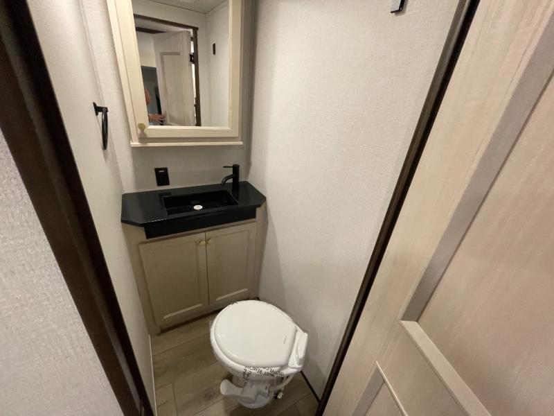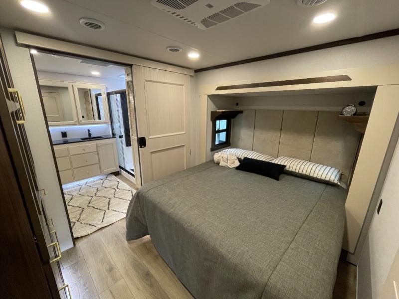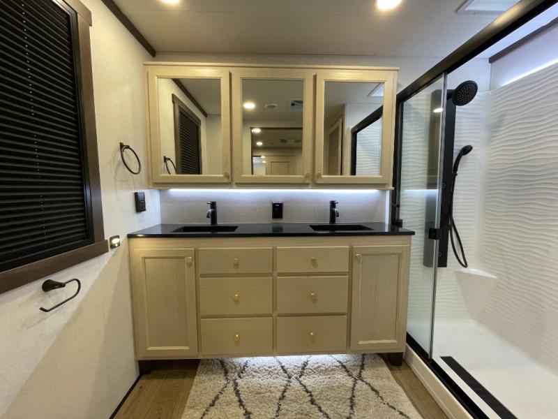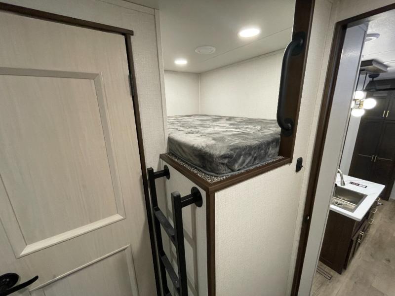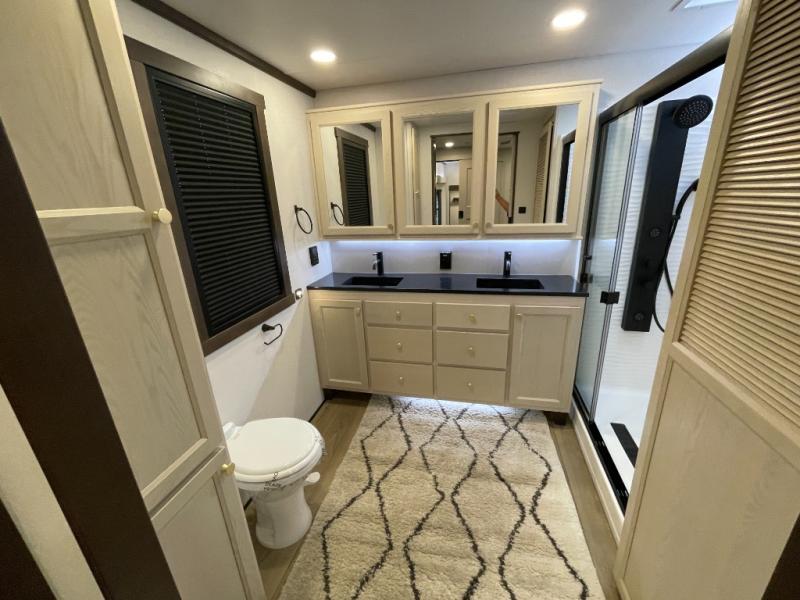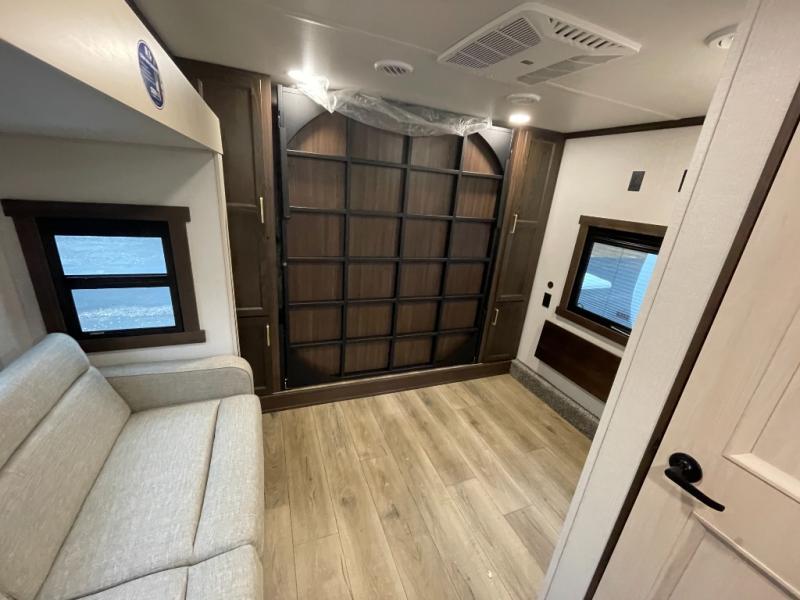 You won't believe all this fifth wheel has to offer! There is a convenient mud room right as you enter the unit where you can use the bench to take your shoes off and not drag dirt in the living areas. The front bedroom includes a jackknife sofa slide out, a half bath, plus a Murphy bed so this room can be used as a guest room! And the loft access is in this room to house more guests or use as storage space. Your crew will love to meet in the middle-combined kitchen and living area with power theater seats, a wall mounted dining table with an extension and an ottoman, plus a kitchen island a sink and plenty of counterspace. There is also a Murphy pantry hidden behind the entertainment center and all the appliances needed to make meals each day. You will be met with comfort in the master bedroom that includes a king bed slide out, a dresser and a TV, plus a full rear bath with dual bath sinks. You will also find a shower with a seat and drop-down storage under the rear bedroom/bathroom, so nothing gets left behind!