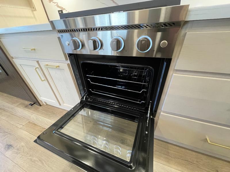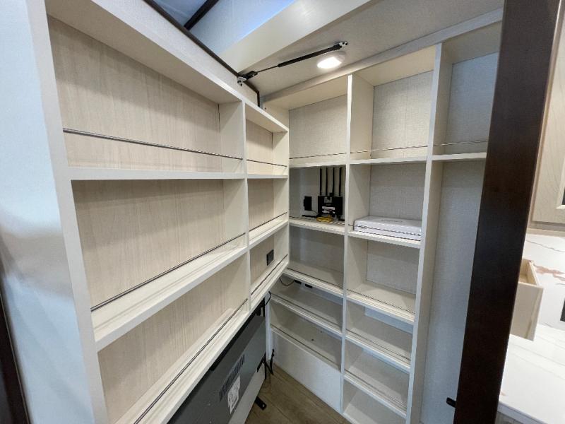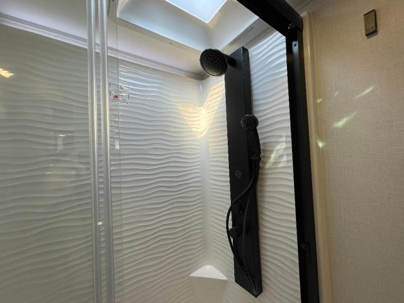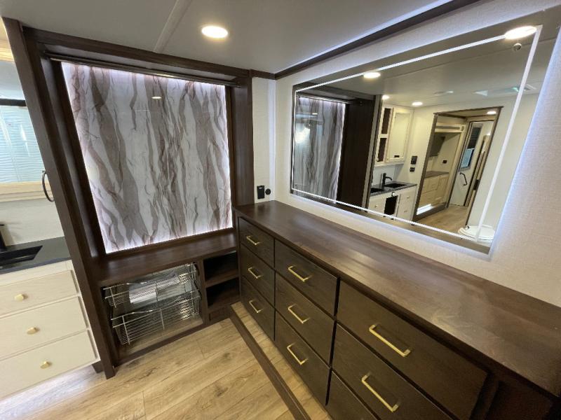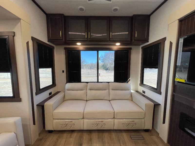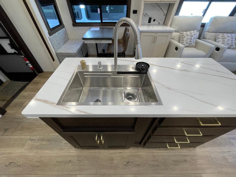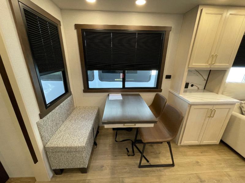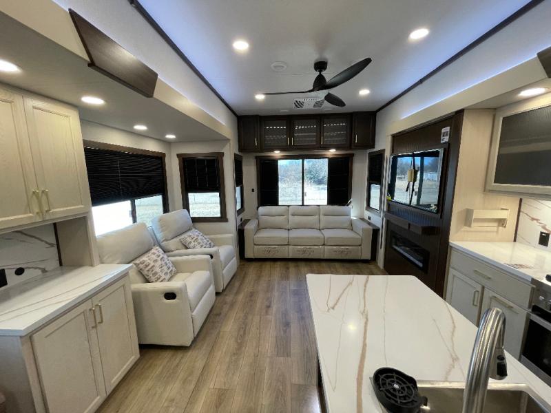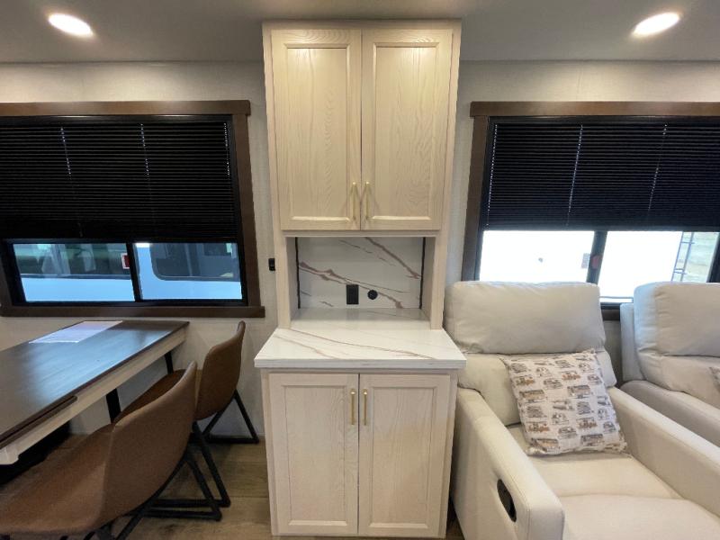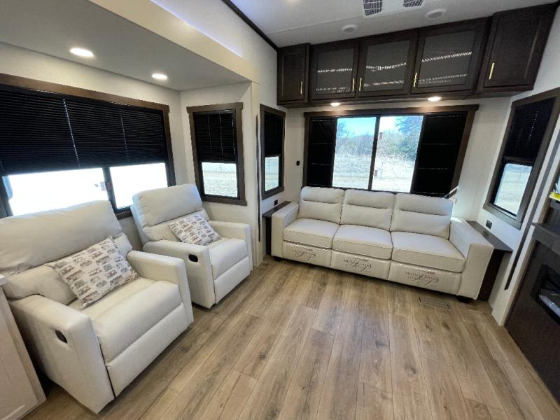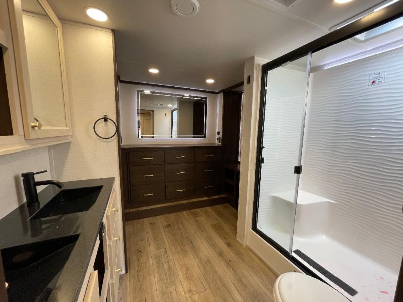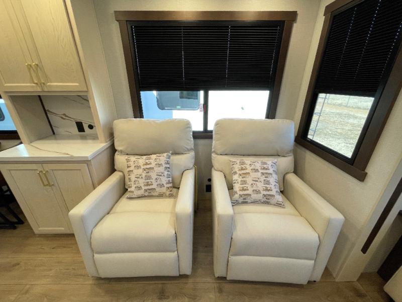 At the front of the 383FB fifth wheel, you’ll find a spacious front bathroom featuring a 48" x 30" shower with a built-in seat and upgraded shower head for a refreshing experience. The 18" high porcelain toilet includes a top circular flush system for added comfort, while LED motion night lighting beneath the vanity adds a convenient touch for nighttime use. This bathroom also provides a walk-in closet with a dresser and shelves equipped with hanging rods, perfect for keeping clothes and essentials neatly organized. Just next to the bathroom, the bedroom houses a king bed in a slide-out, offering plenty of room to stretch out and relax, with additional storage space located across from the bed. Moving toward the rear, the main living area and kitchen open up with dual opposing slides to maximize space and comfort. One slide features a Murphy pantry, a 3-burner gas oven, a 20-cu. ft. stainless steel refrigerator, and a 30" over-the-range microwave with an updated backsplash, while the central kitchen island provides a convenient workspace for the chef on board. Across the way, the opposite slide holds the recliner, table with chairs, and a bench, ideal for dining or lounging after a long day. At the very back, a hide-a-bed sofa offers additional seating and converts easily into extra sleeping space, making this fifth wheel as functional as it is comfortable.