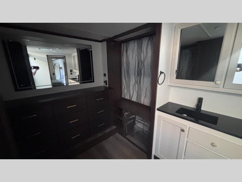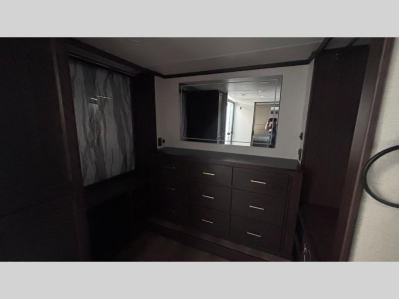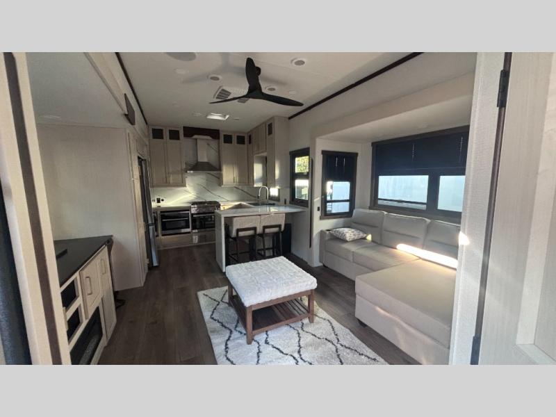 At the front of this 385RK fifth wheel, you’ll find a full bathroom featuring a spacious shower with a built-in seat and convenient LED motion night lighting under the vanity for added comfort. Adjacent to the bathroom is a walk-in closet complete with a dresser and hanging rods, offering ample storage for clothing and gear. Next to this area is the bedroom, which houses a 72" x 80" king bed set in a slide-out for a restful night’s sleep. Across from the bed sits another dresser with a TV, providing extra storage and entertainment. Moving toward the center, a half bath is conveniently located across from the entrance for easy access. The living area opens up with dual opposing slides, creating a roomy lounge space featuring a sectional sofa and an entertainment center with a TV and fireplace, perfect for cozy movie nights. At the rear, the U-shaped kitchen invites the chef of the trip to cook to their heart’s content, equipped with ample overhead cabinets, a 20-cu. ft. stainless steel refrigerator, a 30" stainless steel over-the-range microwave with an updated backsplash, and a 3-burner gas oven with a pull-out pan drawer. Meals can be enjoyed at the convenient bartop with stools to the side, making this fifth wheel both stylish and functional.