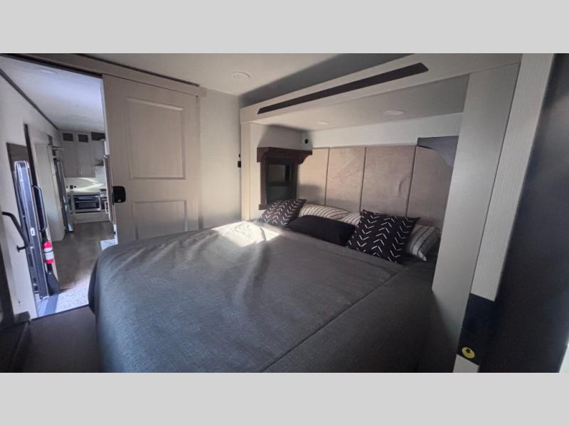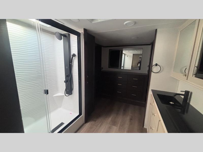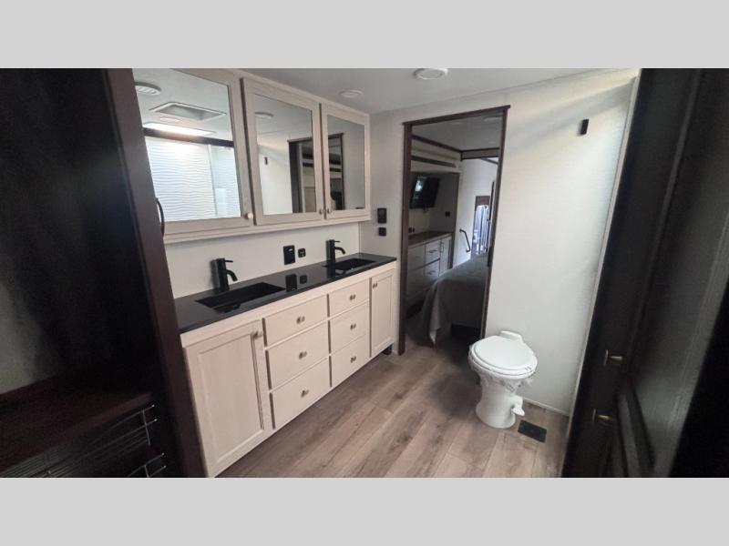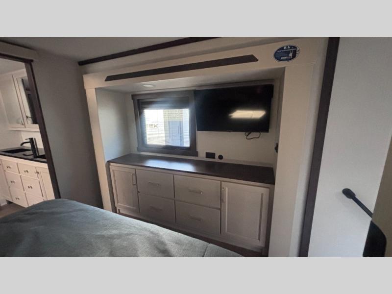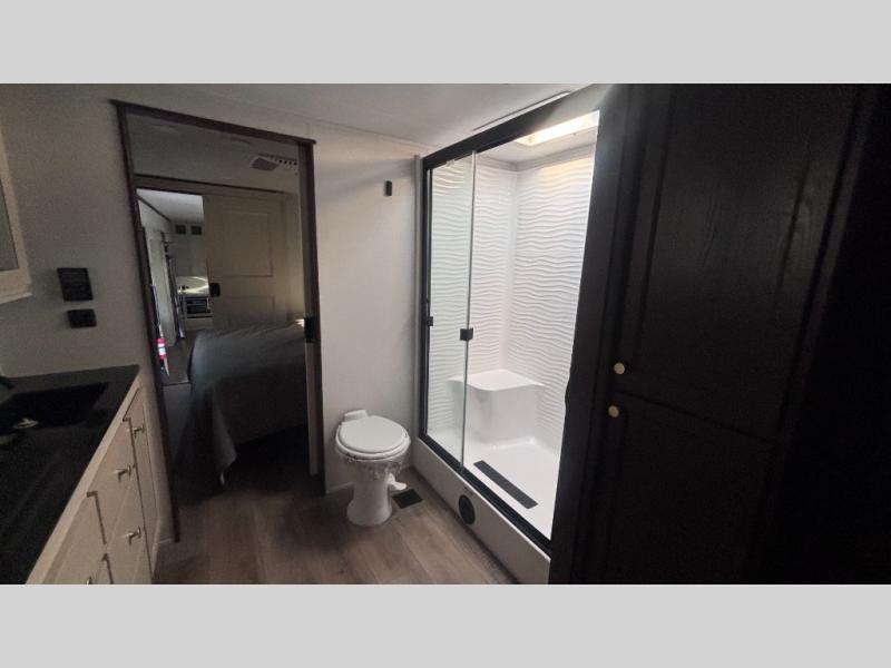 With any Cedar Creek fifth wheel by Forest River, you will find a quality-built RV with your comfort in mind! The all-aluminum super structure on 16" centers or less will provide a solid foundation to your fifth wheel, and the 3M bonded sidewalls will hold up and provide resistance to UV, heat, cold moisture, and even highway chemicals. Each model also includes a Road Warrior suspension for smooth towing, a 6-Point Hydraulic, GEN 3 Leveling System, and a new 101" wide body frame. Inside, you'll enjoy walnut/two tone wooden cabinetry with hidden hinges, cutting board drawer with cut-out trash funnel, motion lighting in the bath and bedroom closet, plus many more comforts. The New Travelfi™ Pay-as-you go internet provides the ability to bring your own internet rather than relying solely on campground WiFi, and the "Rich Solar" 200W solar panel will give you off-grid capabilities!