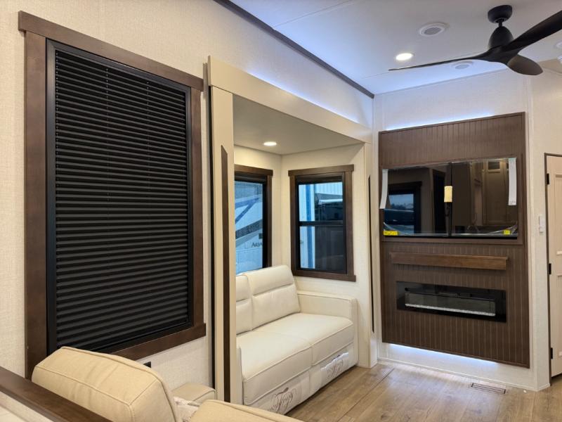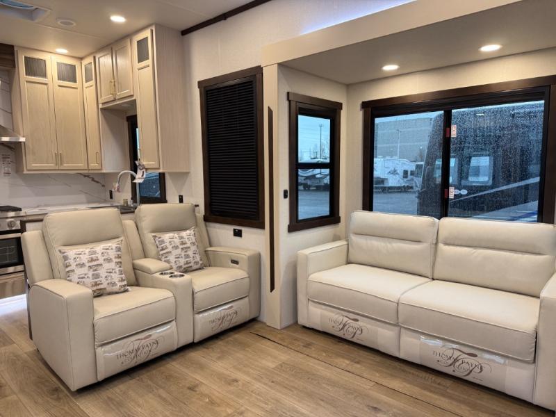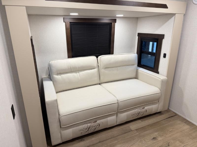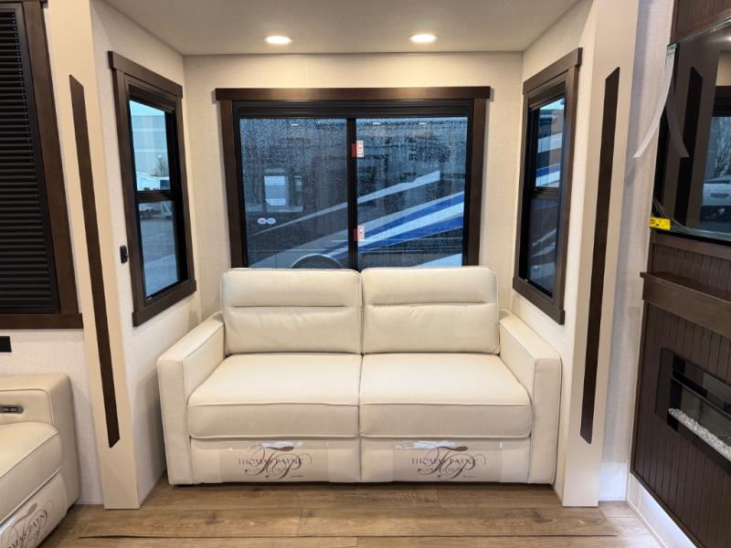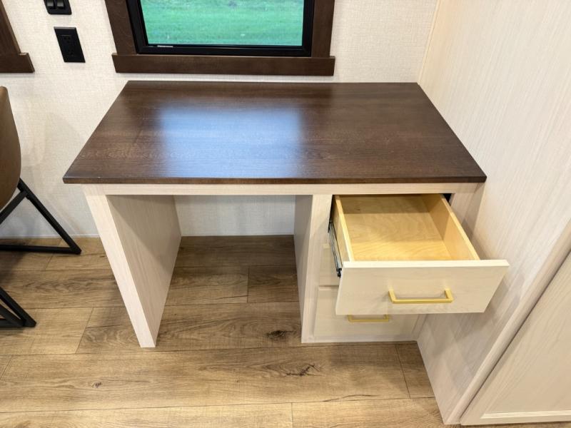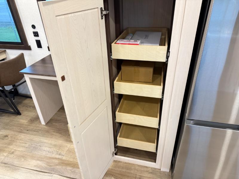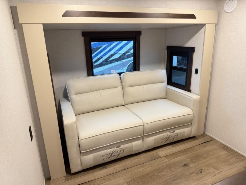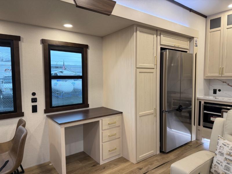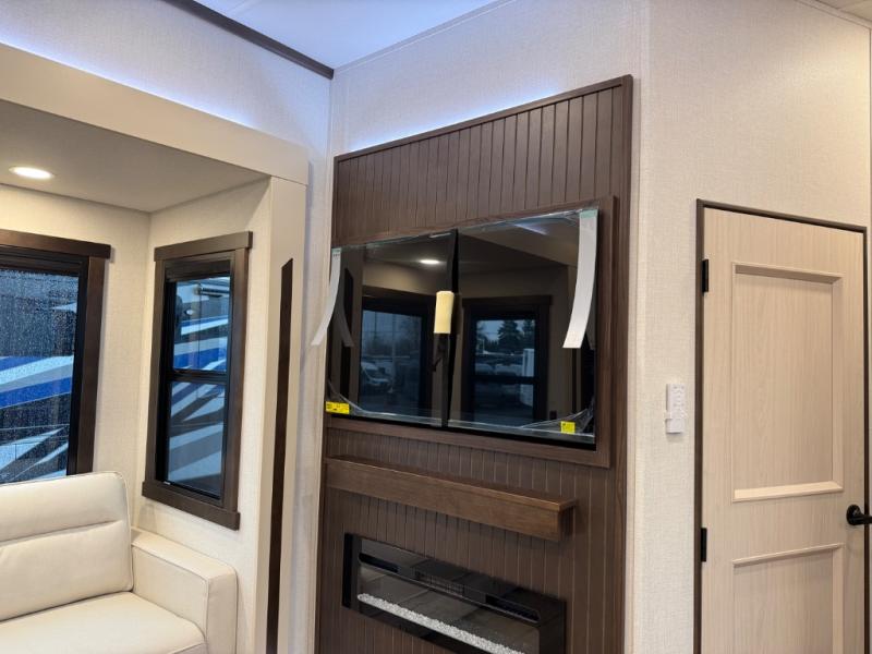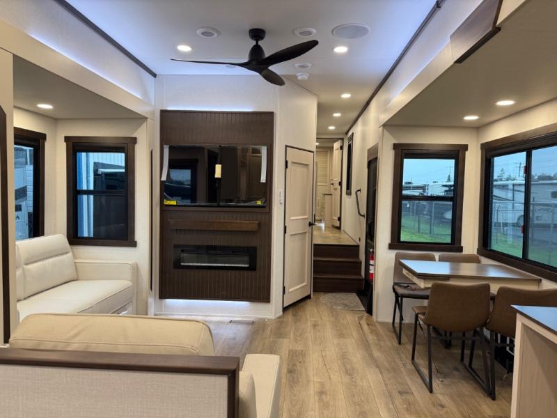At the front of the 39RKB fifth wheel, you’ll find the main bedroom featuring a king bed in a slide-out for a restful night’s sleep. This area also includes a large wardrobe with shelves and a dresser topped with a TV, offering plenty of storage for clothing and personal essentials. Moving down the hall, the full bathroom provides a touch of comfort and convenience with a shower featuring an upgraded shower head, an 18" high porcelain toilet with a top circular flush system, and linen shelves for added storage. In the center, a versatile middle room offers additional sleeping space with a 66" hide-a-bed sofa and a closet for extra storage, perfect for accommodating guests. Toward the rear, the living area and kitchen create a warm, inviting space for relaxation and entertainment. The living room includes another hide-a-bed sofa in one slide-out for both lounging and sleeping, complemented by a power theater seat for additional comfort. Across the room, the TV and fireplace make it an ideal spot for cozy movie nights. The opposite slide-out houses a dining table with chairs and a bench for shared meals or game nights, along with a 24" x 36" desk for a convenient work area. This same slide also features a 20-cu. ft. stainless steel refrigerator and a pantry to keep groceries and dry goods organized. At the very rear, the U-shaped kitchen boasts abundant overhead cabinets, a three-burner gas range, and a stainless-steel sink, providing an efficient and functional layout for all your cooking needs.