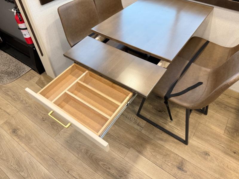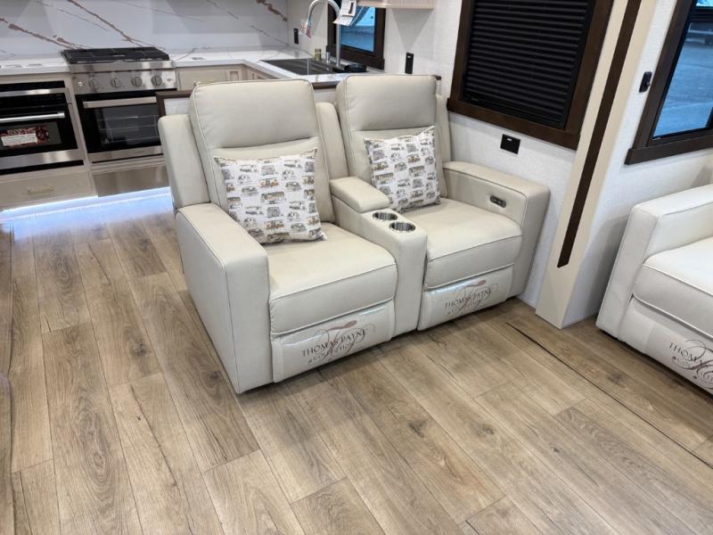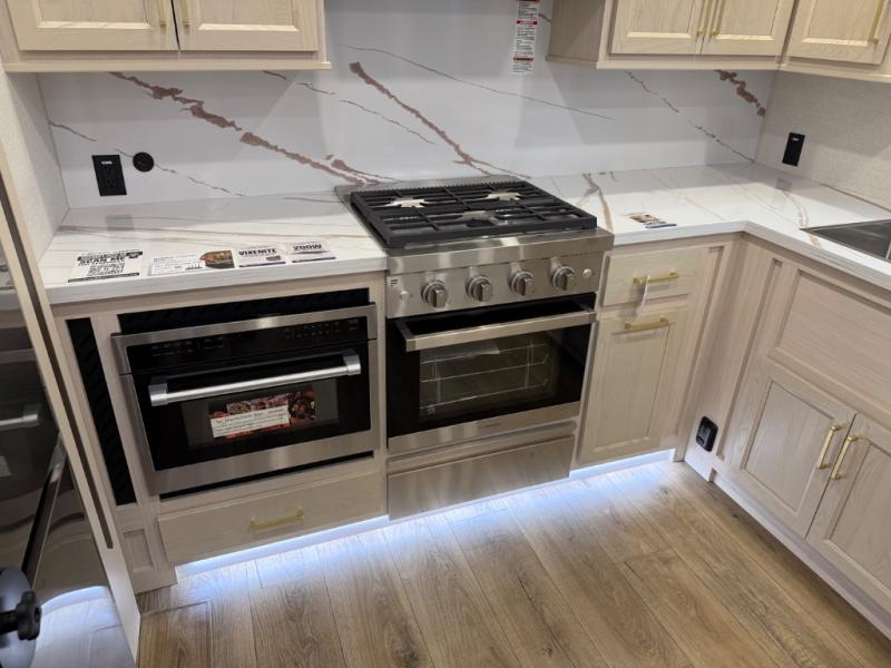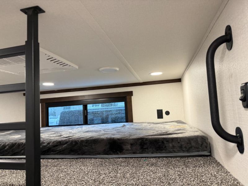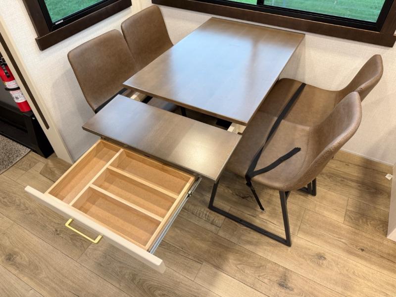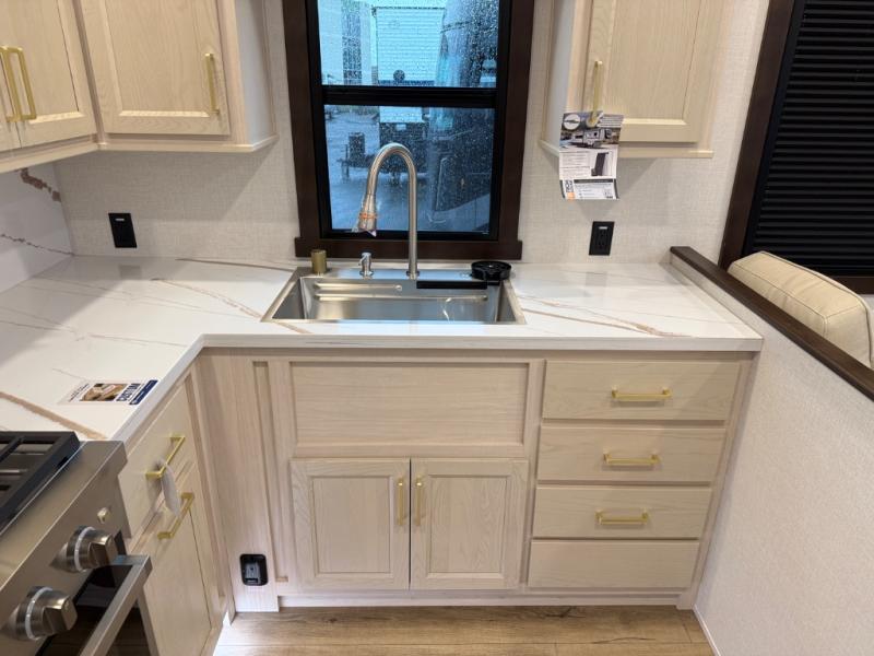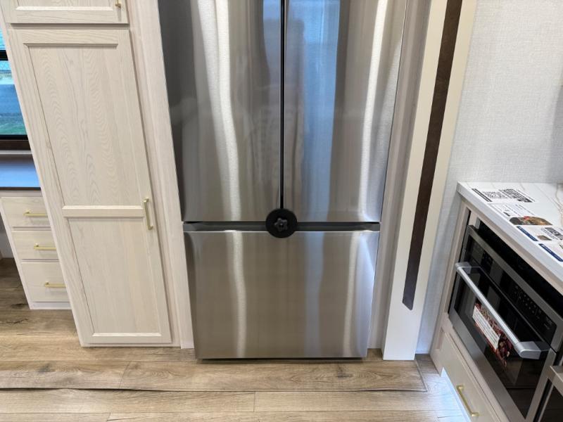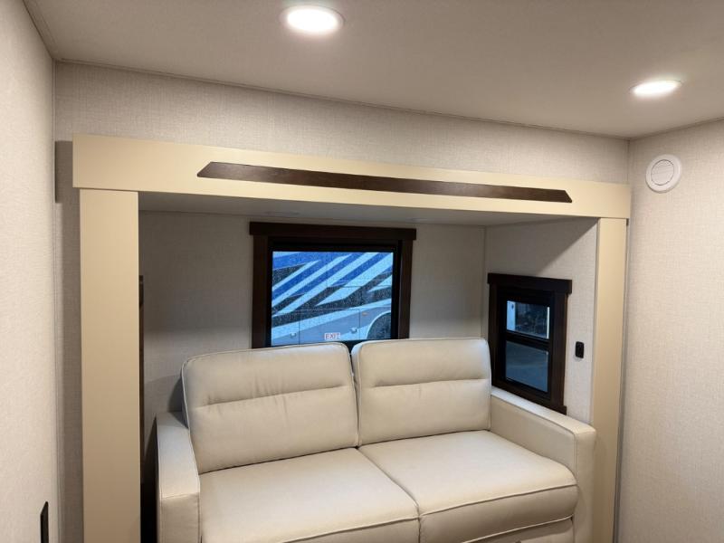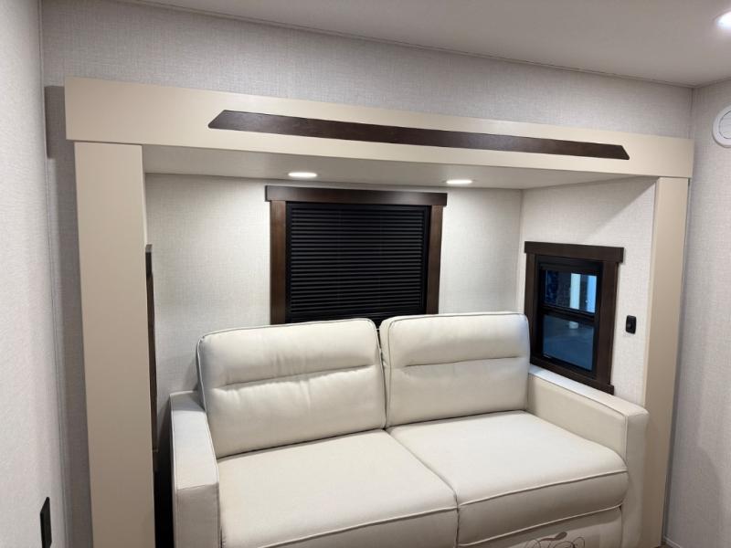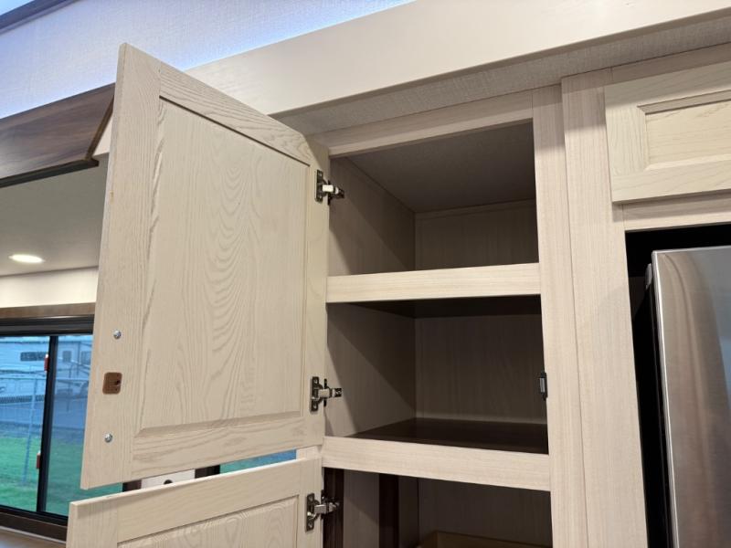 At the front of the 39RKB fifth wheel, you’ll find the main bedroom featuring a king bed in a slide-out for a restful night’s sleep. This area also includes a large wardrobe with shelves and a dresser topped with a TV, offering plenty of storage for clothing and personal essentials. Moving down the hall, the full bathroom provides a touch of comfort and convenience with a shower featuring an upgraded shower head, an 18" high porcelain toilet with a top circular flush system, and linen shelves for added storage. In the center, a versatile middle room offers additional sleeping space with a 66" hide-a-bed sofa and a closet for extra storage, perfect for accommodating guests. Toward the rear, the living area and kitchen create a warm, inviting space for relaxation and entertainment. The living room includes another hide-a-bed sofa in one slide-out for both lounging and sleeping, complemented by a power theater seat for additional comfort. Across the room, the TV and fireplace make it an ideal spot for cozy movie nights. The opposite slide-out houses a dining table with chairs and a bench for shared meals or game nights, along with a 24" x 36" desk for a convenient work area. This same slide also features a 20-cu. ft. stainless steel refrigerator and a pantry to keep groceries and dry goods organized. At the very rear, the U-shaped kitchen boasts abundant overhead cabinets, a three-burner gas range, and a stainless-steel sink, providing an efficient and functional layout for all your cooking needs.