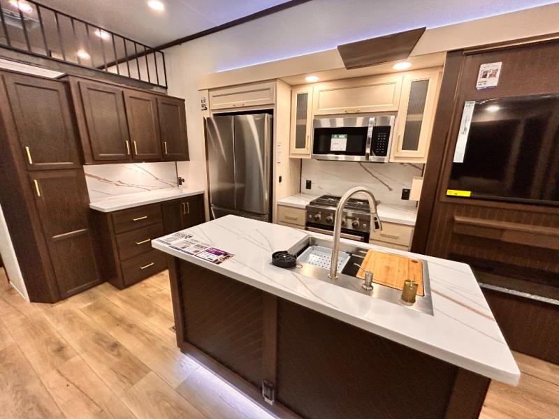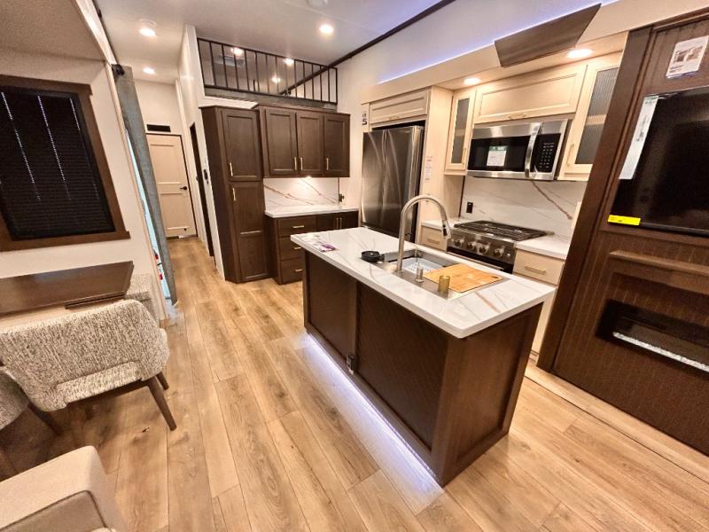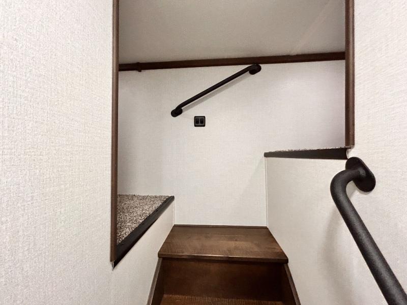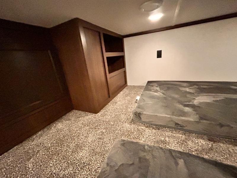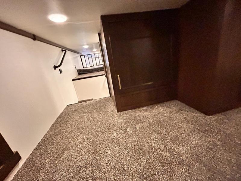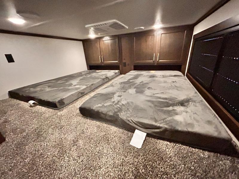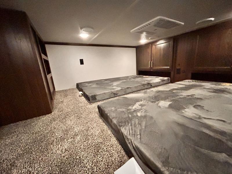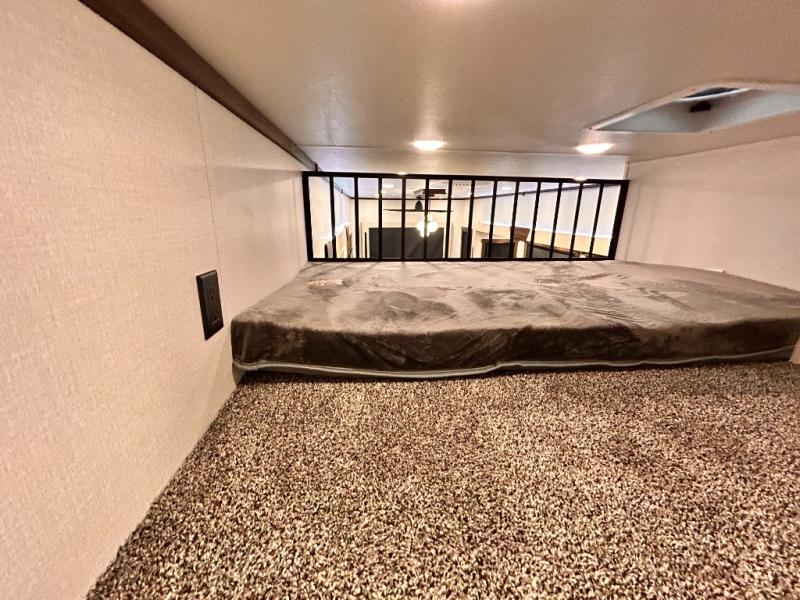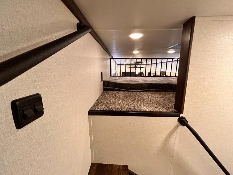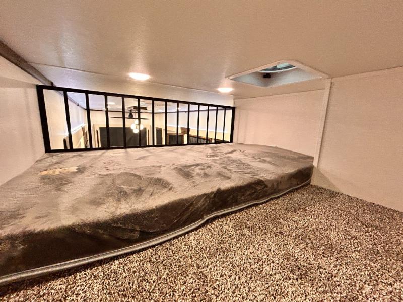 The star feature of this Cedar Creek Cottage destination trailer is the huge loft area. Take the stairs up to the loft to see the three bunk mats and wardrobe. There is also a railing that helps prevent anyone from falling off the edge. The rear private bedroom offers you a king bed slide for the most comfort, and there is also a dresser that you can use to store clothing in. The full bathroom comes with a 30" x 48" fiberglass shower with seat, and a large vanity. You will also have a fully equipped kitchen featuring a pantry, 20 cu. ft. 110 volt refrigerator, 30” stainless steel microwave, and a beautiful island with a solid surface counter.