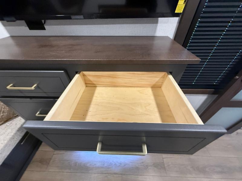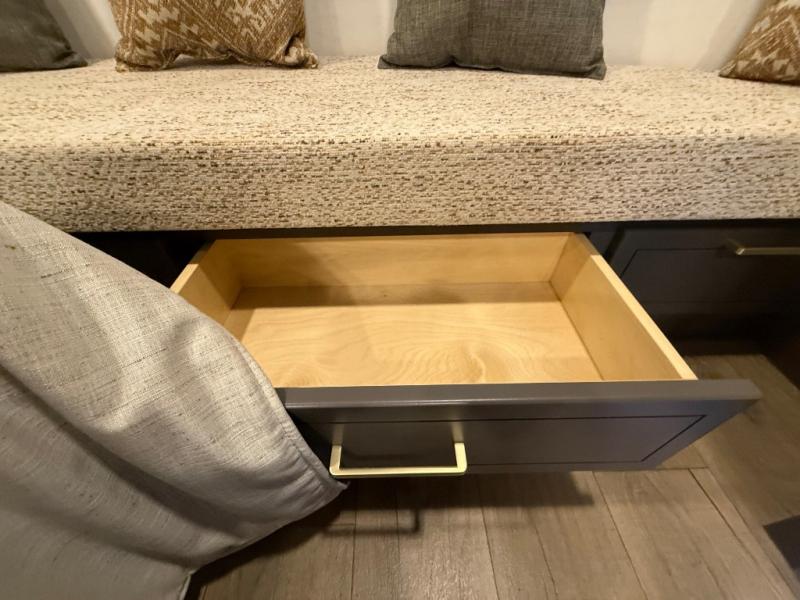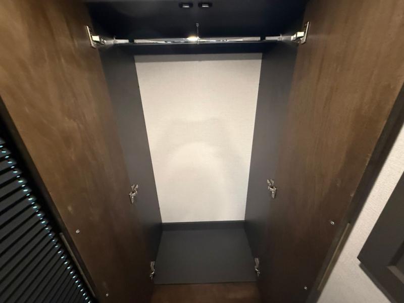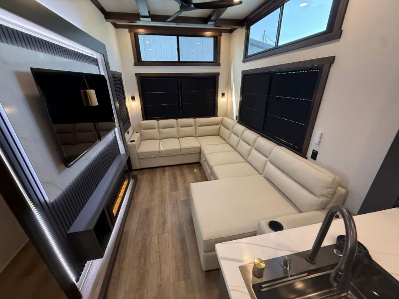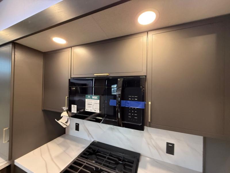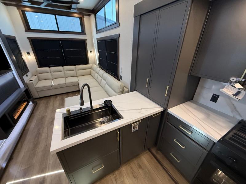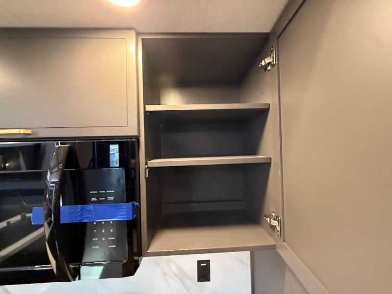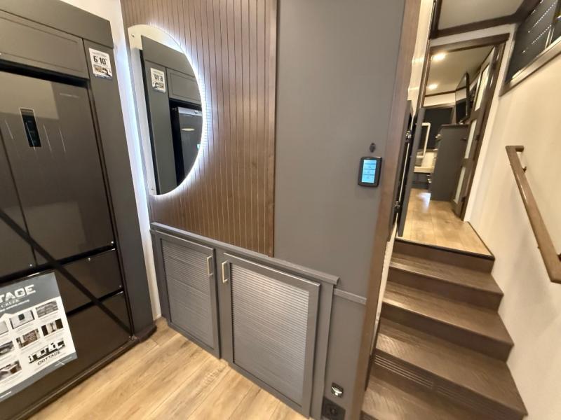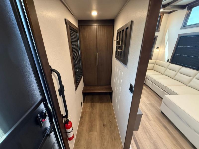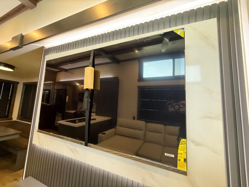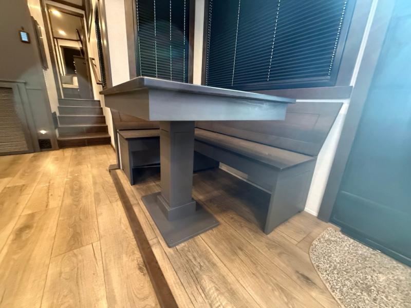 The rear living room is a spacious retreat, featuring a comfortable sectional sofa and a flip desk perfect for working or relaxing. Unwind with a glass of wine at the wine bar, or cozy up by the fireplace while enjoying your favorite show on the TV. The mud room is a practical and convenient feature, perfect for storing gear, boots, and jackets. The kitchen is fully equipped with overhead cabinets, a microwave, a refrigerator, and a table with swivel chairs, providing a comfortable spot to enjoy meals with family and friends. The full bathroom features an ample shower, providing plenty of space to get ready for the day, while the front bedroom is the perfect spot to relax and recharge after a long day of exploring, featuring a king bed, closet, and dresser.