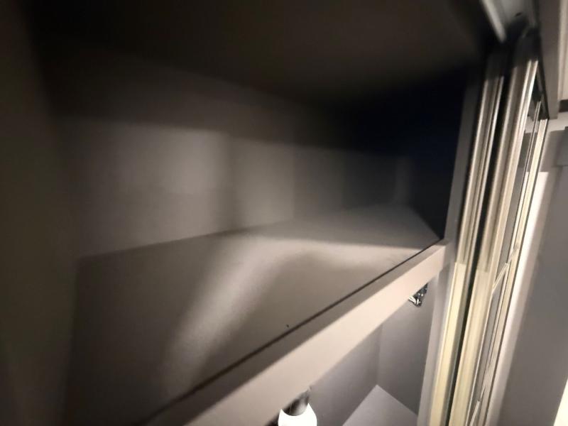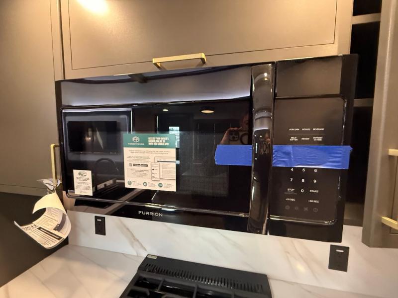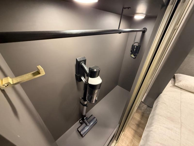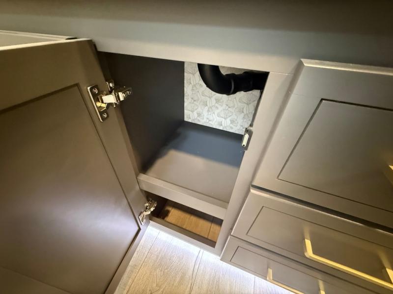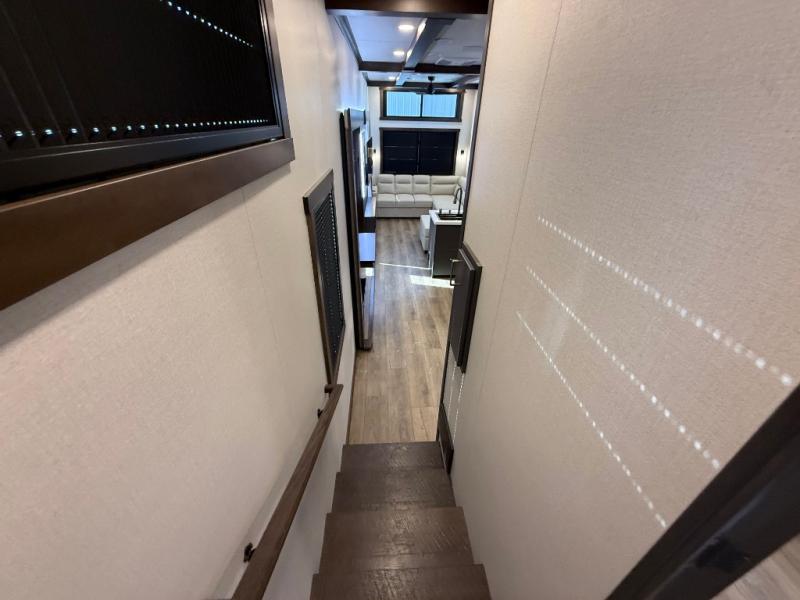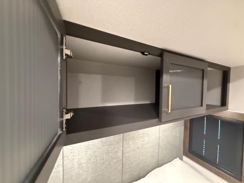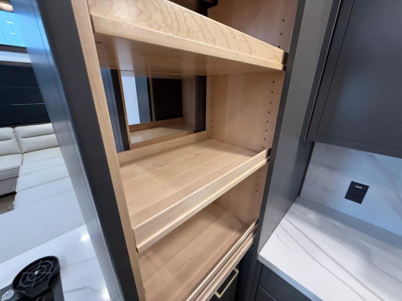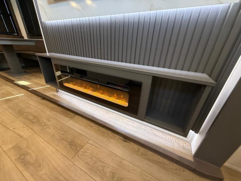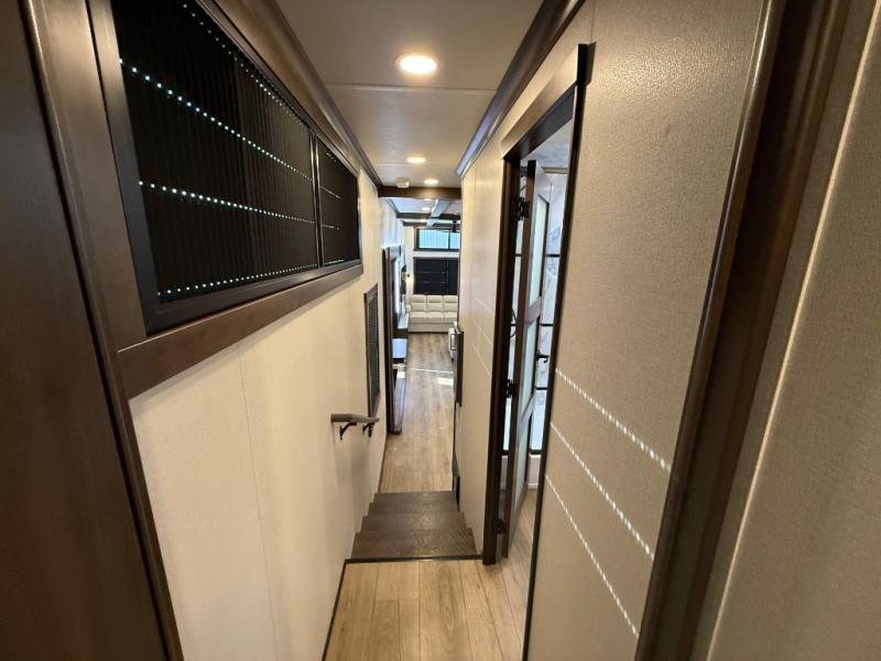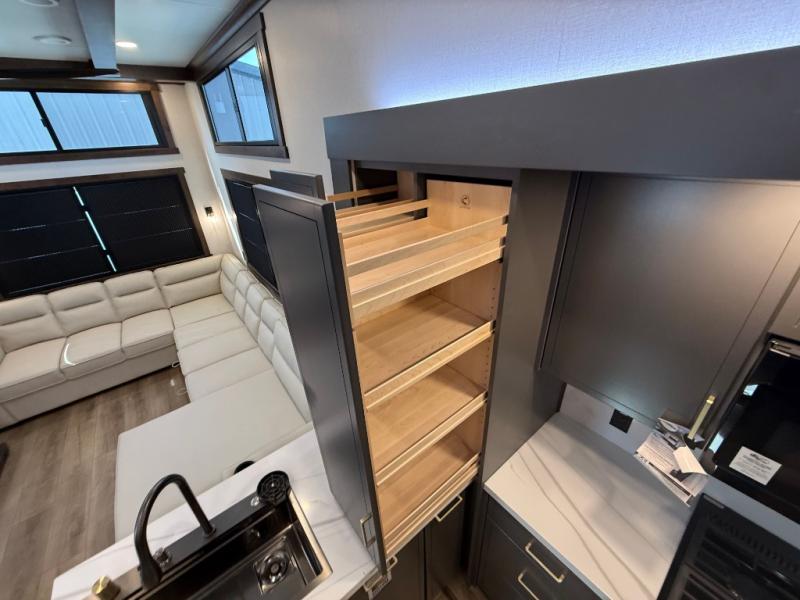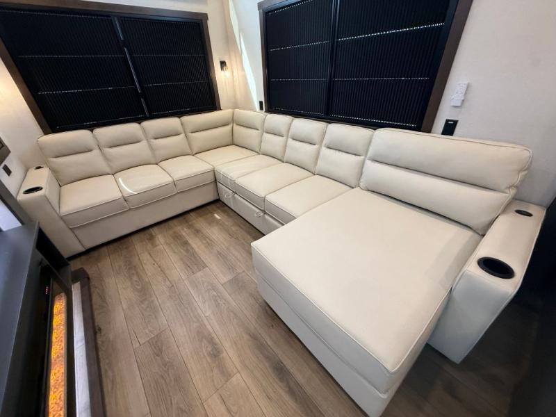 The rear living room is a spacious retreat, featuring a comfortable sectional sofa and a flip desk perfect for working or relaxing. Unwind with a glass of wine at the wine bar, or cozy up by the fireplace while enjoying your favorite show on the TV. The mud room is a practical and convenient feature, perfect for storing gear, boots, and jackets. The kitchen is fully equipped with overhead cabinets, a microwave, a refrigerator, and a table with swivel chairs, providing a comfortable spot to enjoy meals with family and friends. The full bathroom features an ample shower, providing plenty of space to get ready for the day, while the front bedroom is the perfect spot to relax and recharge after a long day of exploring, featuring a king bed, closet, and dresser.