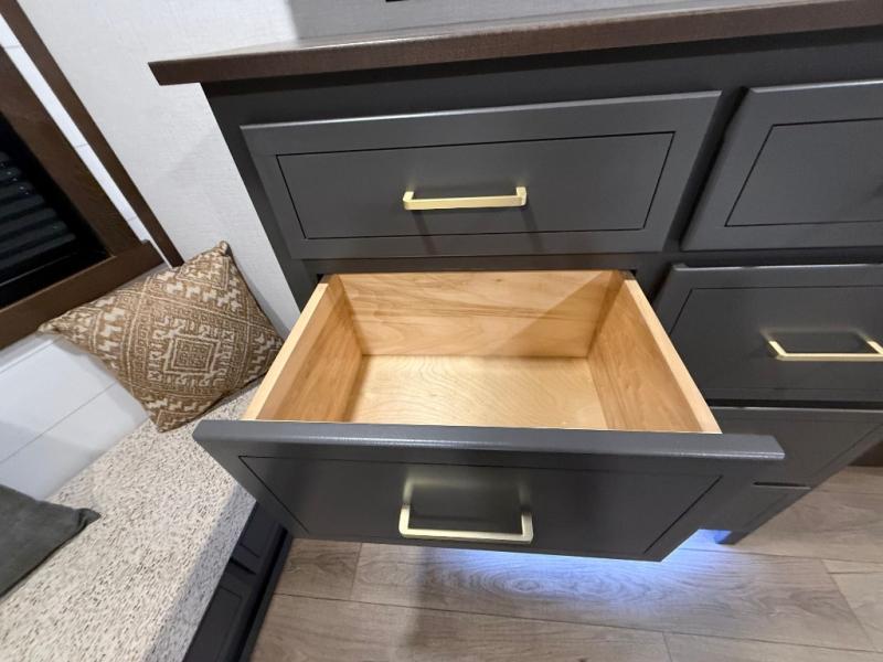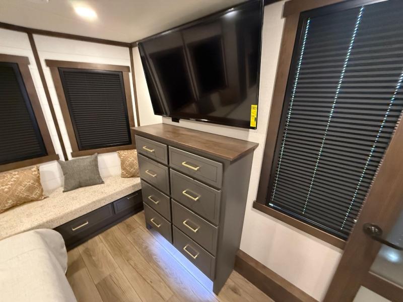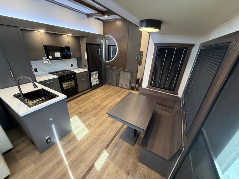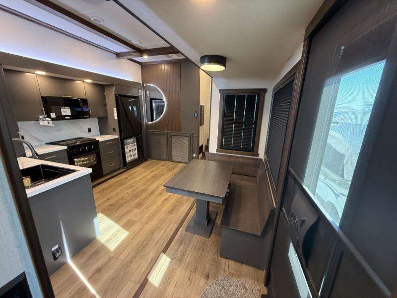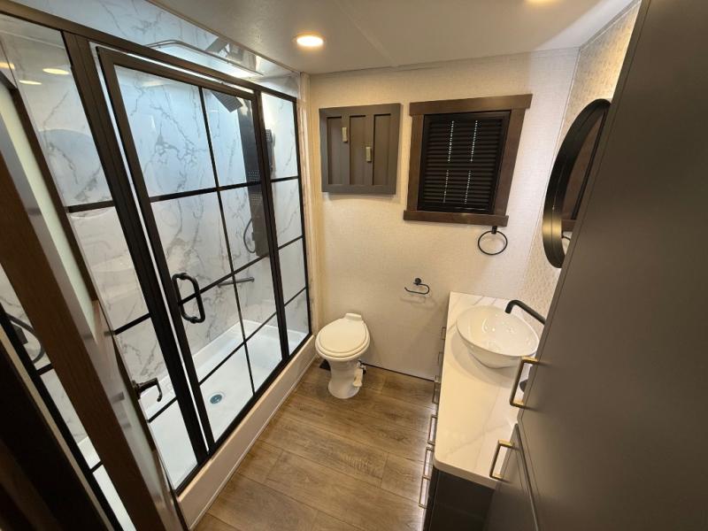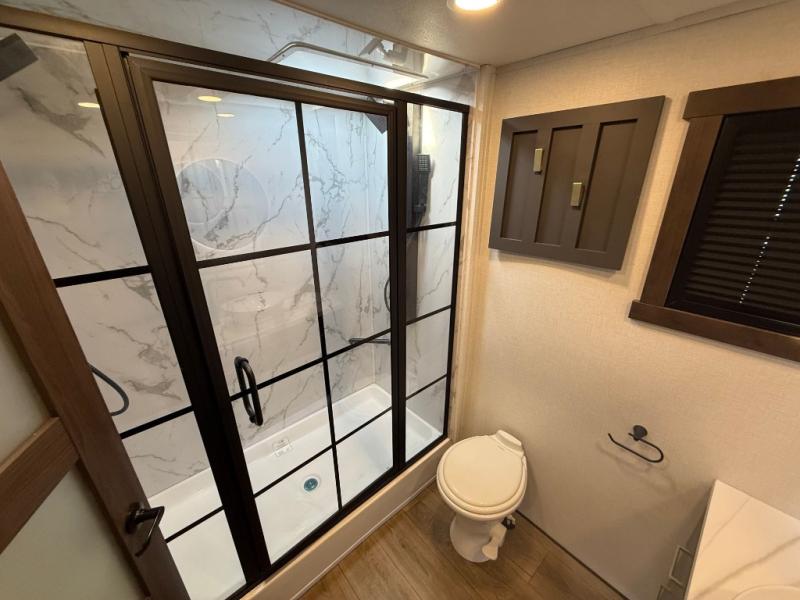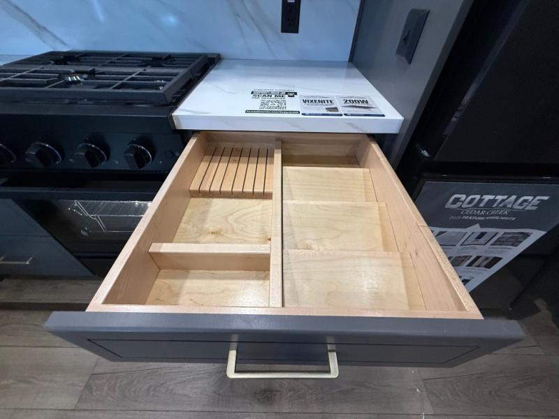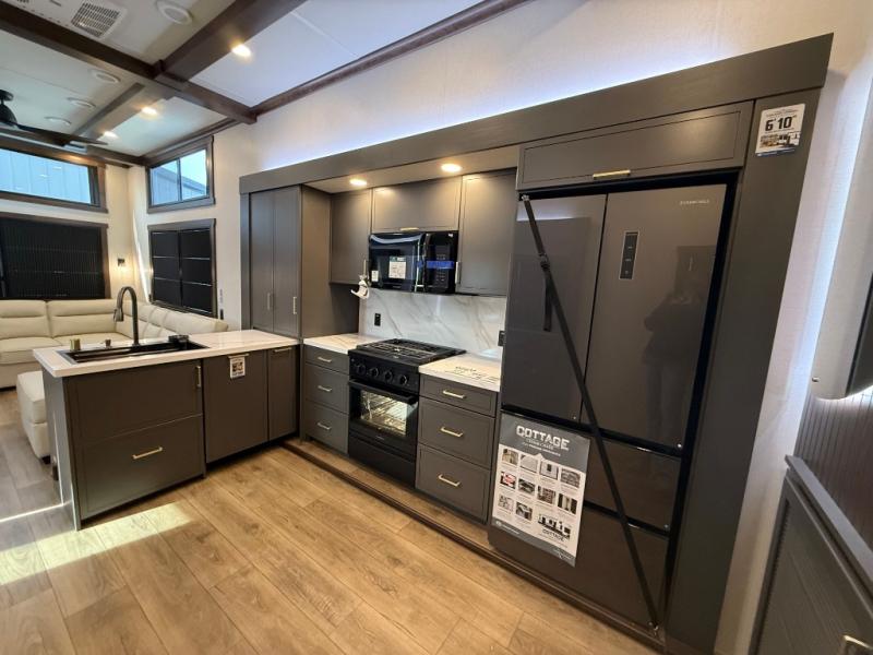 Hop on new adventures with the Forest River Cedar Creek Cottage Fifth Wheels! Each destination fifth wheel features a 101" wide body frame that provides a sturdy foundation for your adventures, while the AlphaPly TPO roof membrane offers superior durability and weather resistance. Plus, the 3M Bonded Sidewalls add an extra layer of protection and strength, and the hydraulic front jacks make setting up camp a breeze. In the luxurious interiors, the vinyl floor covering is easy to clean, and the Vixeinite flush floor slides in the kitchen and living area provide a seamless transition between the floor and the slide-outs. In addition, the 52" ceiling fan in the living room circulates air and adds to the spacious feel, and the kitchen island is a standout feature, boasting a solid surface counter, a flush-mount sink, and a stainless-steel design. You'll feel like you're cooking at home! Finally, the USB ports in the bathroom ensure you can keep your devices charged and within reach, even in the most convenient places.
