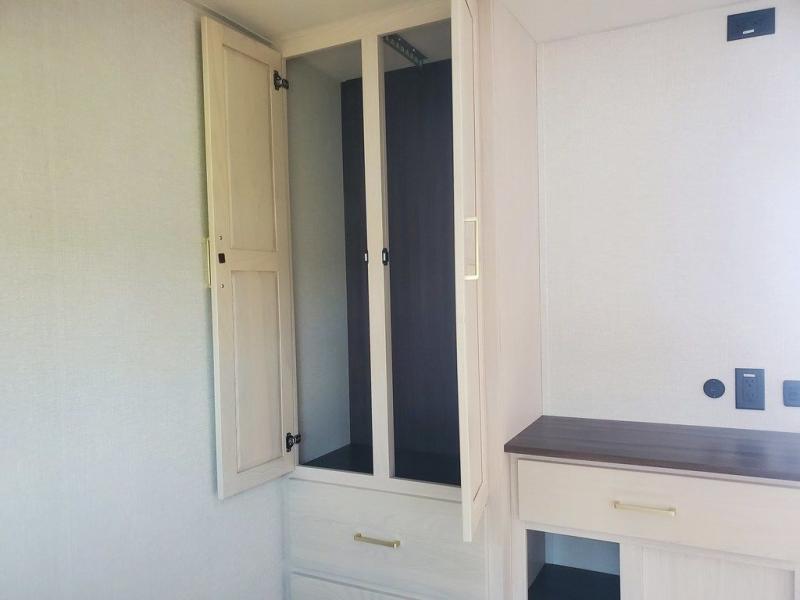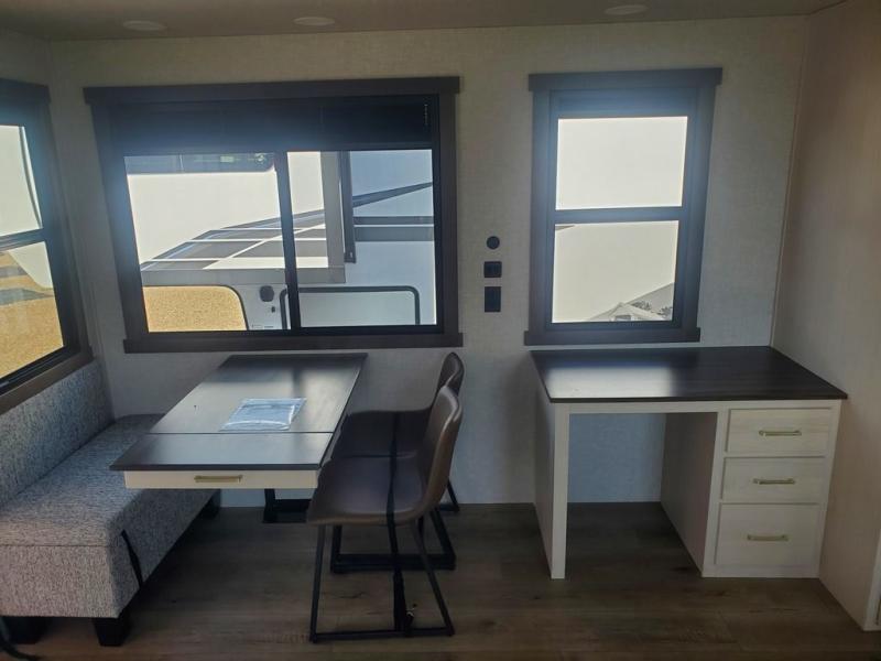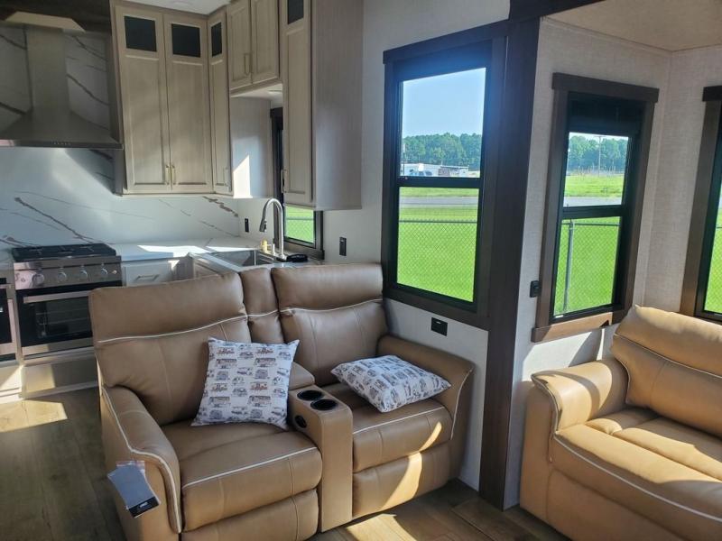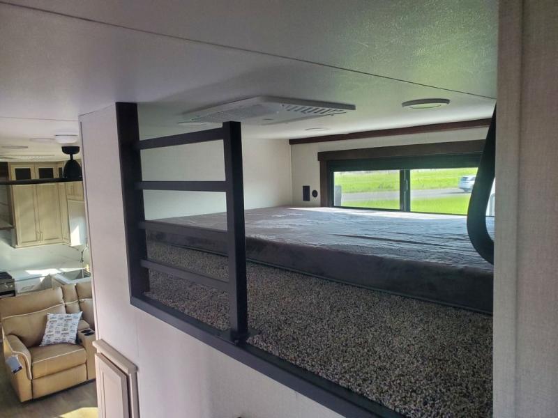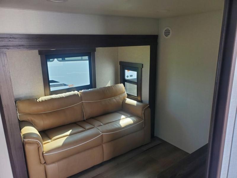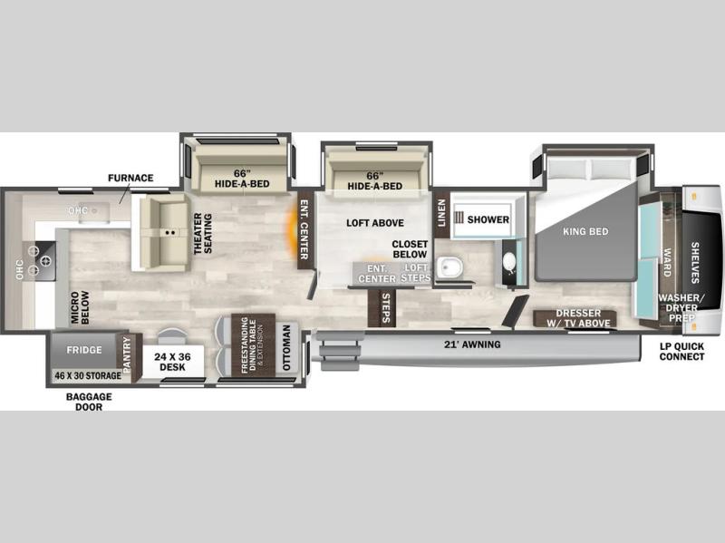 A front kitchen with ample counter space, a middle den, and a front bedroom make this fifth wheel one to remember! The living area will be a favorite spot to visit together since there is a hide-a-bed sofa and theater seating, plus an entertainment center with a fireplace. There is also a free-standing dining table and a desk with a chair if you need to telecommute. Your guests will love the middle den with a hide-a-bed sofa and a closet for their things, plus there is a loft above this room for added sleeping or storage space. A spacious full bath includes a shower with a seat, and the king bed slide out in the front private bedroom is sure to bring a great night's rest.