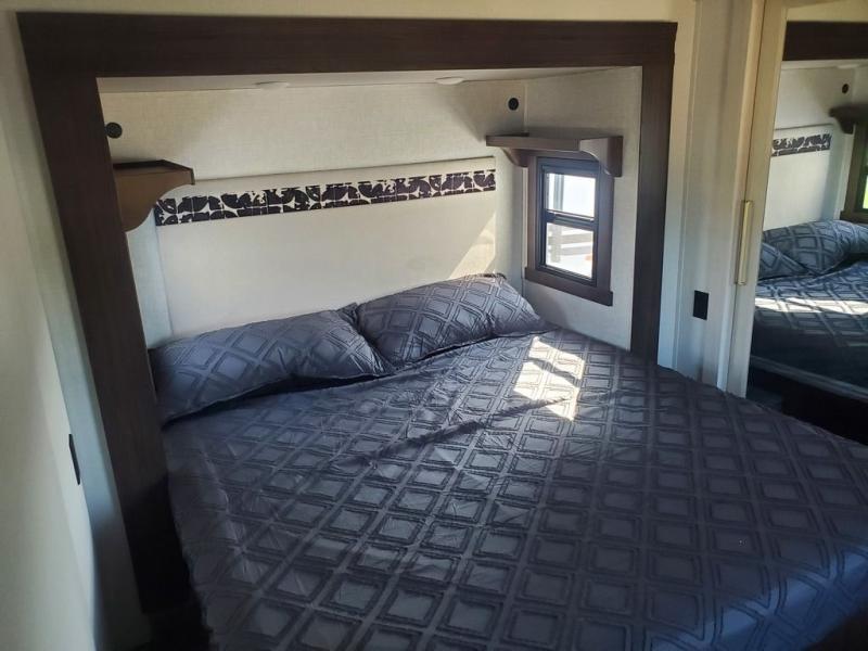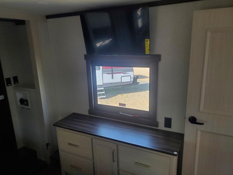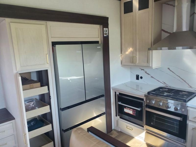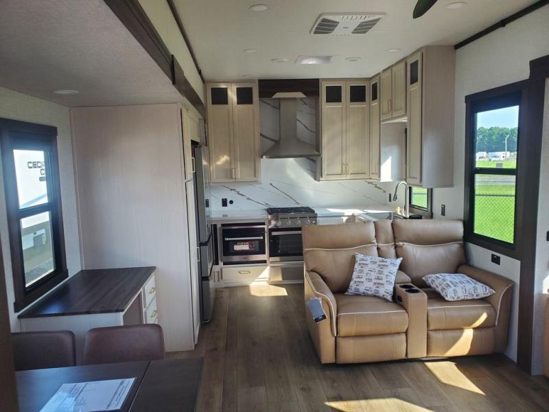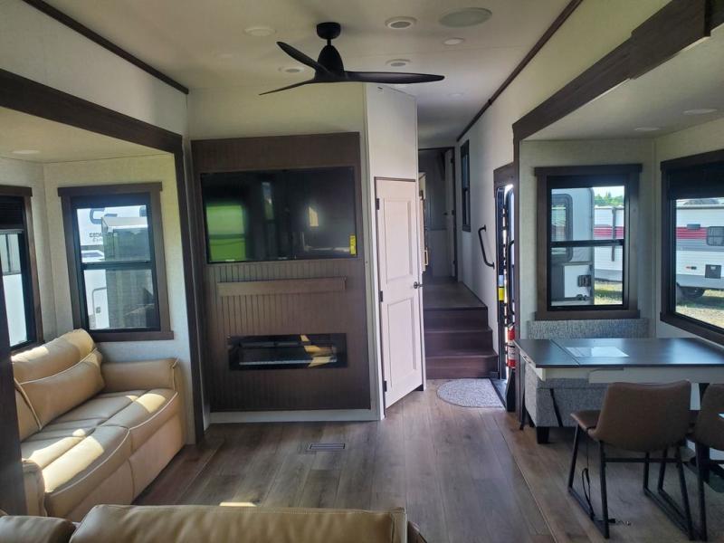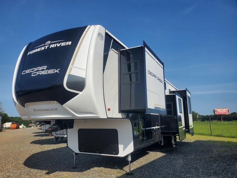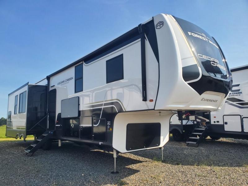 With any Cedar Creek Experience fifth wheel by Forest River, you will bet met with luxury features both inside and out! The True Gelcoat exterior is the best of the best in exteriors and the 3M bonded sidewalls will hold up over years of use. There is also a new 101'' wide-body frame, a Road Warrior suspension, plus a TST tire pressure monitoring system to make towing that much easier. You will find a hidden front storage compartment, along with a 4' x 6' ABS, ribbed, removable underbelly panels, and 6-point hydraulic leveling system, plus many more exterior conveniences. The interior will have you feeling like you haven't left home with vinyl floor coverings, power theater seating with USB ports, a cozy fireplace, vinyl floor covering and the list of comforts goes on! Each model is also pre-wired for satellite to the roof, and you're sure to never go bored with a Smart TV in the bedroom!
