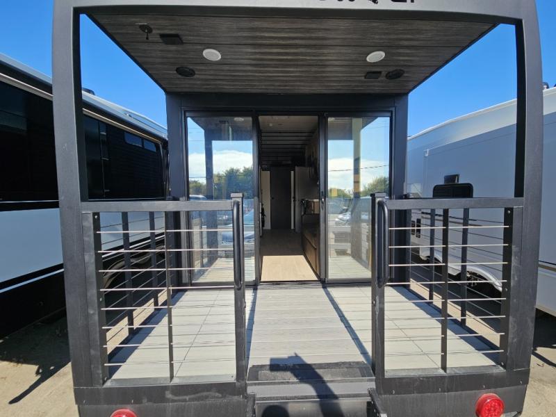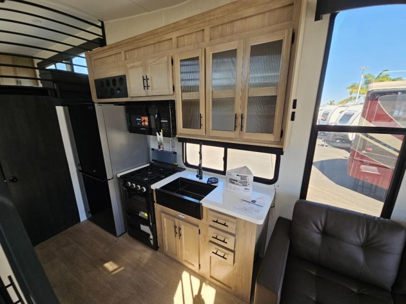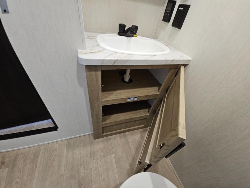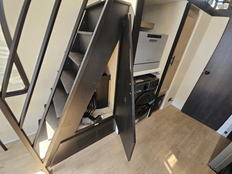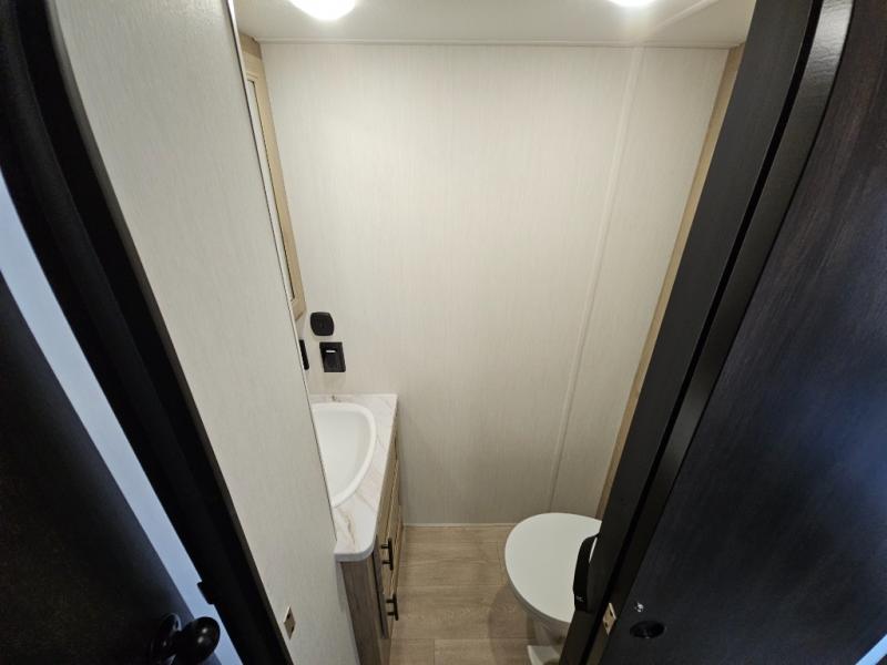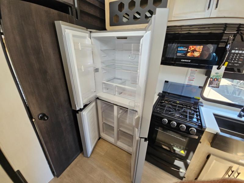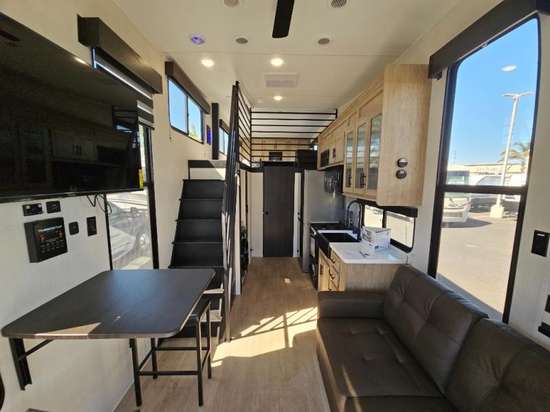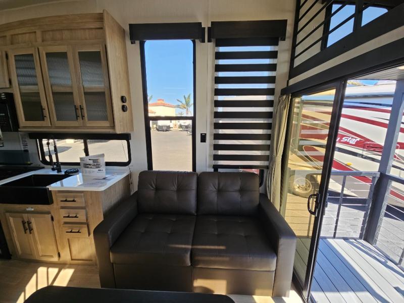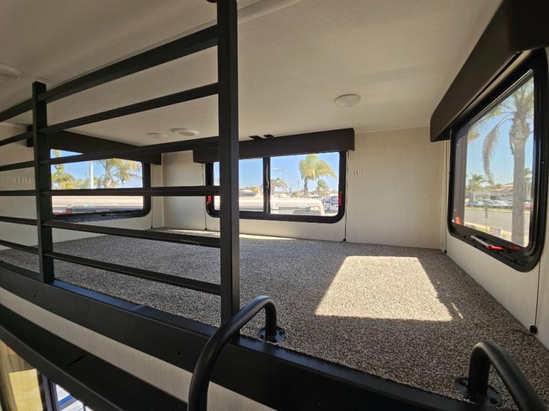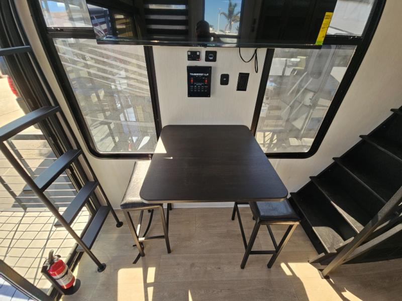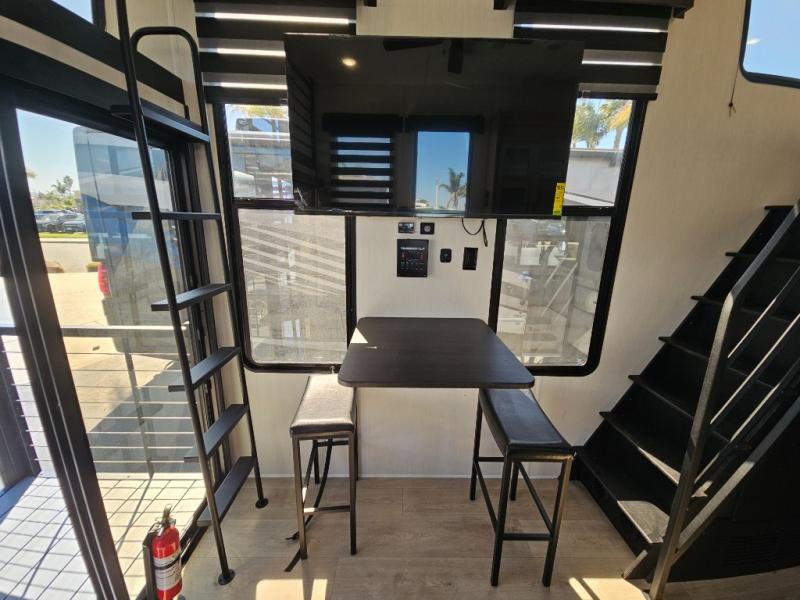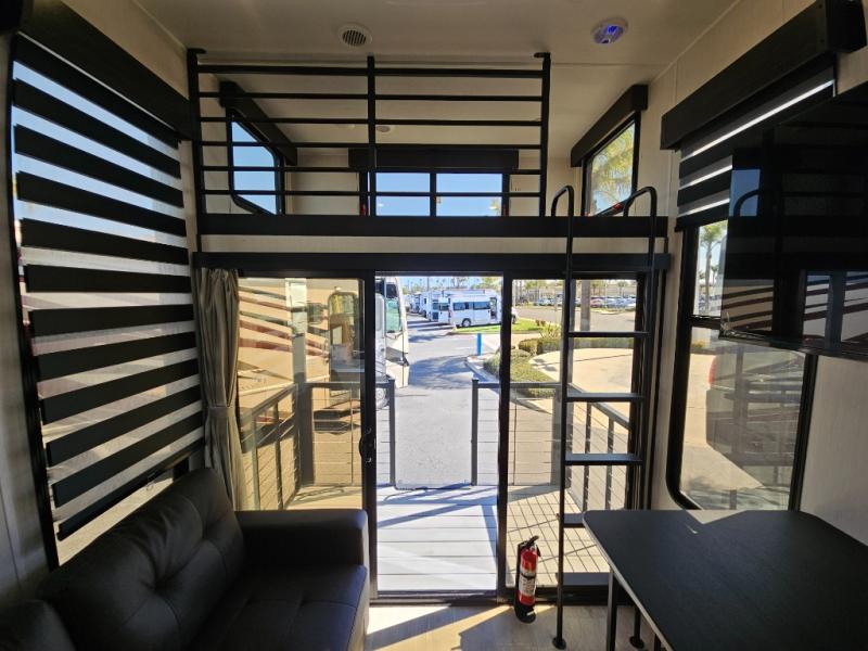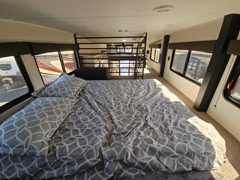 This model is similar to 16ML but larger! A bigger bathroom, RV king bed in the lower master, and a queen bed plus a twin bunk mat in the front loft. And the second loft can be utilized as extra sleeping space or storage space! There is an 18 cu. ft. refrigerator so you can stock up for a week long vacation, a hide-a-bed sofa that can transform into added sleeping for guests, and a high top table with two stools to dine at. The bathroom below is split with a shower on one side, and a private toilet area and sink opposite. And the view is amazing from just about anywhere inside.
