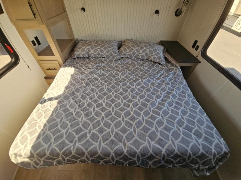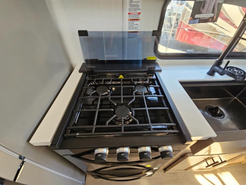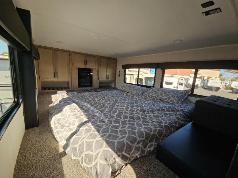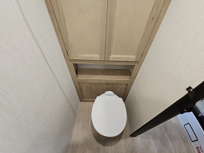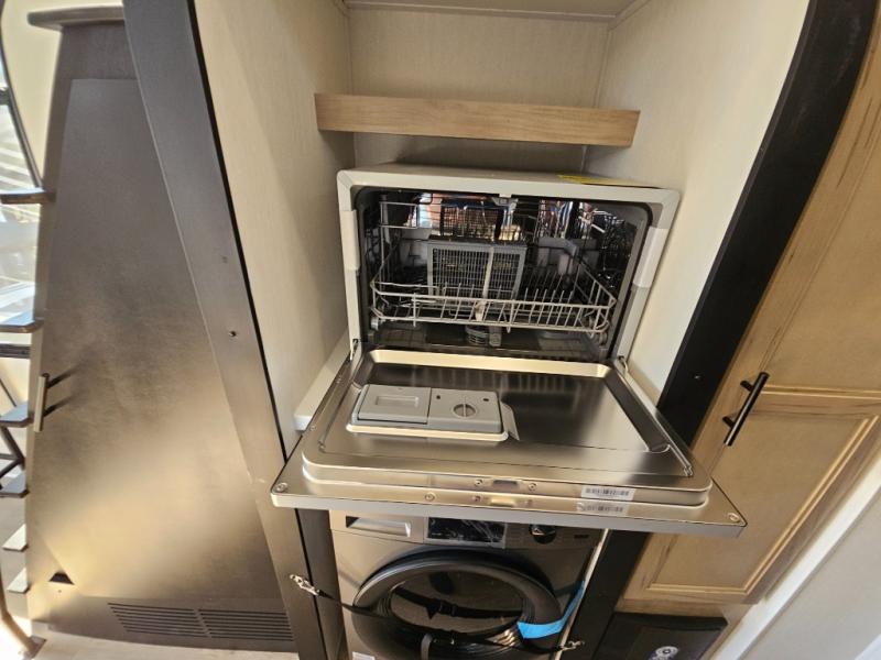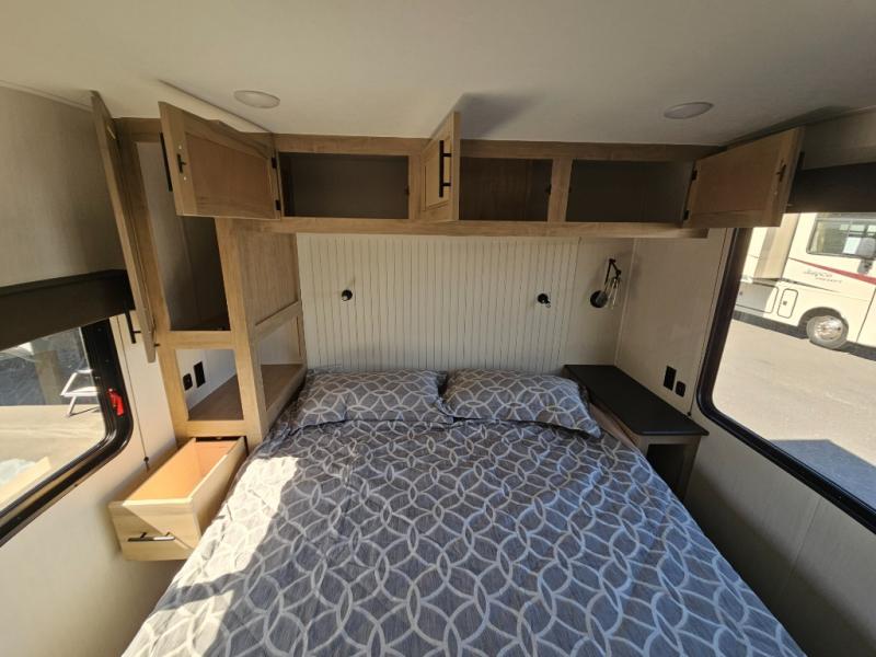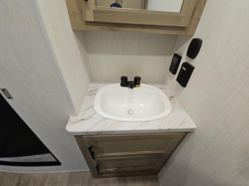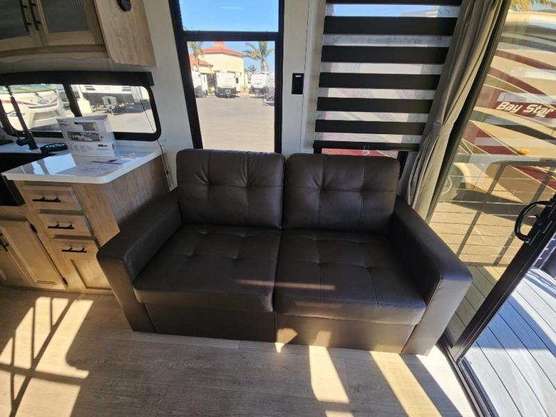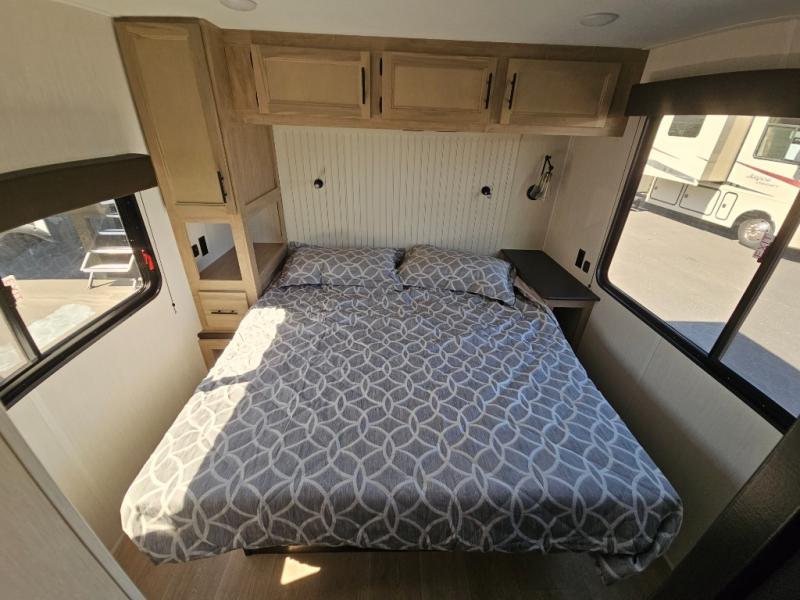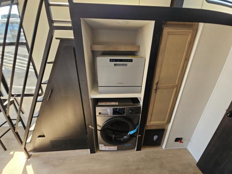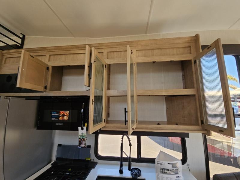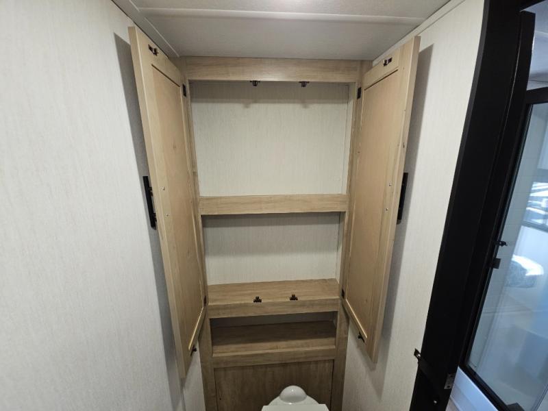 This model is similar to 16ML but larger! A bigger bathroom, RV king bed in the lower master, and a queen bed plus a twin bunk mat in the front loft. And the second loft can be utilized as extra sleeping space or storage space! There is an 18 cu. ft. refrigerator so you can stock up for a week long vacation, a hide-a-bed sofa that can transform into added sleeping for guests, and a high top table with two stools to dine at. The bathroom below is split with a shower on one side, and a private toilet area and sink opposite. And the view is amazing from just about anywhere inside.
