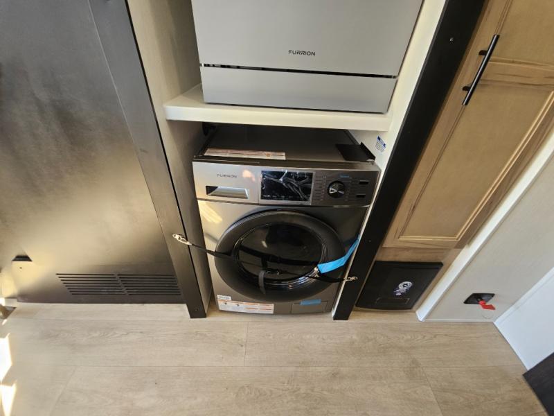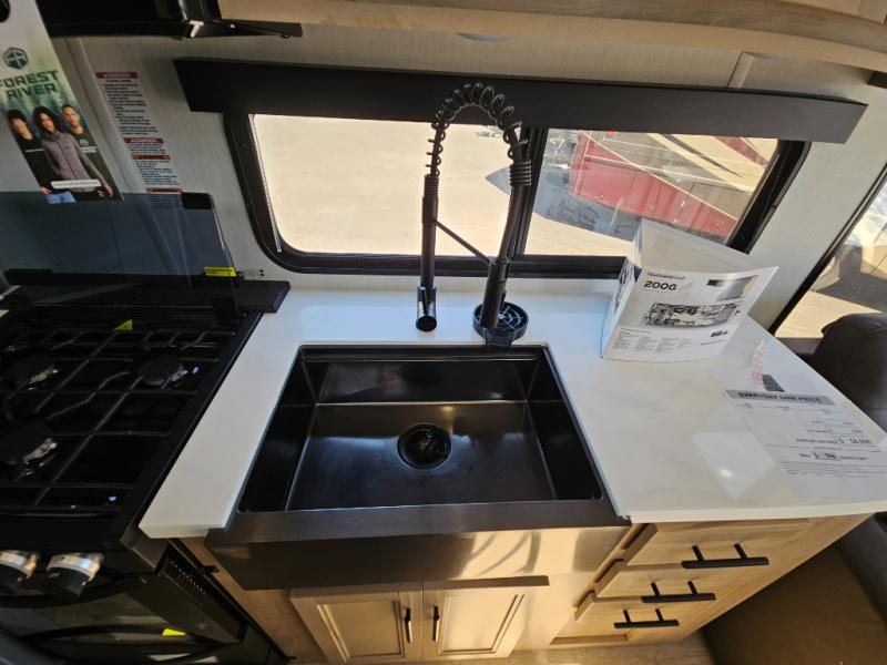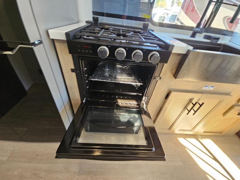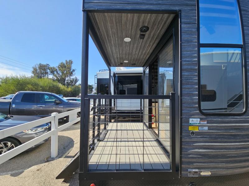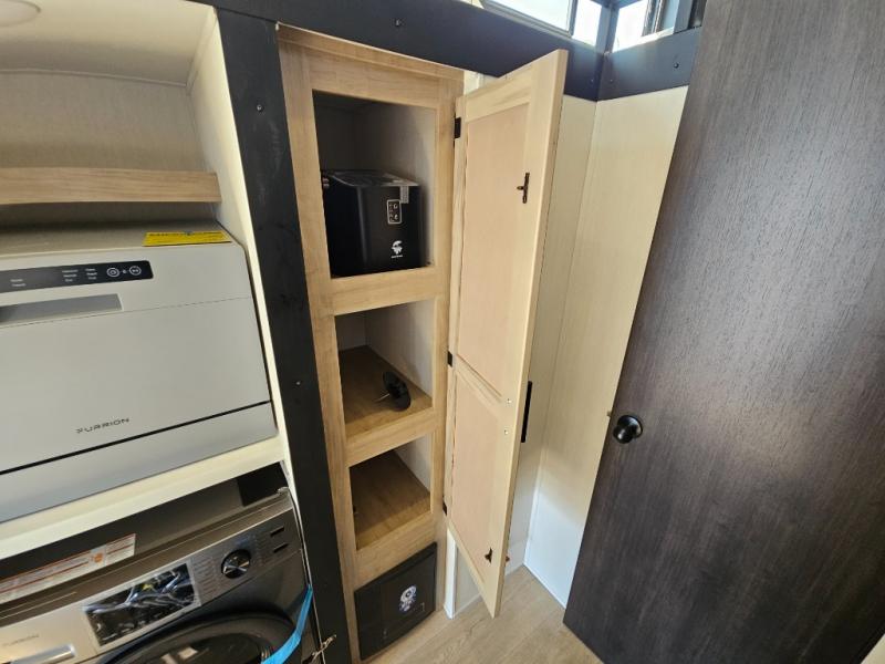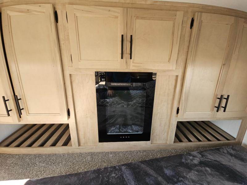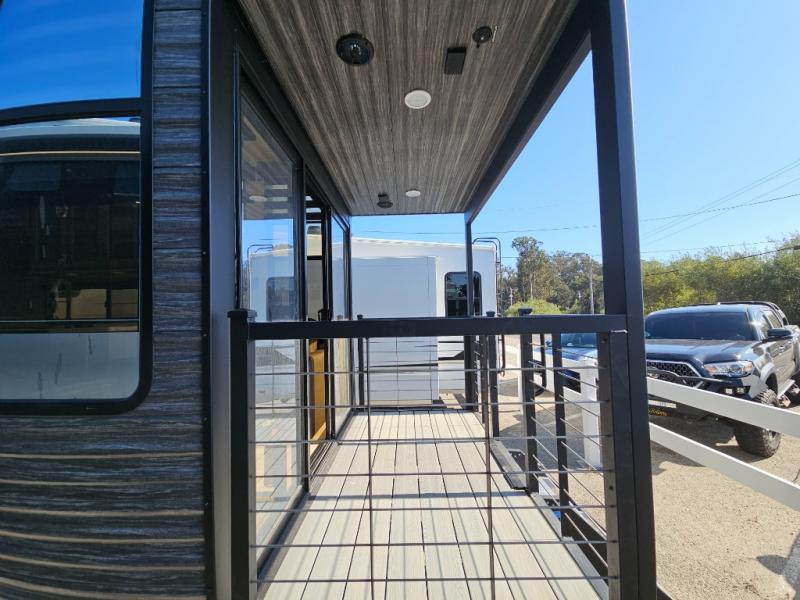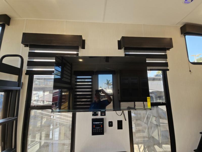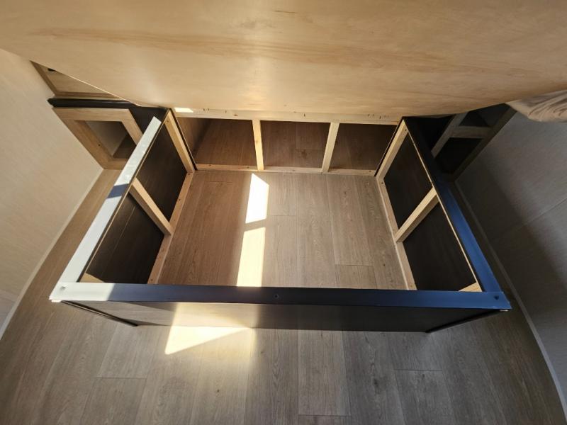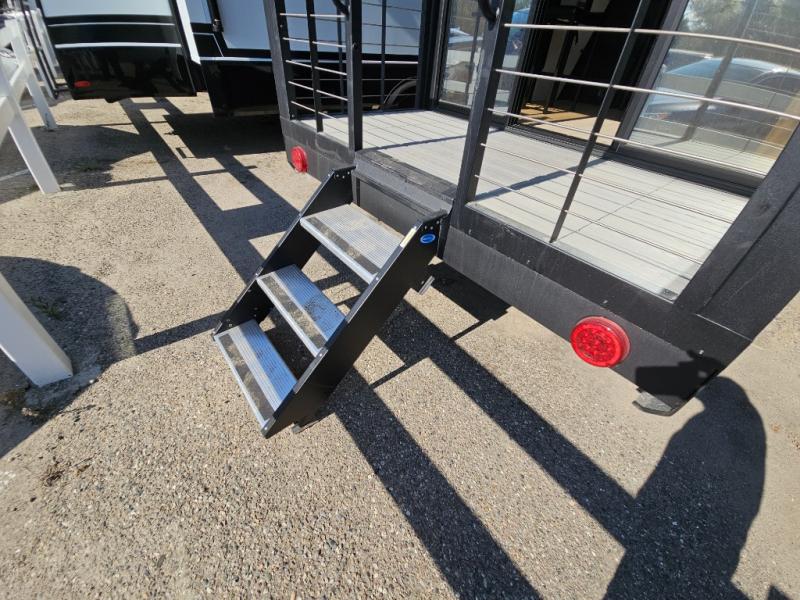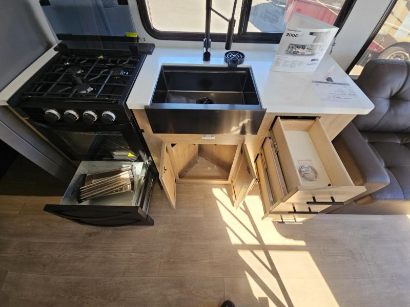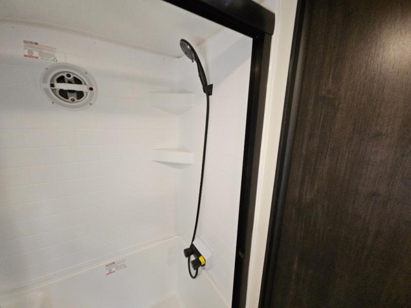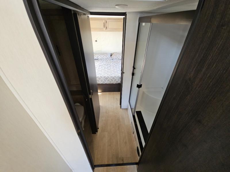 This model is similar to 16ML but larger! A bigger bathroom, RV king bed in the lower master, and a queen bed plus a twin bunk mat in the front loft. And the second loft can be utilized as extra sleeping space or storage space! There is an 18 cu. ft. refrigerator so you can stock up for a week long vacation, a hide-a-bed sofa that can transform into added sleeping for guests, and a high top table with two stools to dine at. The bathroom below is split with a shower on one side, and a private toilet area and sink opposite. And the view is amazing from just about anywhere inside.
