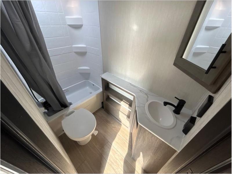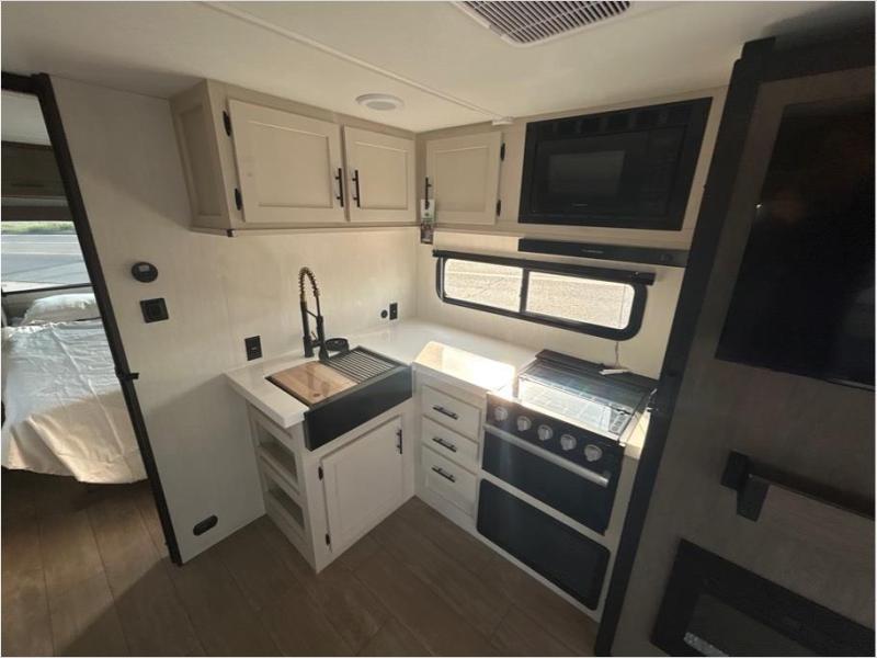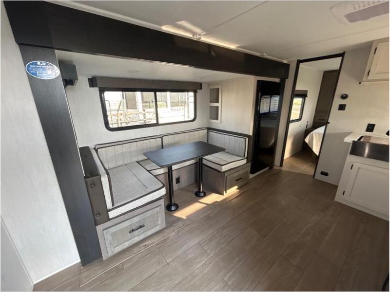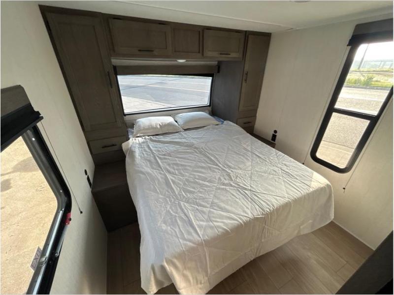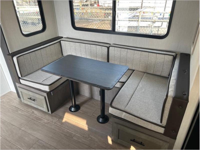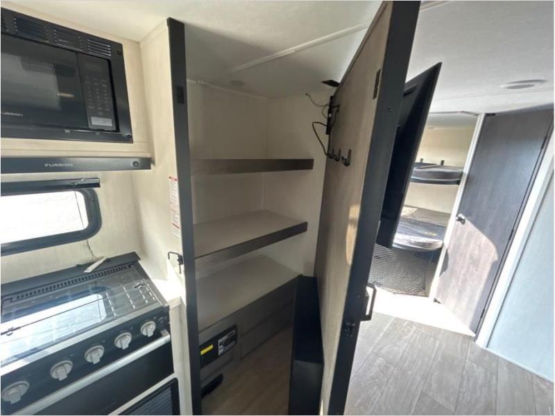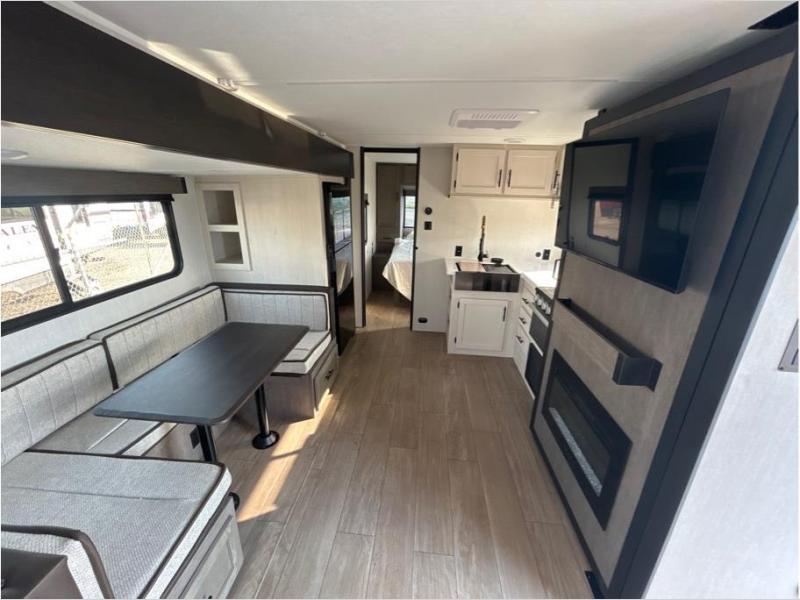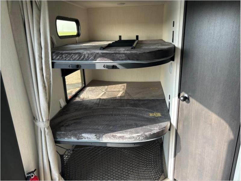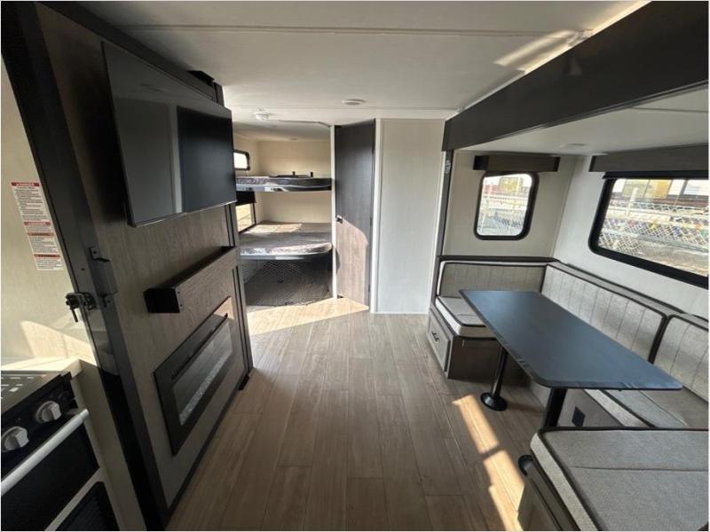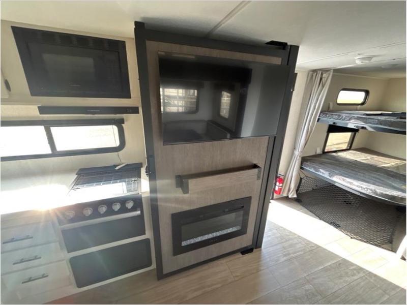 Make your dream of adventure a reality! This incredible travel trailer is perfect for creating lifelong memories with family and friends. The fun begins with the removable and stackable double-size bunk beds, ideal for kids or adults alike. The full bathroom provides convenience and comfort, making it easy to get ready for a day of exploration. The U-shaped dinette is a cozy spot for meals or relaxation while enjoying the amazing entertainment center. Plus, the kitchen area is equipped with a refrigerator, pantry storage, and microwave, making it easy to enjoy your favorite snacks and meals on the go. The 12V refrigerator keeps your food and drinks fresh, and the overhead cabinet provides additional storage for cookware and dishes.The front bedroom features a spacious queen bed, convenient nightstands, a stylish wardrobe, and overhead cabinets for storing your belongings and keeping everything organized.