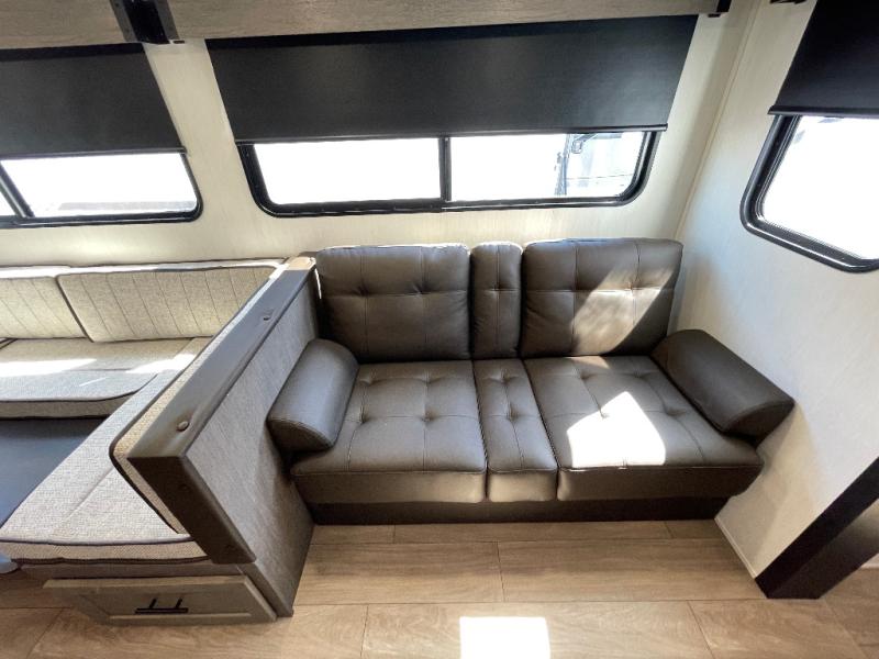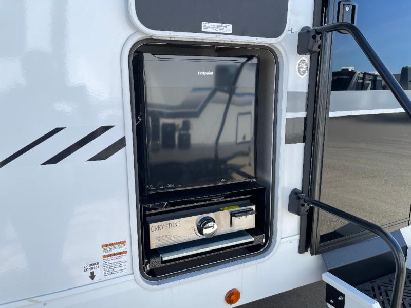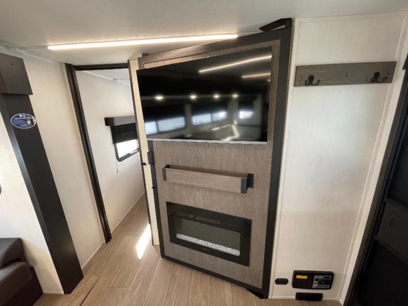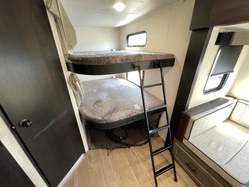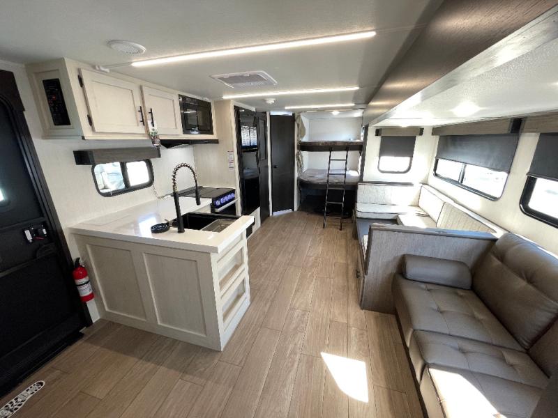 Looking for a multi-sleeper trailer to sleep up to nine campers? You've found it in this dual entry model with an outside kitchen, double-size bunks, and a large slide out! The main living and kitchen area has a U-shaped dinette to utilize as a dining table, game table, work station, and/or an extra sleeping space. You will also find a hidden pantry behind the entertainment center and full kitchen amenities including a large sink and a residential-style refrigerator. The exterior provides a 20' awning for an outdoor living area, outside storage, plus large steps with oversized landing and quick release for convenience. You will also appreciate the Juice Pack that comes with a 100W solar panel, a battery, a 30 AMP solar charger, and more!