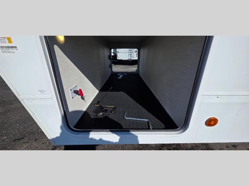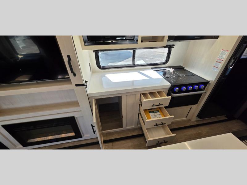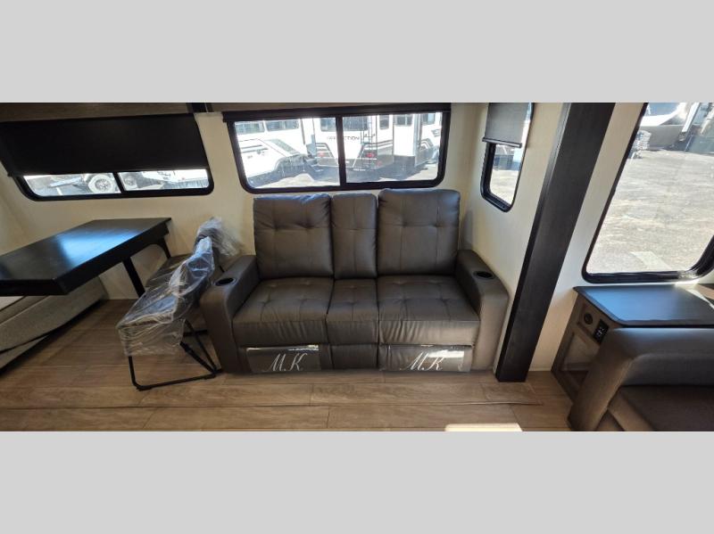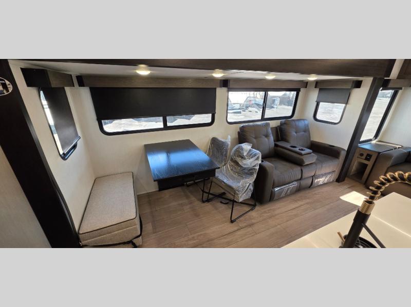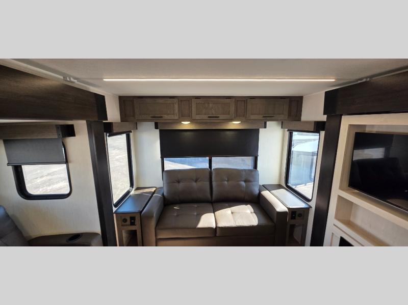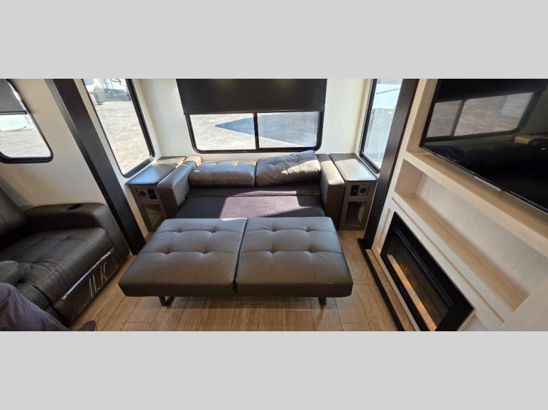 This trailer has it all for maximum comfort and convenience as well as entertainment! The rear living area includes a tri-fold sofa with a rear Pano-Vision window for great views of your campsite, and dual opposing slides widen this area so you can visit with friends. You'll also find theater seating, plus a free-standing table with two chairs and a storage ottoman seat. Enjoy the fireplace on a cool night or when you want a little ambiance while seated inside. Two patio awnings will provide an outdoor living area; just grab your camping chairs from the full pass-through storage. When you want to call it a night, fall quickly to sleep on the queen bed in the front bedroom with easy access to a dual entry bathroom!