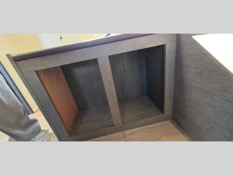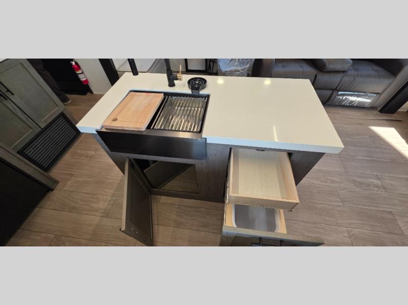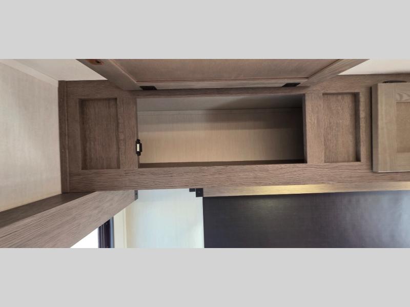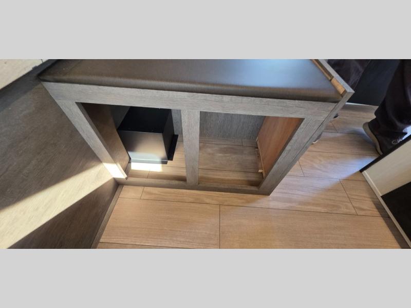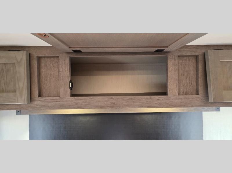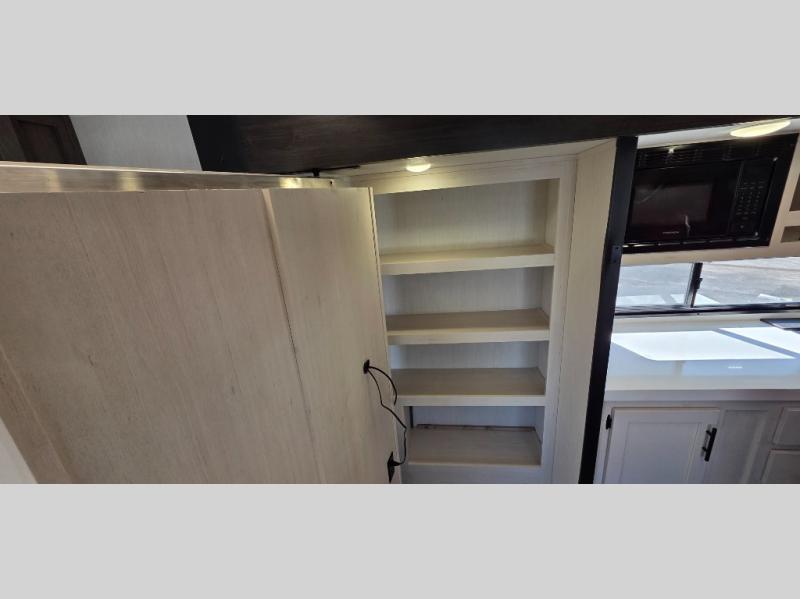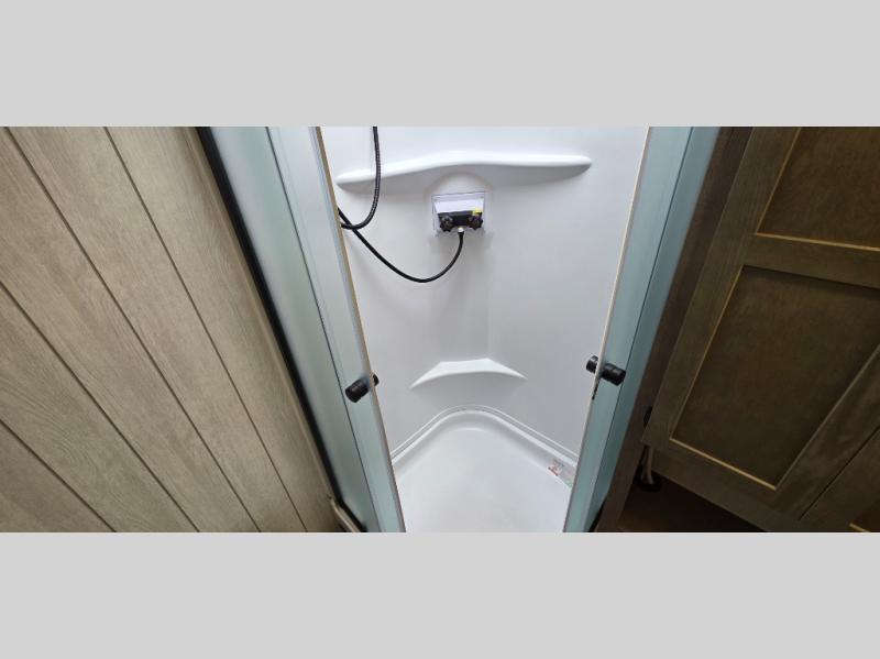 This trailer has it all for maximum comfort and convenience as well as entertainment! The rear living area includes a tri-fold sofa with a rear Pano-Vision window for great views of your campsite, and dual opposing slides widen this area so you can visit with friends. You'll also find theater seating, plus a free-standing table with two chairs and a storage ottoman seat. Enjoy the fireplace on a cool night or when you want a little ambiance while seated inside. Two patio awnings will provide an outdoor living area; just grab your camping chairs from the full pass-through storage. When you want to call it a night, fall quickly to sleep on the queen bed in the front bedroom with easy access to a dual entry bathroom!