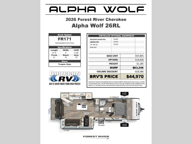 For over 20 years, the Cherokee division of Forest River has produced quality products and has endured to become one of the RV industry’s most widely respected and purchased towable products. Alpha Wolf is the next evolution in Cherokee's renowned quality, floor plan functionality and outstandingly affordable value for your investment. Plainly speaking, Alpha Wolf gives you more for your hard earned dollar!