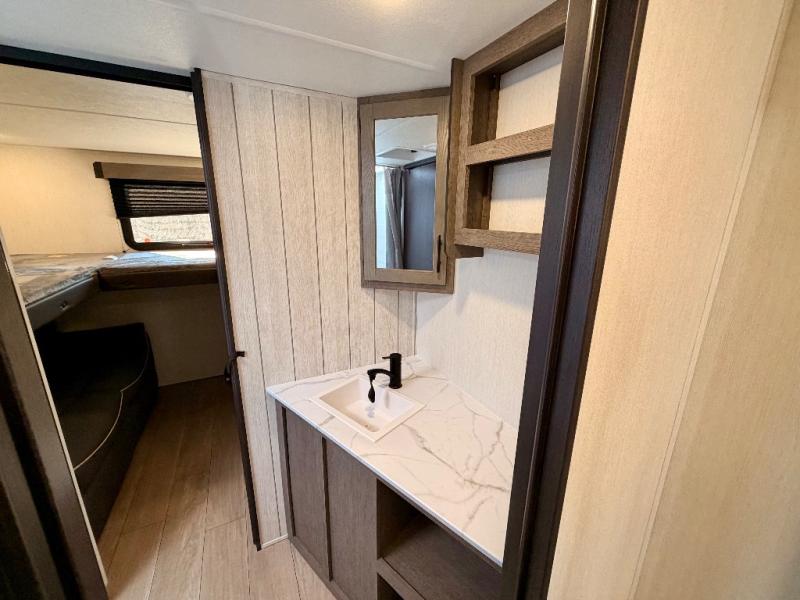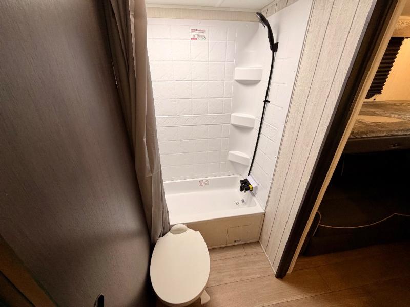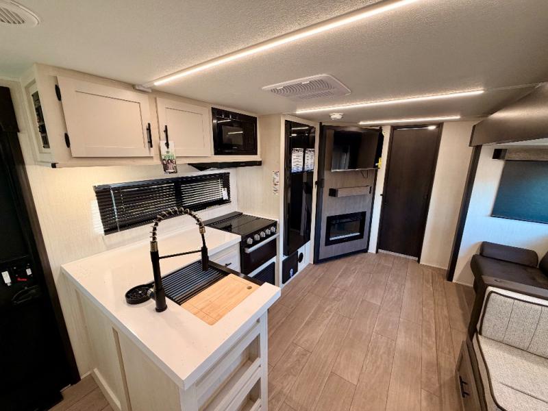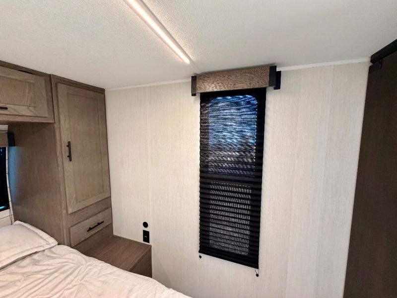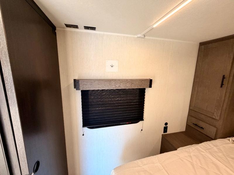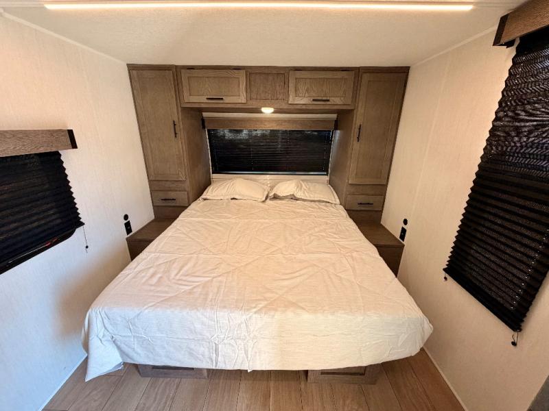 The gourmet kitchen is fully equipped with a 12V refrigerator, microwave, and a dedicated pantry, all while flowing seamlessly into the entertainment center with a fireplace—perfect for cozying up on chilly evenings. The walk-thru bathroom layout provides a natural transition to the front master suite, which serves as a peaceful sanctuary with its queen bed, dual wardrobes, and overhead cabinetry. Whether you're hosting a full house or enjoying a quiet morning coffee, the 29TB offers a functional, high-end floorplan for every scenario.