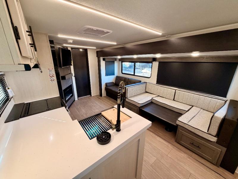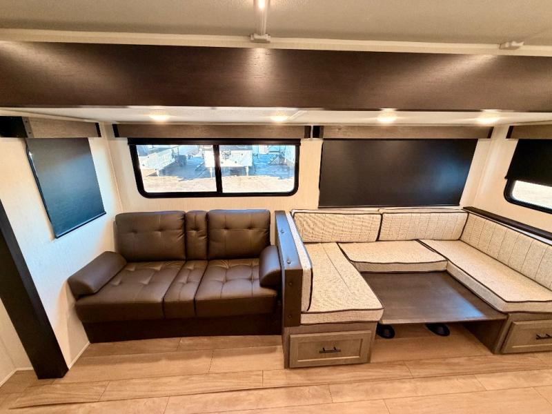 This stunning travel trailer is designed to provide high-capacity comfort and luxury on the open road. The rear bunkhouse is a standout, featuring two flip-up top bunk beds that create a flexible space for kids or extra gear. The main living area is a social hub, anchored by a U-shaped dinette and a combination of a tri-fold sofa and a jackknife sofa, offering an incredible amount of lounging space and additional sleeping berths for a large crew.