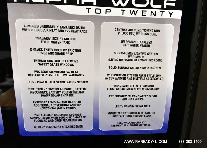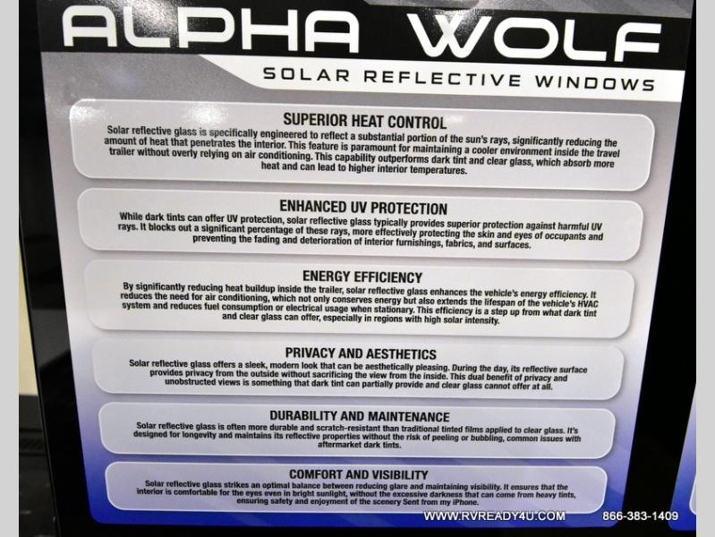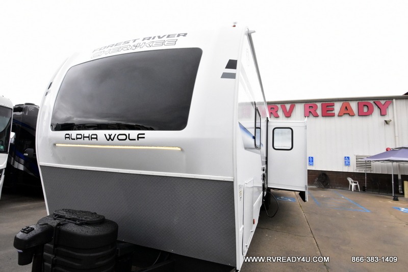 With any Cherokee Alpha Wolf travel trailer by Forest River, you'll enjoy outstanding amenities, quality construction, and an affordable price. Each model features a "ToughBend" rigid skirt metal design, 5/8" tongue and groove plywood floor decking, and a "SuperTruss" roof structure built for countless camping memories. There is a pet friendly "clean sweep" floor design with no heat vents indoors, along with a super lumen lighting system, a 15,000 BTU quick cool central air conditioning, and many more comforts. There are many convenient exterior features such as, Leash Latch pet safety technology, an outside shower with hot and cold water, and exterior steps with oversized landing and quick release. The Weather Guard Package will add protection against the elements with an armored underbelly tank enclosure and forced air heat, thermo-control reflective safety glass windows, and upgraded laminated exterior walls with block foam insulation!