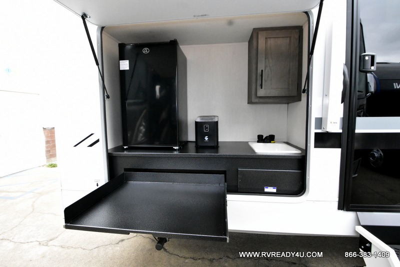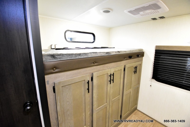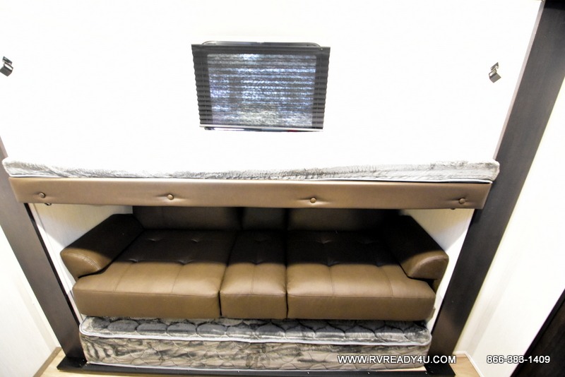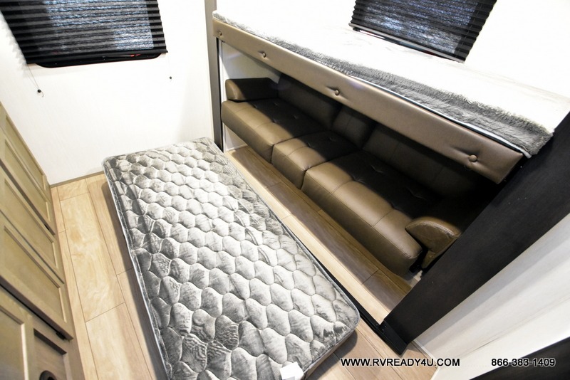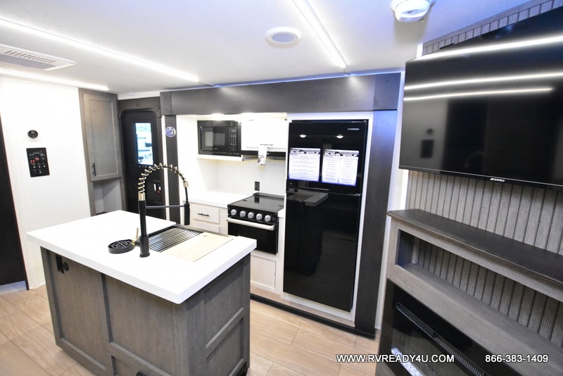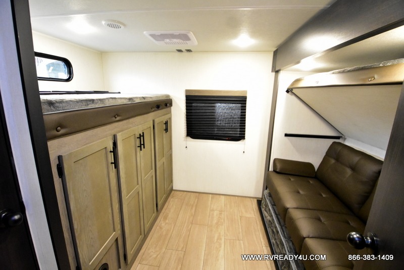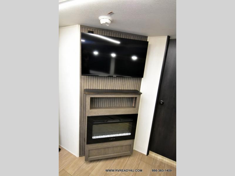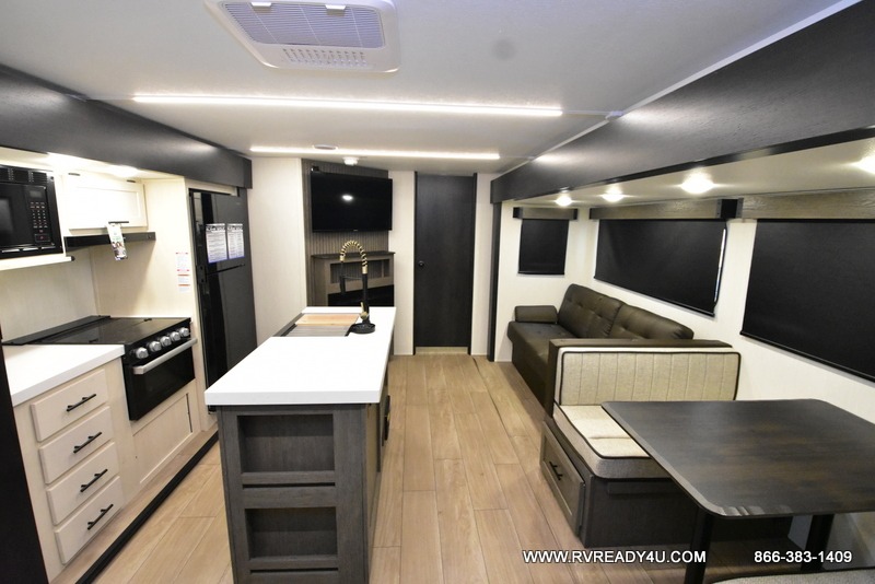 Load up your clothes, food, and outdoor gear to enjoy a long weekend away from the city in this travel trailer! There are triple slide outs, a private bunkhouse with a half bathroom with a second exterior entry/door for convenience, plus an outside kitchen! The bunkhouse also has two bunks, a jackknife sofa and a trundle bed, plus a slide out for more interior floor space. The main living and kitchen area is spacious as well with two opposing slides, a kitchen island with a large sink, a pantry, plus a cozy fireplace. The full walk-through bathroom allows double access, and the front bedroom allows you to sleep like royalty.