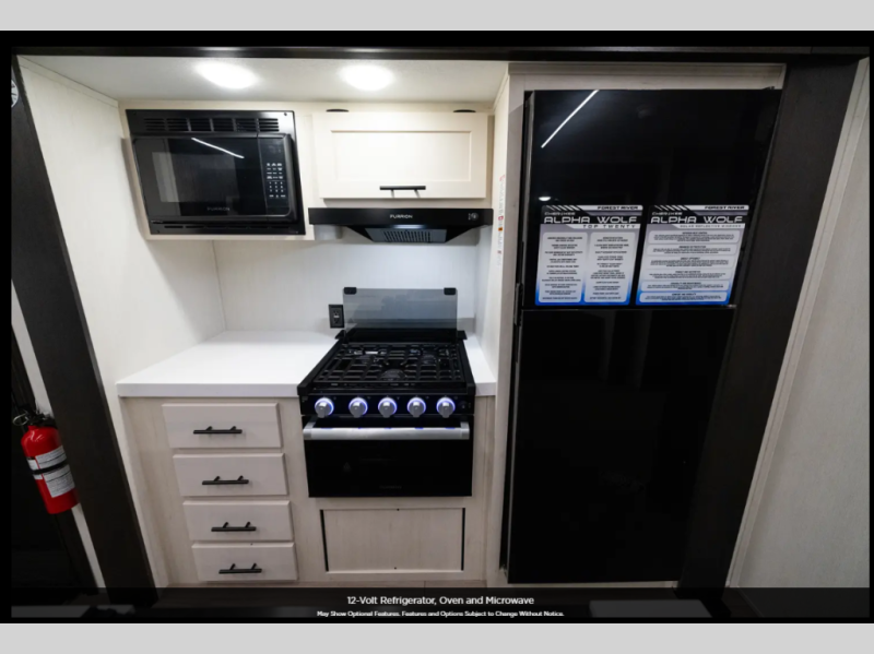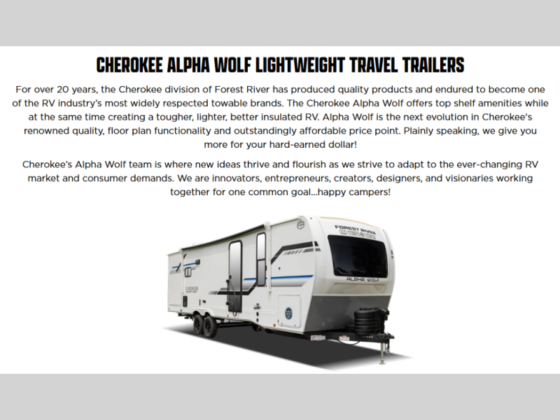 With any Cherokee Alpha Wolf travel trailer by Forest River, you'll enjoy outstanding amenities, quality construction, and an affordable price. Each model features a "ToughBend" rigid skirt metal design, 5/8" tongue and groove plywood floor decking, and a "SuperTruss" roof structure built for countless camping memories. There is a pet friendly "clean sweep" floor design with no heat vents indoors, along with a super lumen lighting system, a 15,000 BTU quick cool central air conditioning, and many more comforts. There are many convenient exterior features such as, Leash Latch pet safety technology, an outside shower with hot and cold water, and exterior steps with oversized landing and quick release. The Weather Guard Package will add protection against the elements with an armored underbelly tank enclosure and forced air heat, thermo-control reflective safety glass windows, and upgraded laminated exterior walls with block foam insulation!