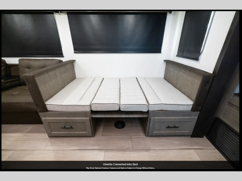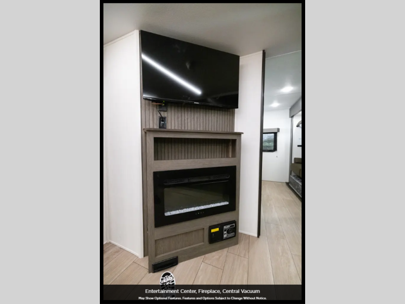 Load up your clothes, food, and outdoor gear to enjoy a long weekend away from the city in this travel trailer! There are triple slide outs, a private bunkhouse with a half bathroom with a second exterior entry/door for convenience, plus an outside kitchen! The bunkhouse also has two bunks, a jackknife sofa and a trundle bed, plus a slide out for more interior floor space. The main living and kitchen area is spacious as well with two opposing slides, a kitchen island with a large sink, a pantry, plus a cozy fireplace. The full walk-through bathroom allows double access, and the front bedroom allows you to sleep like royalty.