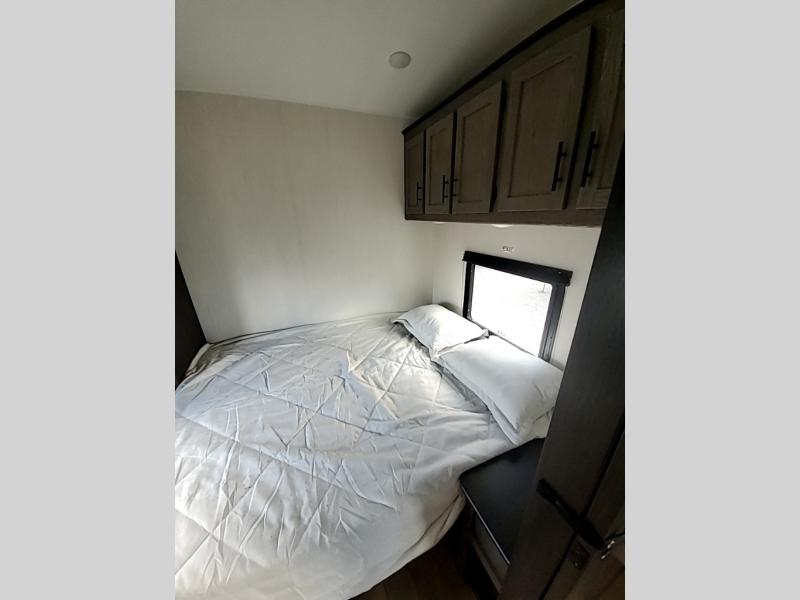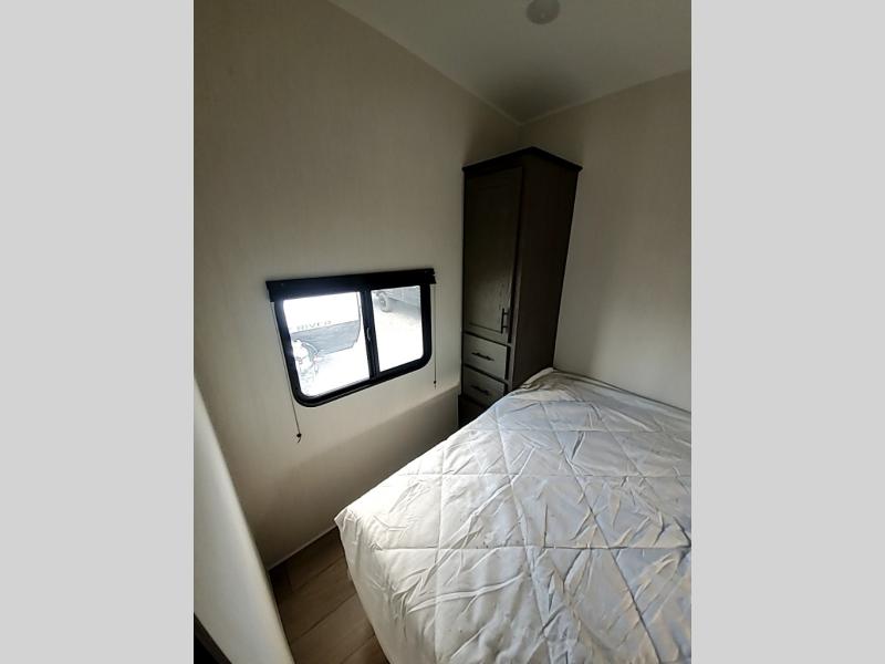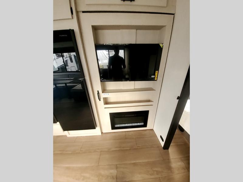 Invite the whole gang with this spacious fifth wheel in tow! The rear private bunkhouse includes triple bunks, a dinette, plus a TV stand with a dresser to keep your space tidy. You'll find a queen bed in the front private bedroom, along with two wardrobes and an overhead cabinet for books. Everyone can meet in the combined kitchen and living area to relax on the tri-fold sofa, play a game around the U-shaped dinette, or just enjoy the fireplace! The chef of your group will have an interior kitchen to cook meals each day, or they can head outside to use the outdoor kitchen with a refrigerator. There is also a 20' patio awning and outside storage to keep hiking gear packed away.