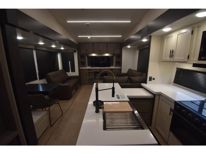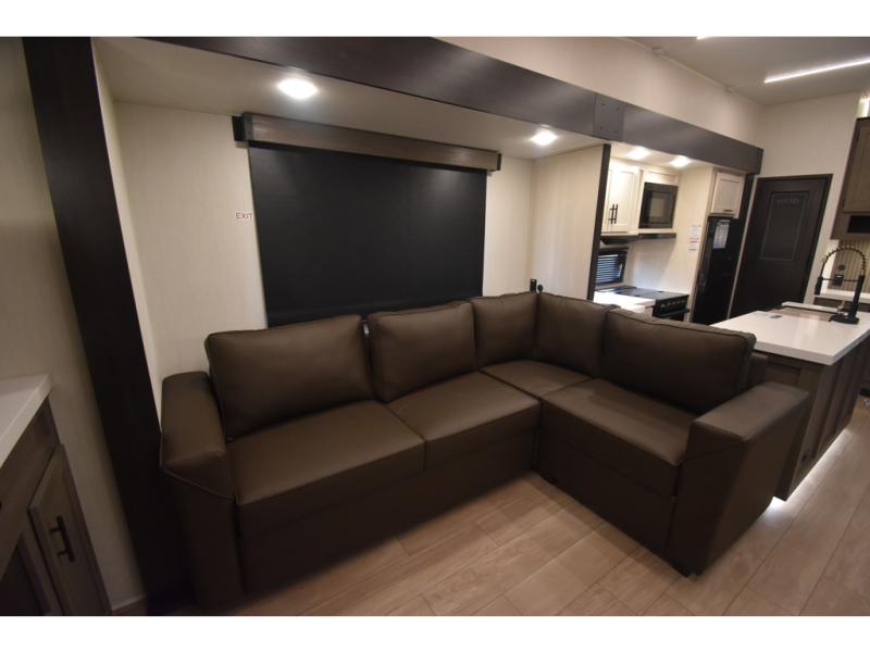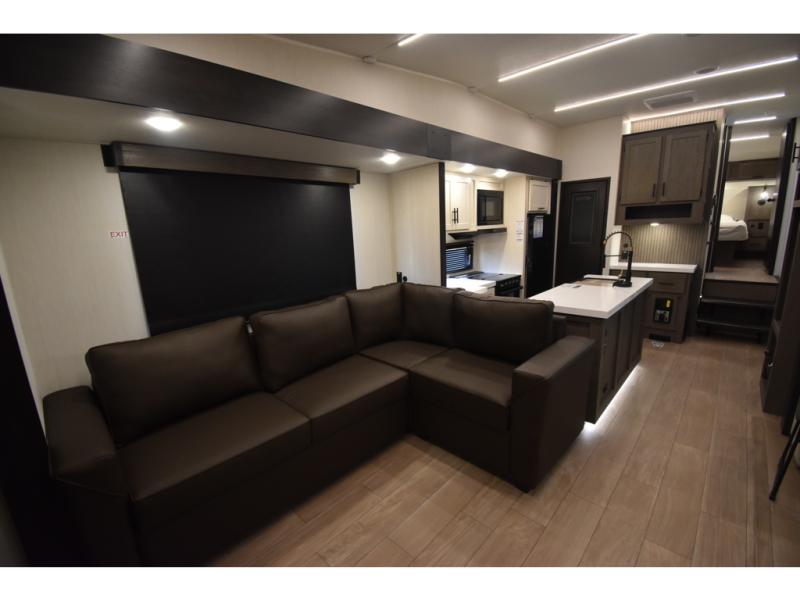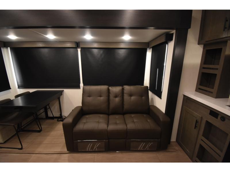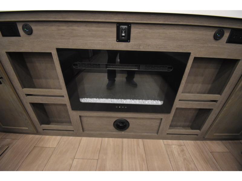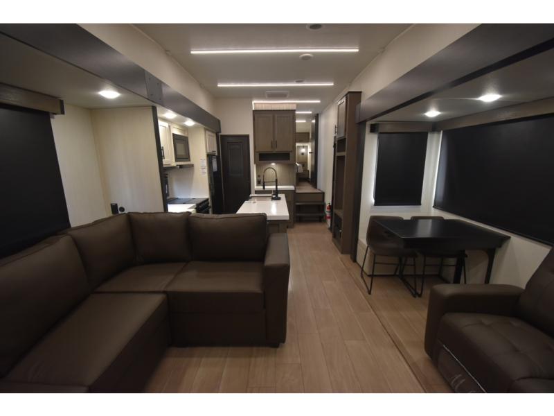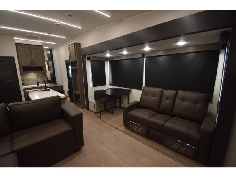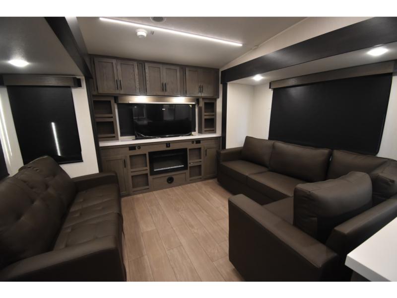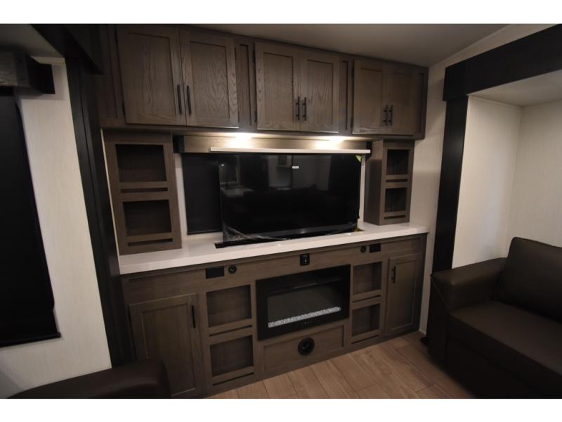Enjoy time at the campground in this spacious fifth wheel! Once you arrive at the campground, you can unload the outside storage, put out the 15' awning, then head inside to make lunch on the three burner cooktop. Your crew can dine at the free-standing table and chairs, then relax on the dual tri-fold sofas. There is also theater seating, all in great view of the rear televator TV and fireplace. A full bath with a spacious shower will let you freshen up before bed, and the queen bed in the front bedroom is sure to bring a great night's rest!
