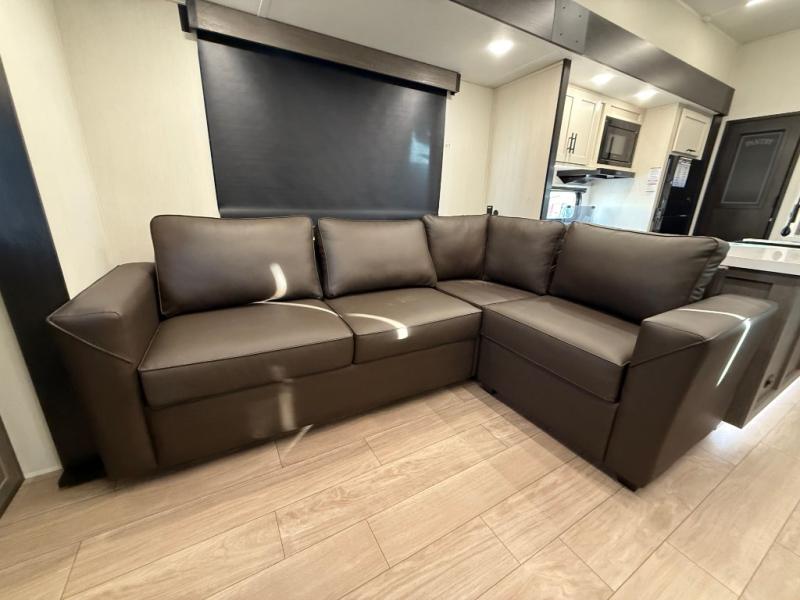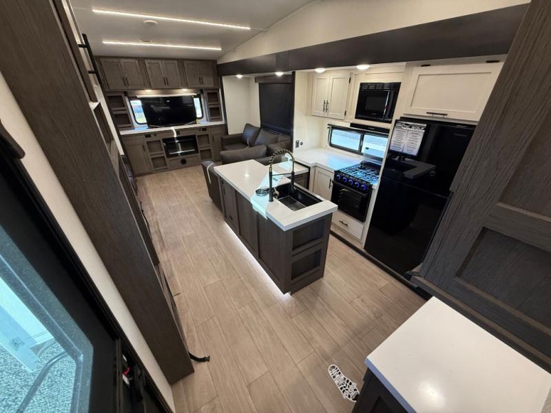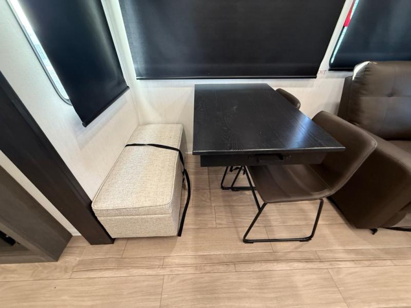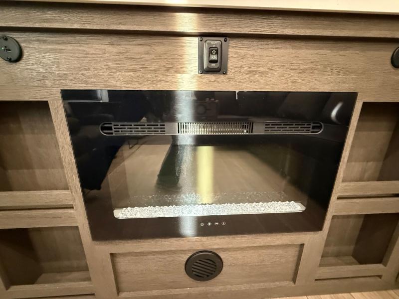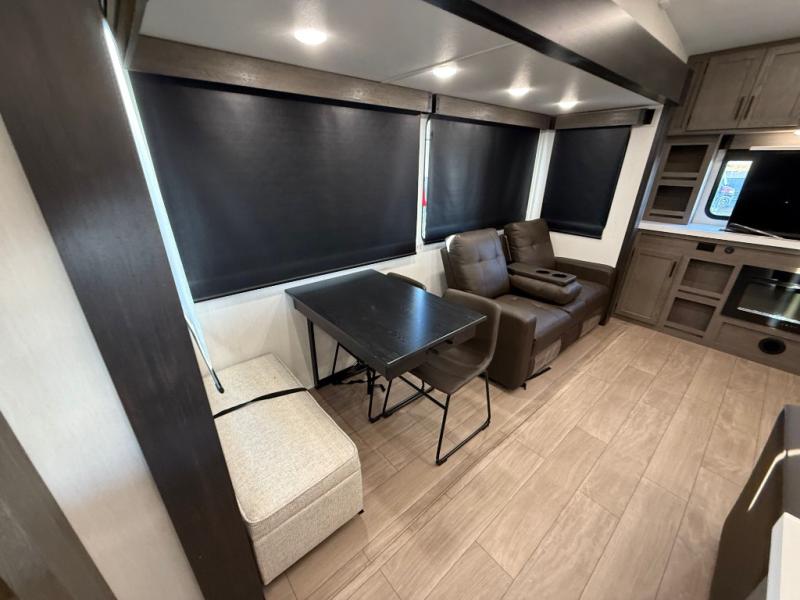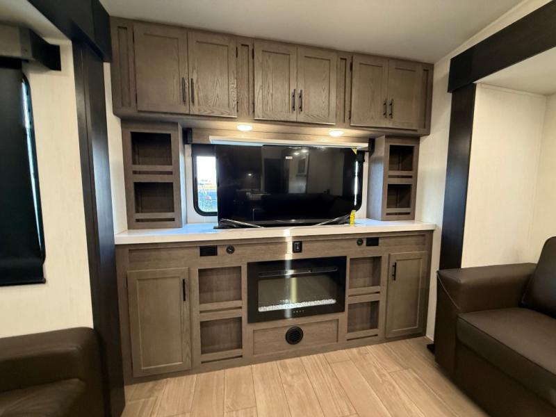 Enjoy time at the campground in this spacious fifth wheel! Once you arrive at the campground, you can unload the outside storage, put out the 15' awning, then head inside to make lunch on the three burner cooktop. Your crew can dine at the free-standing table and chairs, then relax on the dual tri-fold sofas. There is also theater seating, all in great view of the rear televator TV and fireplace. A full bath with a spacious shower will let you freshen up before bed, and the queen bed in the front bedroom is sure to bring a great night's rest!