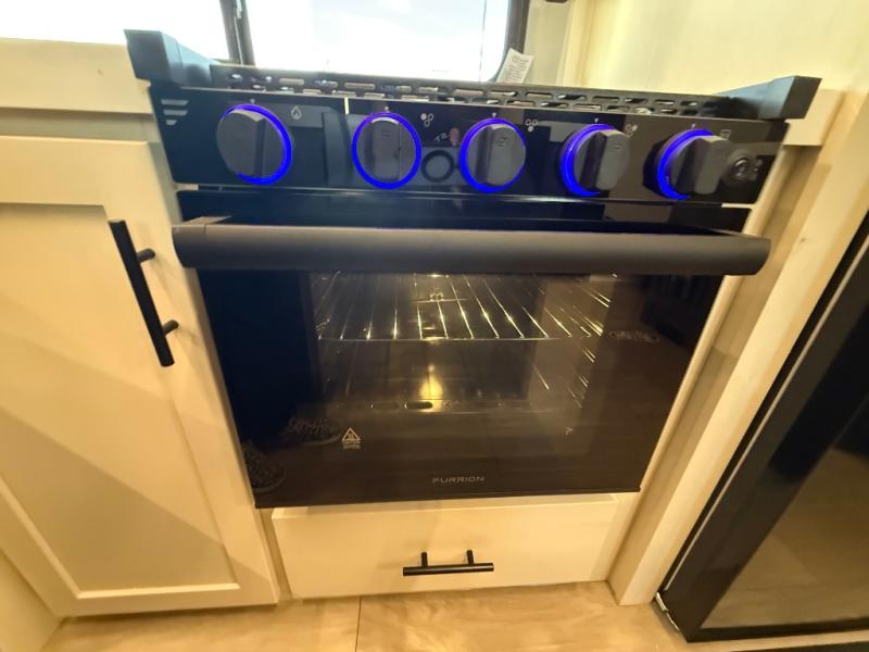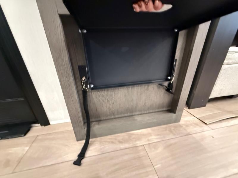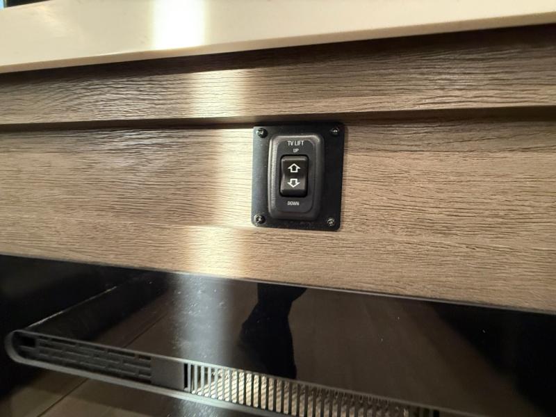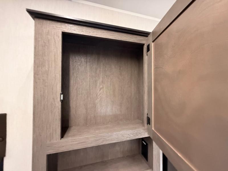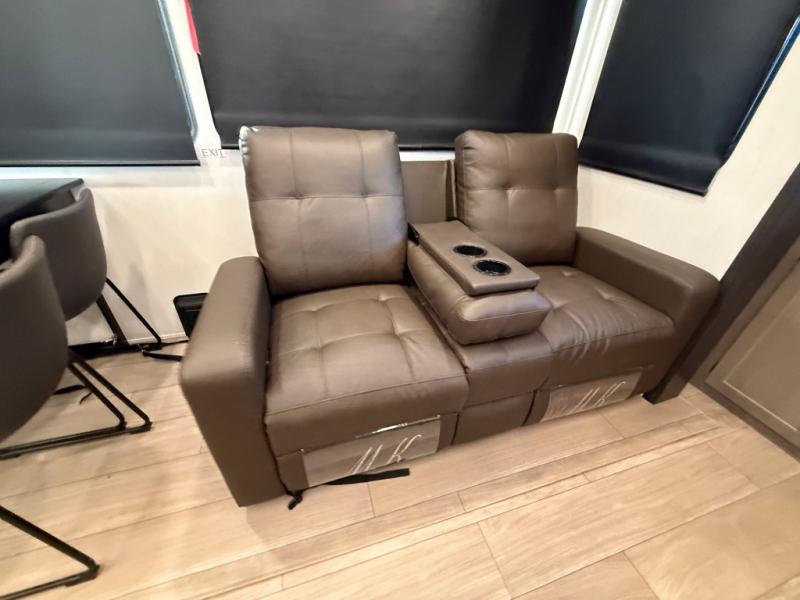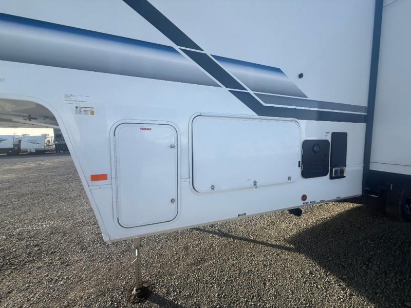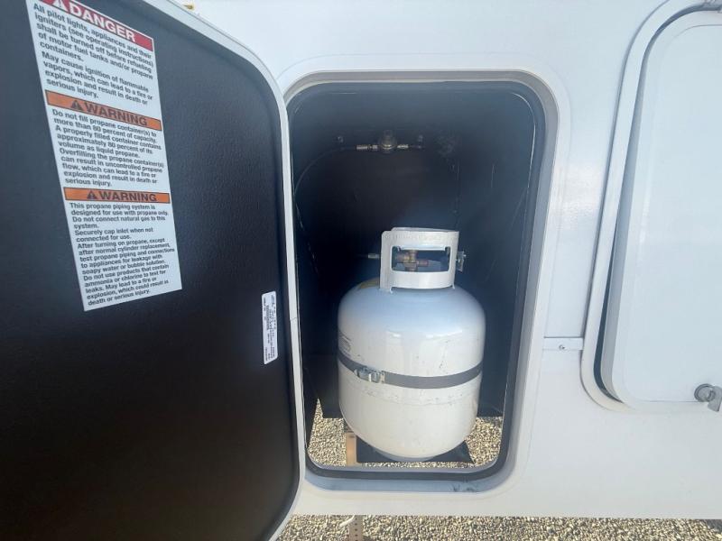 Enjoy time at the campground in this spacious fifth wheel! Once you arrive at the campground, you can unload the outside storage, put out the 15' awning, then head inside to make lunch on the three burner cooktop. Your crew can dine at the free-standing table and chairs, then relax on the dual tri-fold sofas. There is also theater seating, all in great view of the rear televator TV and fireplace. A full bath with a spacious shower will let you freshen up before bed, and the queen bed in the front bedroom is sure to bring a great night's rest!