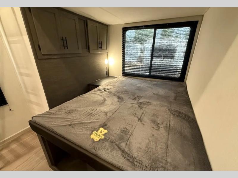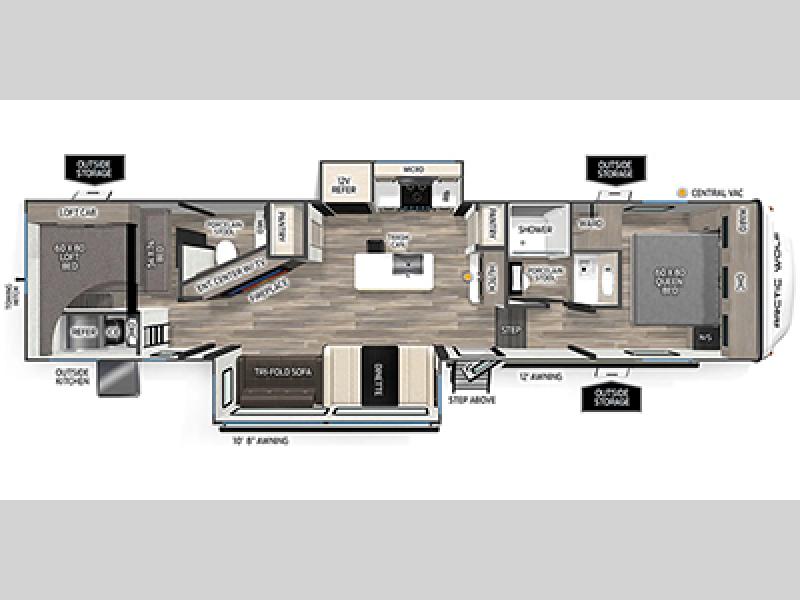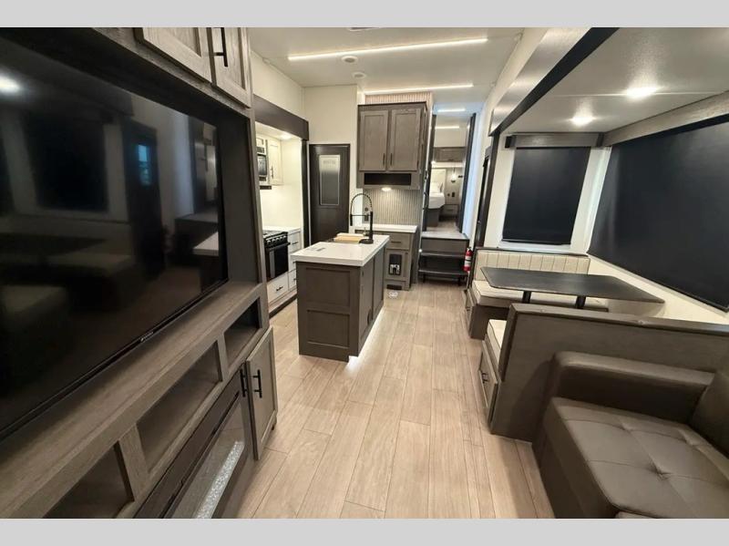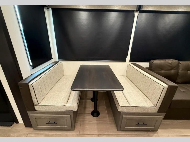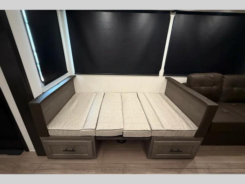 There's not much about this fifth wheel that you won't love! Your guests can claim the rear bunkhouse suite with a 54" x 74" bunk/bed, a 60" x 80" loft bunk, and a half bath for added convenience. You'll have the front private bedroom all to yourselves, and the spacious full bath is close by for easy nighttime use. Everyone can meet in the combined kitchen and living area that is made open thanks to the dual opposing slides. There is also a kitchen island with a trash can, a hutch, a booth dinette, and a tri-fold sofa across from the fireplace; how cozy!