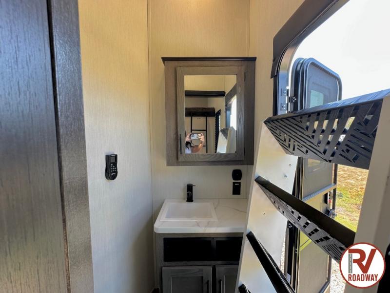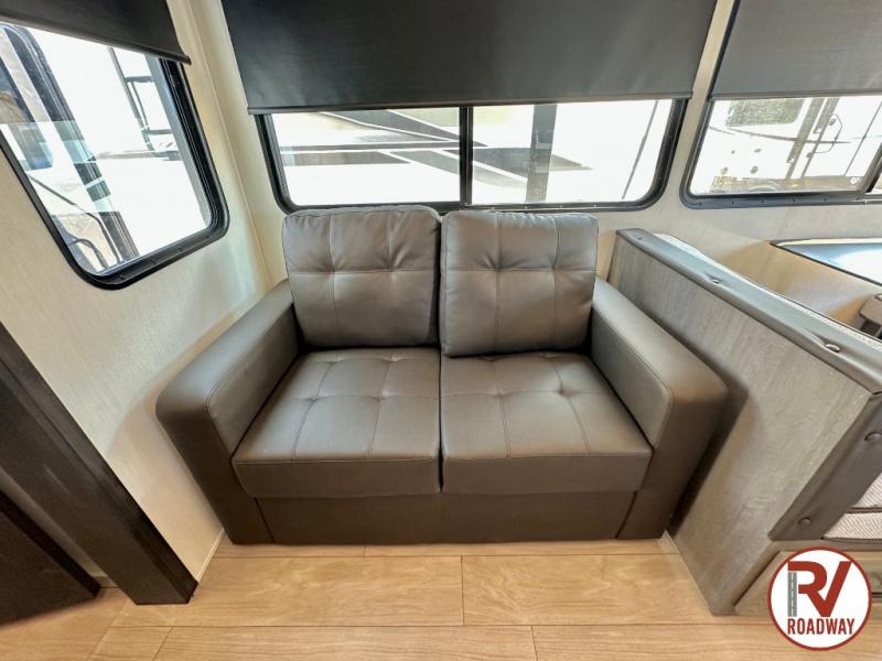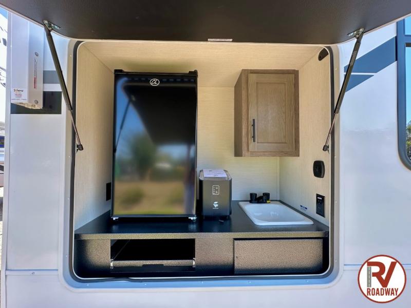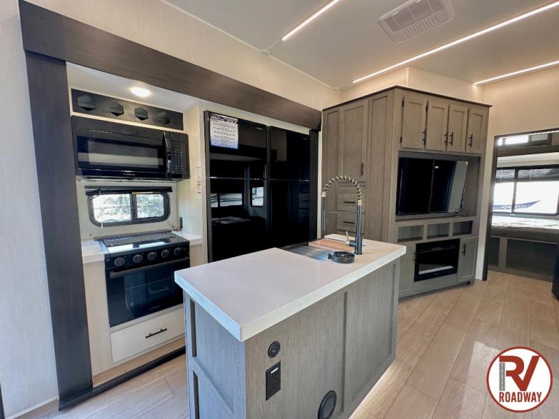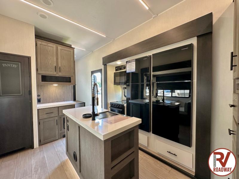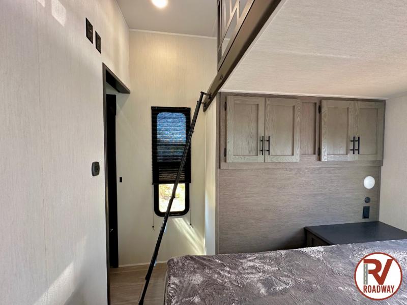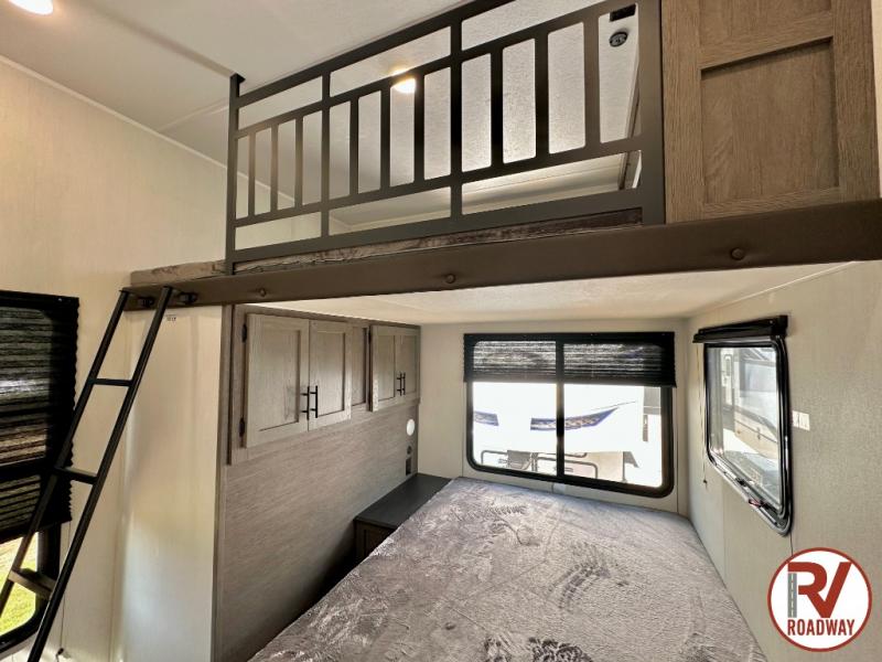 This Cherokee Arctic Wolf fifth wheel is an excellent choice if you have a large family that wants to get away! Not only is there a private bedroom up front for you, but there is also a bedroom suite in the back. This suite has a 54" x 74" bed, a 60" x 80" loft bed, full under bed storage, a half bathroom all to itself, and the second exterior entry door. What a space! You'll also be highly impressed with the living area because it has a large slide that holds the tri-fold sofa and dinette. The large pantry is another feature you'll appreciate since it can store all of the food needed to feed your group, and the outside kitchen is an added bonus the cook will love!