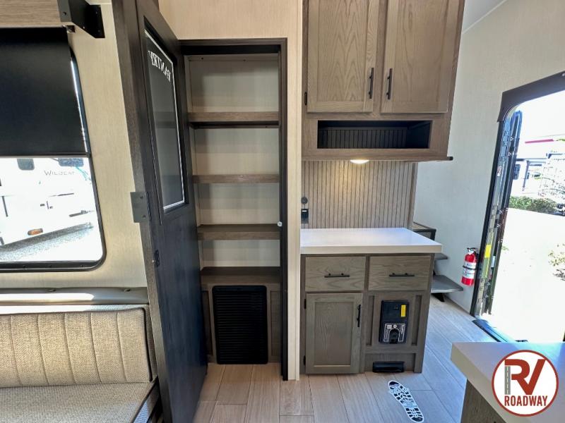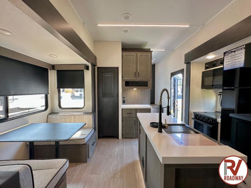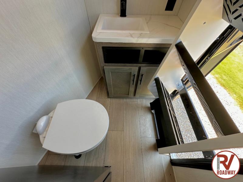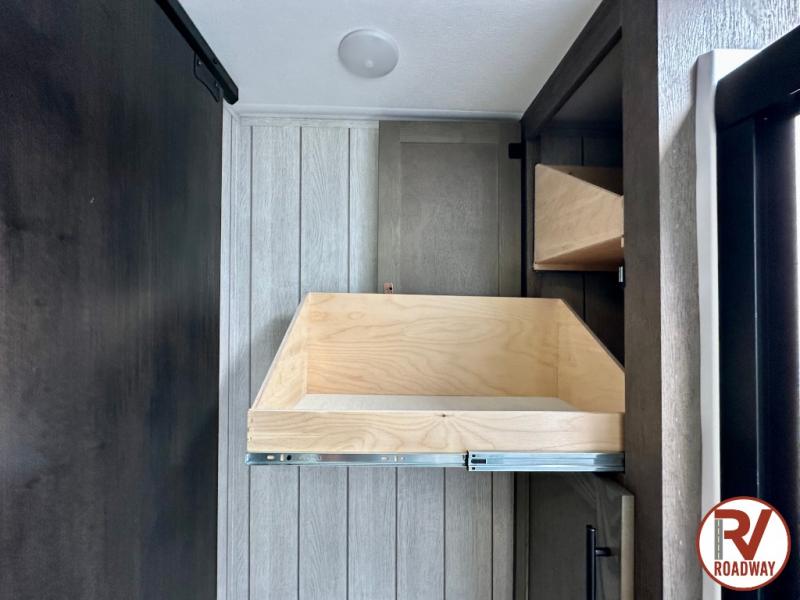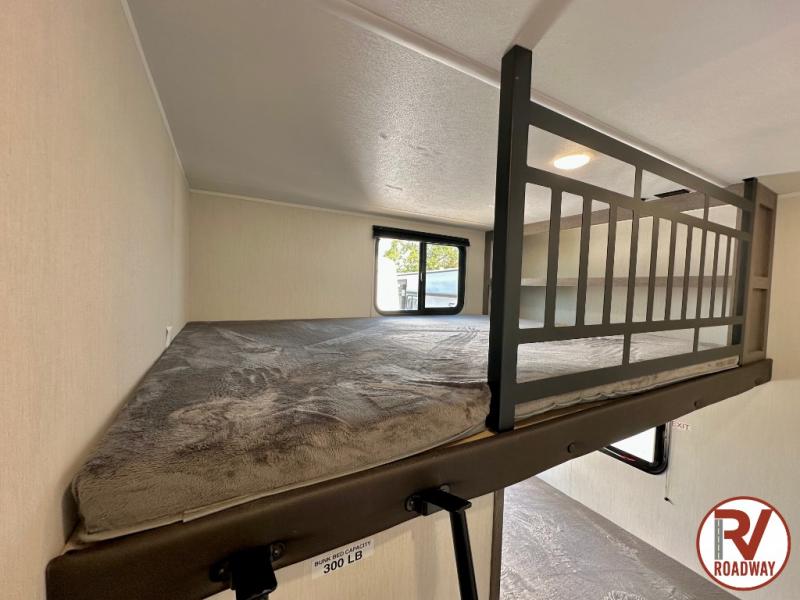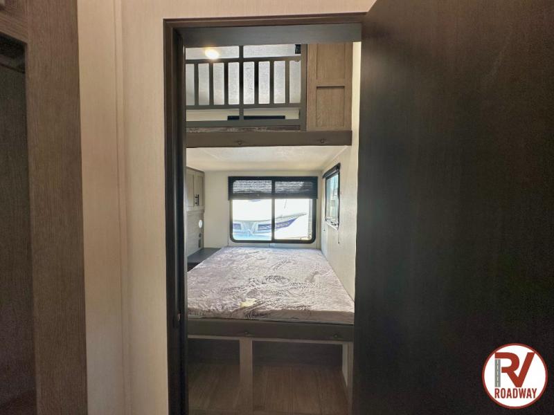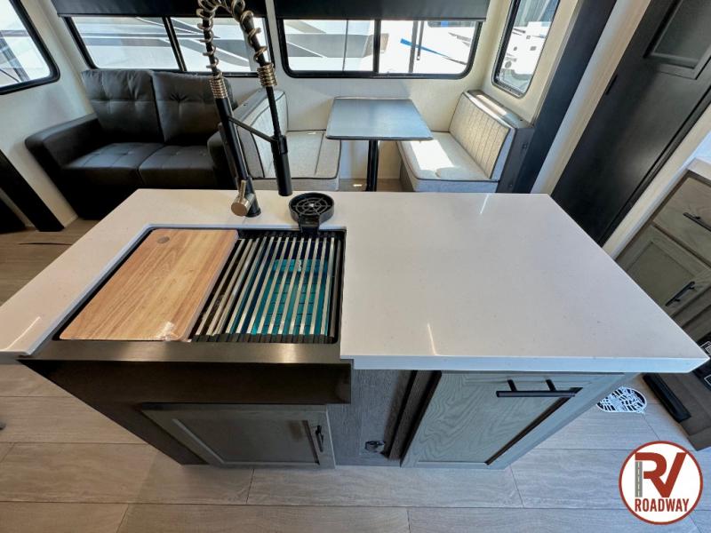 This Cherokee Arctic Wolf fifth wheel is an excellent choice if you have a large family that wants to get away! Not only is there a private bedroom up front for you, but there is also a bedroom suite in the back. This suite has a 54" x 74" bed, a 60" x 80" loft bed, full under bed storage, a half bathroom all to itself, and the second exterior entry door. What a space! You'll also be highly impressed with the living area because it has a large slide that holds the tri-fold sofa and dinette. The large pantry is another feature you'll appreciate since it can store all of the food needed to feed your group, and the outside kitchen is an added bonus the cook will love!