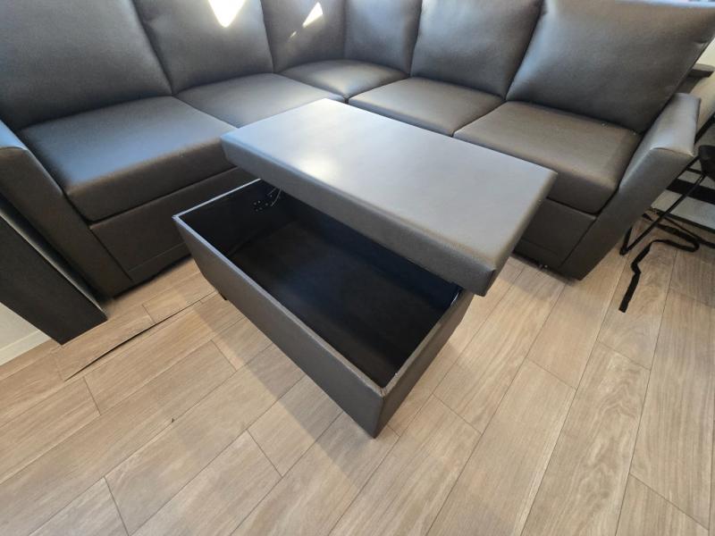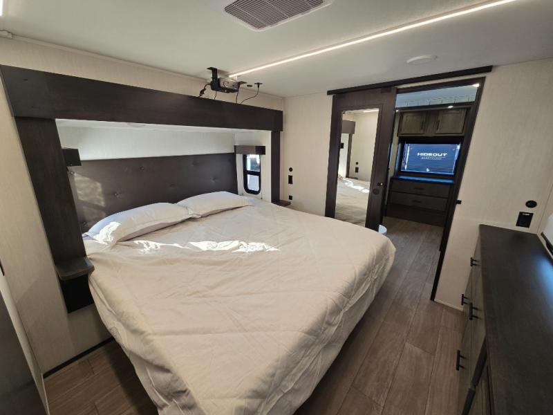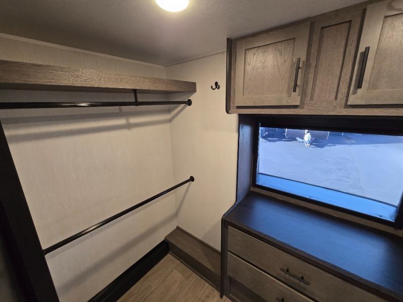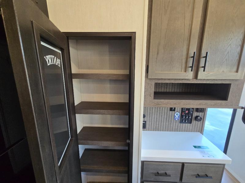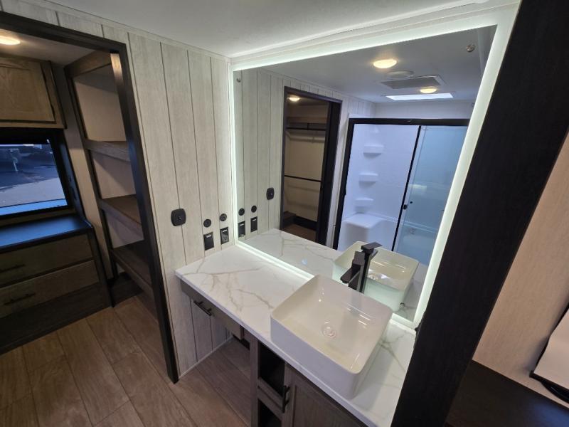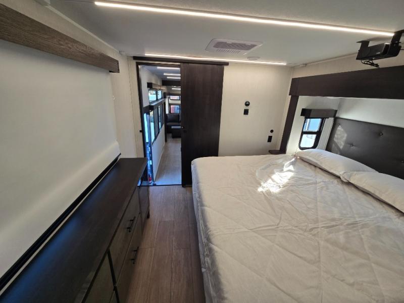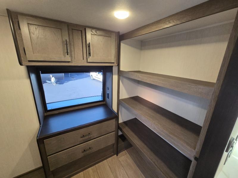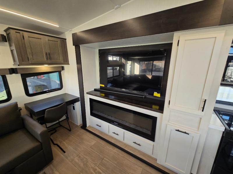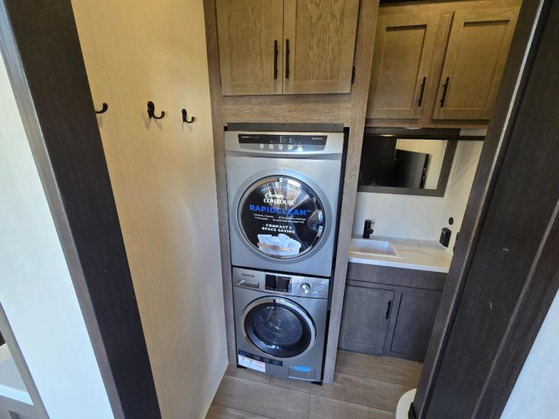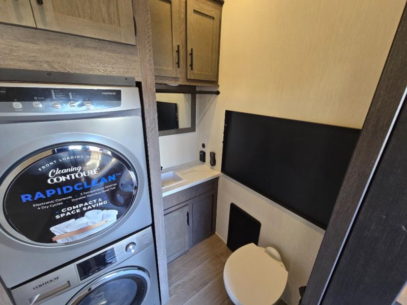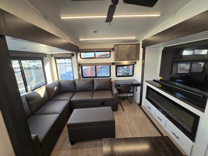 This thoughtfully arranged floorplan is built for extended stays and easy daily living. The rear lounge centers around an L-shaped sectional facing the entertainment wall and fireplace, with a nearby desk for work or hobbies. The kitchen’s island anchors a generous prep area, oversized pantry, and full cooking suite, so meals are simple whether you’re weekending or full-timing. Mid-coach, the guest half bath is convenient for all. Up front, the private bedroom’s king bed slide connects to a spa-style bath with large shower and dressing space, plus a substantial wardrobe to keep clutter out of sight. Outside, enjoy the campsite under dual power awnings that stretch along the patio side.