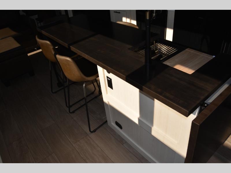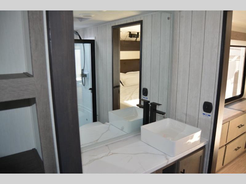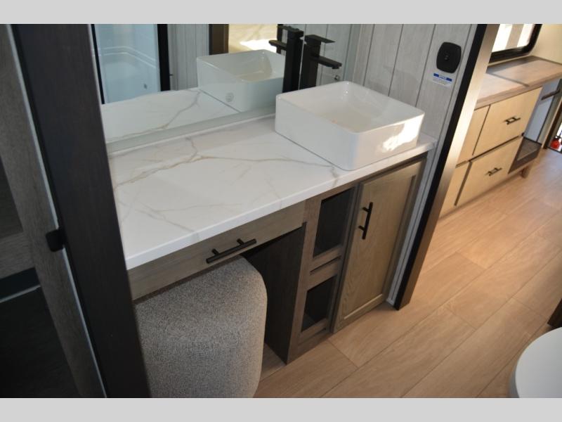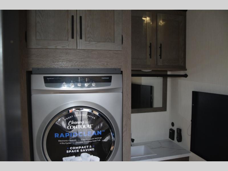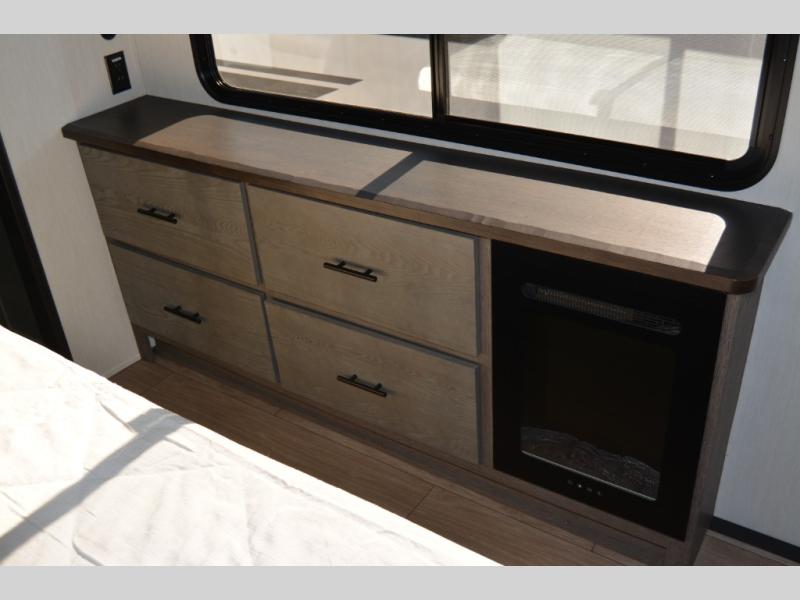 This thoughtfully arranged floorplan is built for extended stays and easy daily living. The rear lounge centers around an L-shaped sectional facing the entertainment wall and fireplace, with a nearby desk for work or hobbies. The kitchen’s island anchors a generous prep area, oversized pantry, and full cooking suite, so meals are simple whether you’re weekending or full-timing. Mid-coach, the guest half bath is convenient for all. Up front, the private bedroom’s king bed slide connects to a spa-style bath with large shower and dressing space, plus a substantial wardrobe to keep clutter out of sight. Outside, enjoy the campsite under dual power awnings that stretch along the patio side.