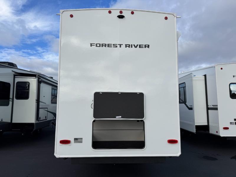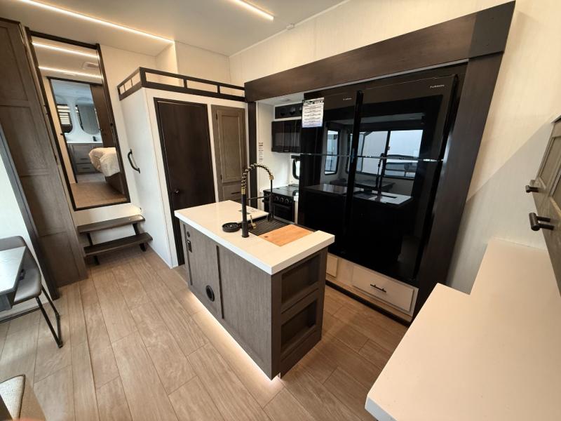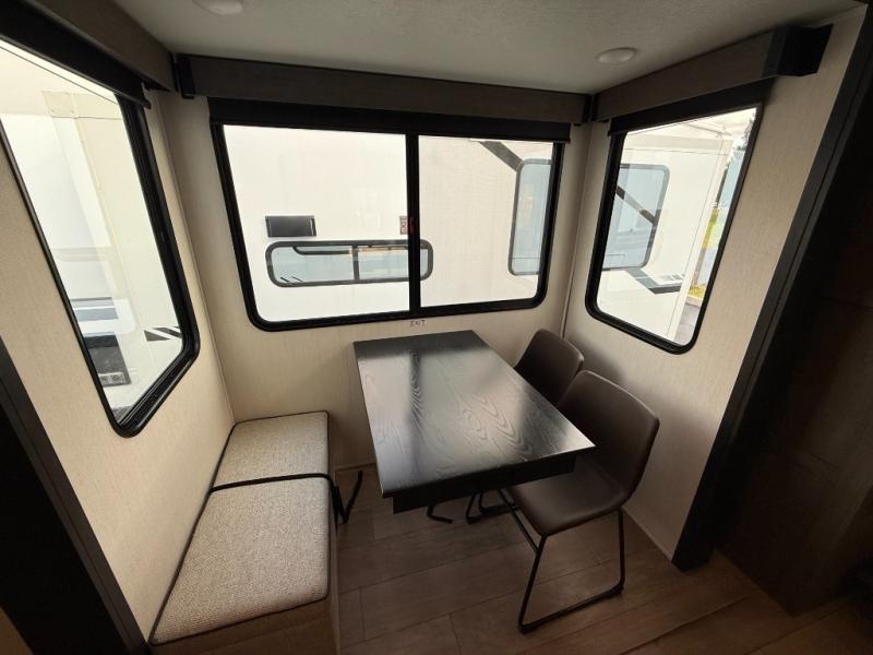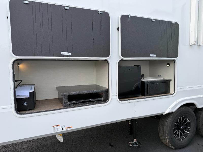 Five slides, a bath and a half, plus sleeping space for six make this fifth wheel the perfect choice! Once you arrive at your destination, prepare lunch on the exterior kitchen. Inside, you'll find a kitchen island, plenty of storage space, plus a free-standing table with chairs and a storage ottoman seat. The front living area will be a favorite place to hang out and this room can double as a bedroom with the two tri-fold sofas. There is also theater seating across from the entertainment center and fireplace, plus storage cabinets for movies or board games. When you're ready to call it a night, head to the master bedroom for a great night's rest on the king bed slide out. You will also love the full rear bath with dual sinks, a spacious shower, plus a closet with stackable washer and dryer prep!