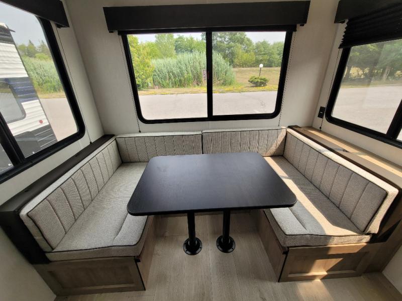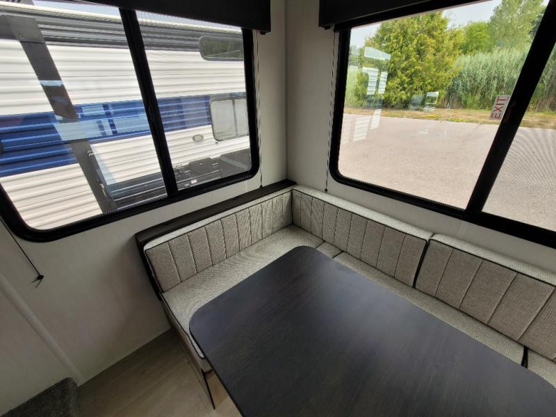 Time spent at the campground in this well designed travel trailer will be time well spent! The front bedroom includes a walk-around RV king bed, dual bedroom wardrobes plus USB ports to charge your phone or laptop. You can whip up breakfast in the modern kitchen that includes an air fryer, then dine around the U-shaped dinette with a panoramic window. This area can also double as sleeping space for one to two guests as well! A pantry will let you stock up on snacks and the TV mount means you can bring along a television if you want to enjoy movie nights. There is also a full bath with a tub/shower where you can freshen up each day!