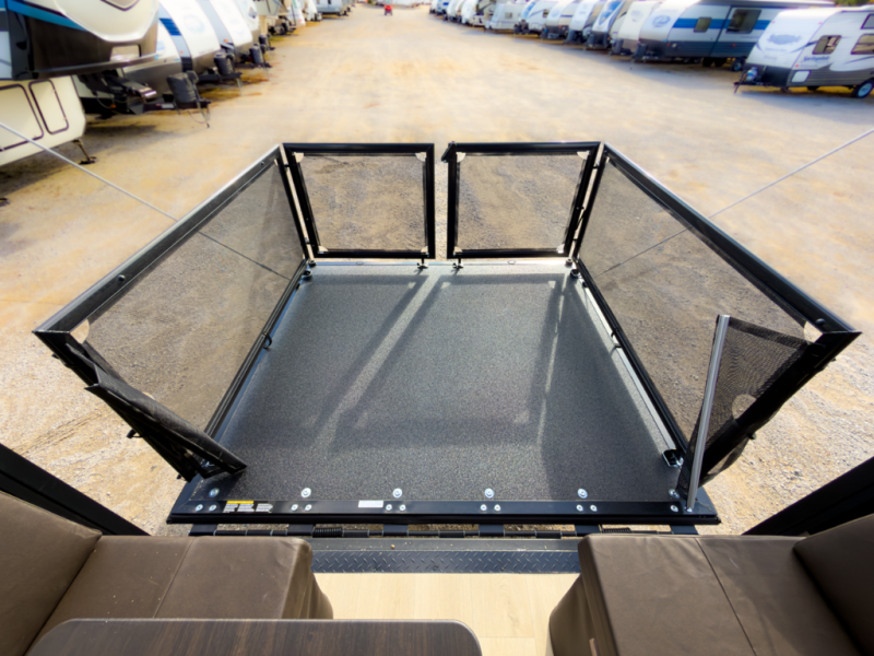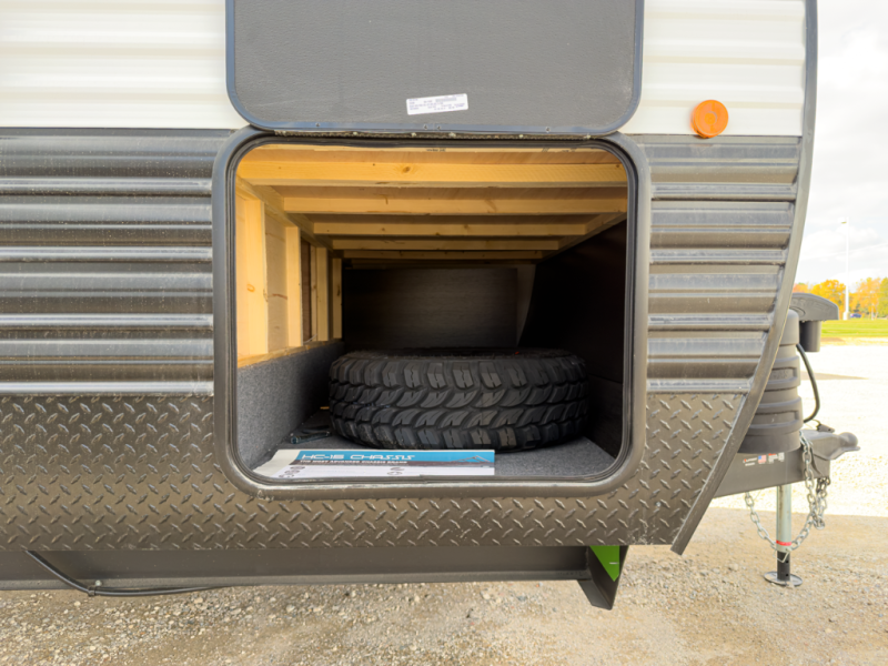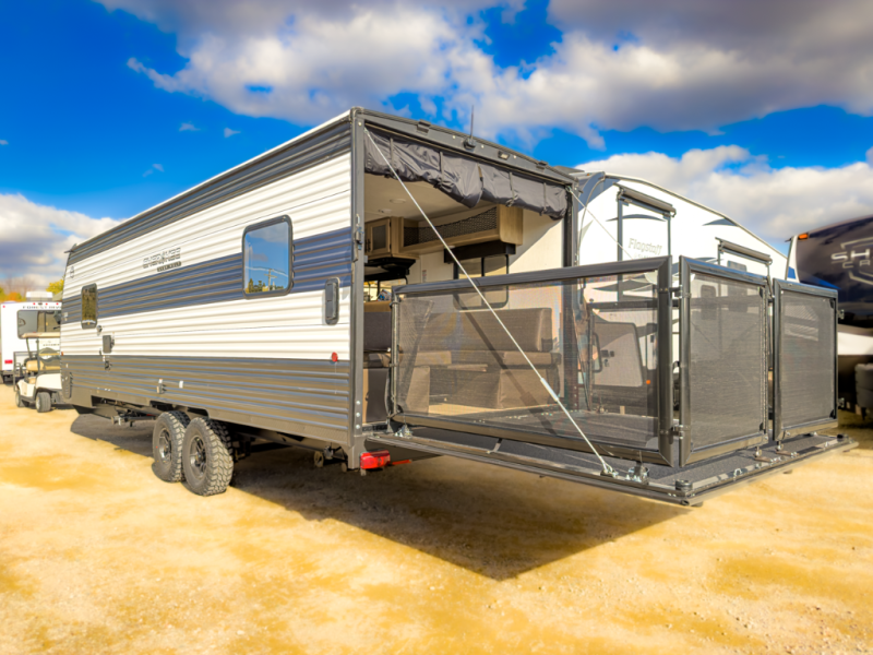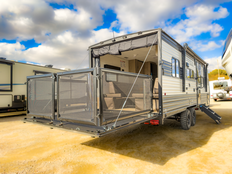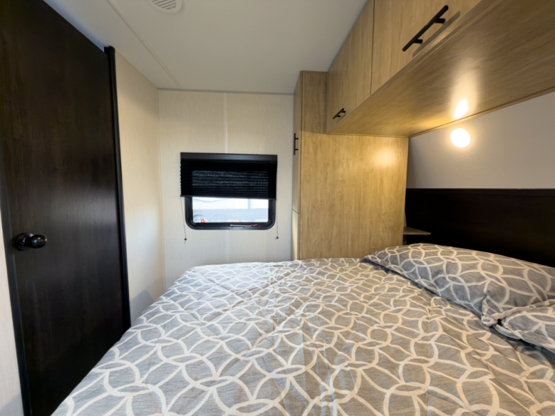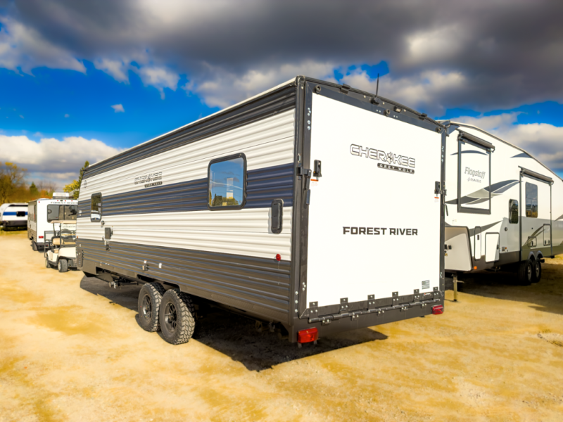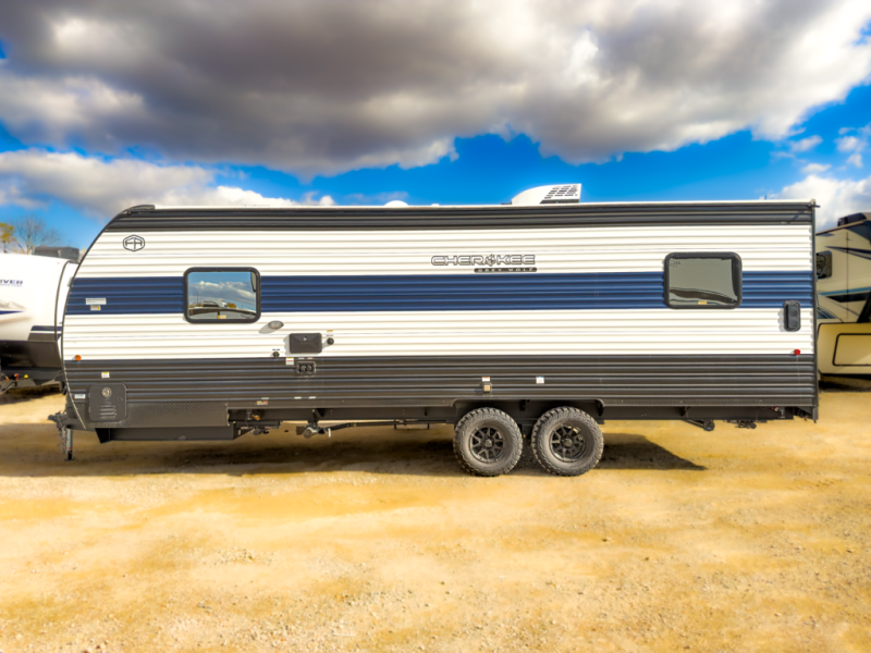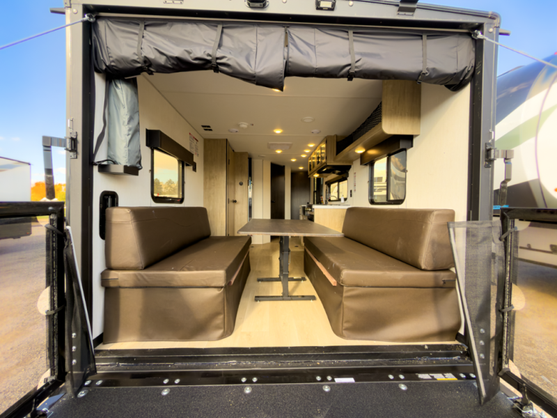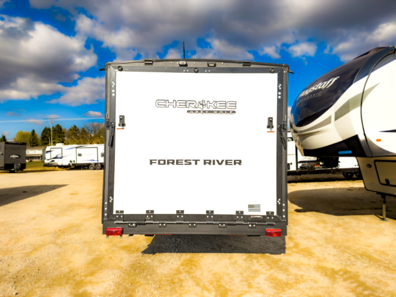 A: The Cherokee 22RR keeps things simple: open cargo space, front bedroom, convertible garage seating, and a full bath — all in a towable, single-axle footprint that fits state park sites across Michigan.