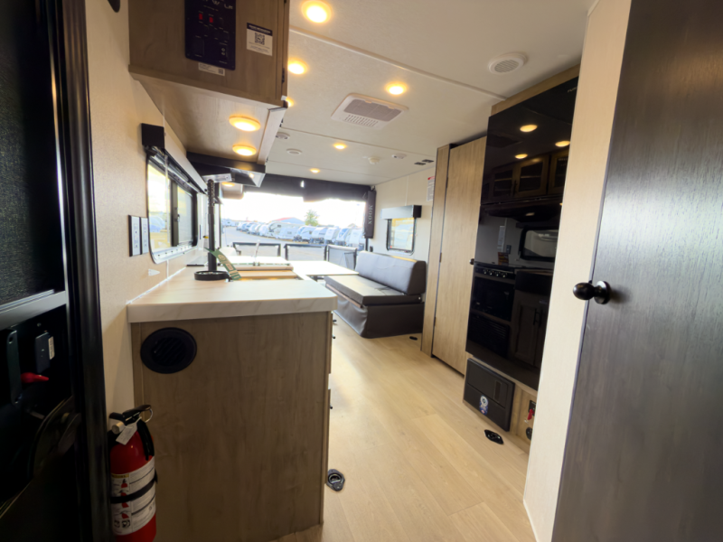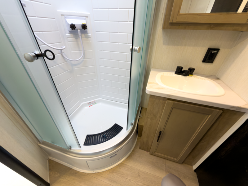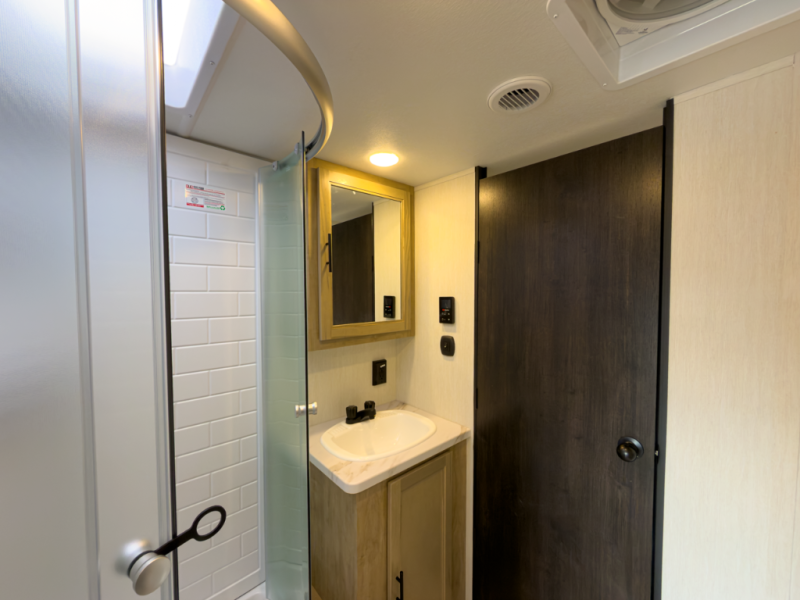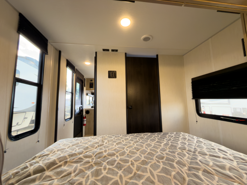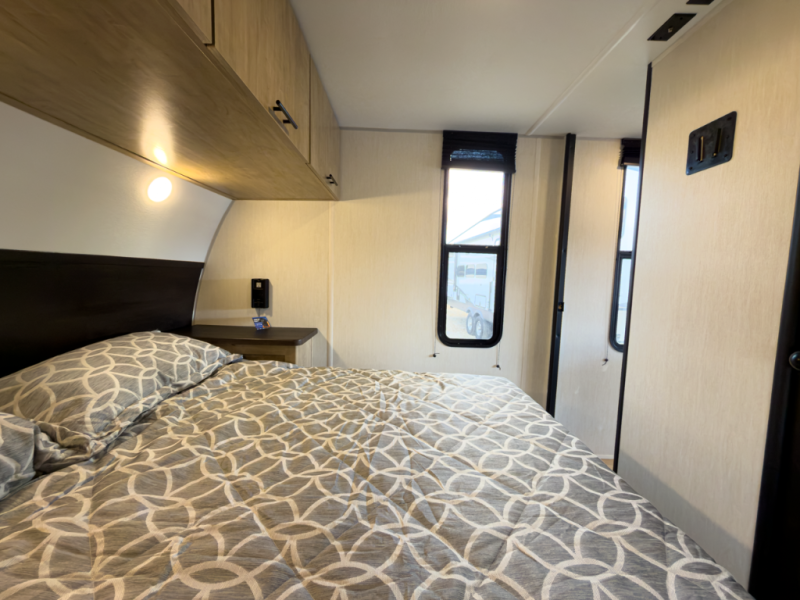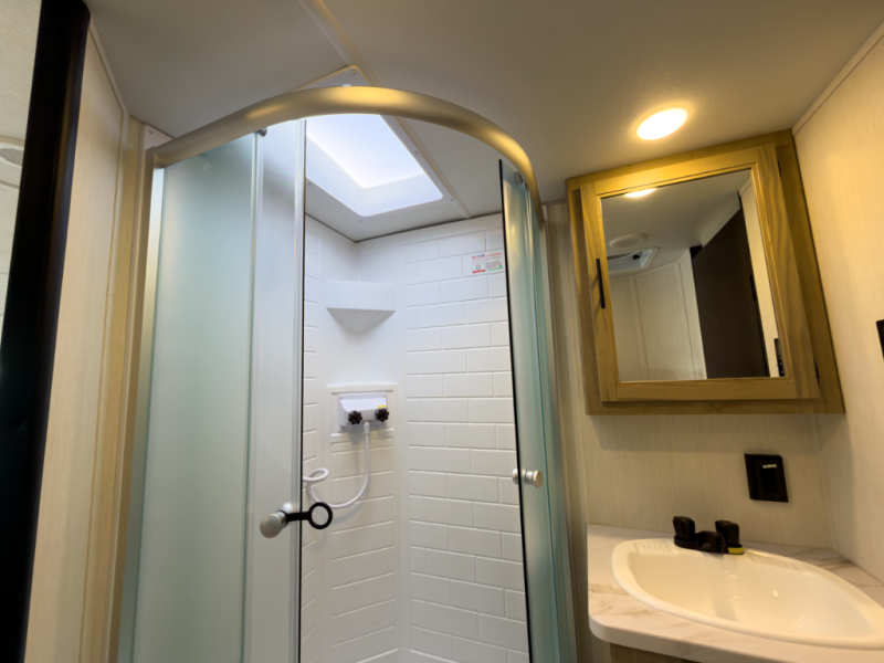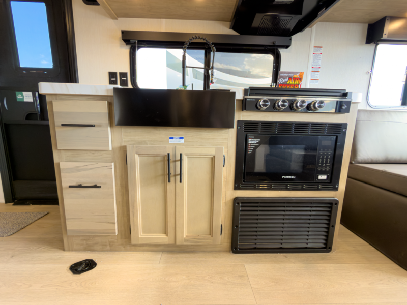 - Kitchen: 12V fridge, microwave, range, storage cabinets