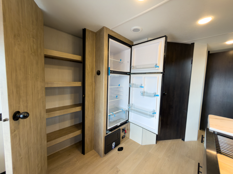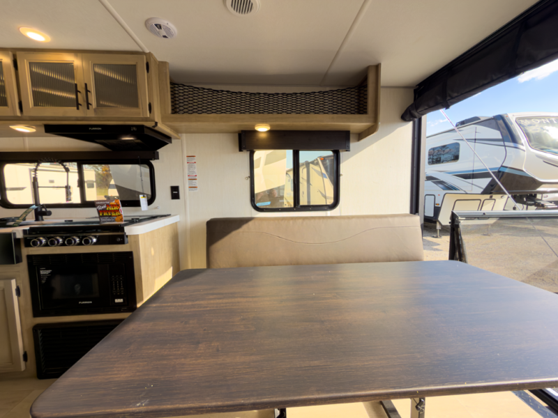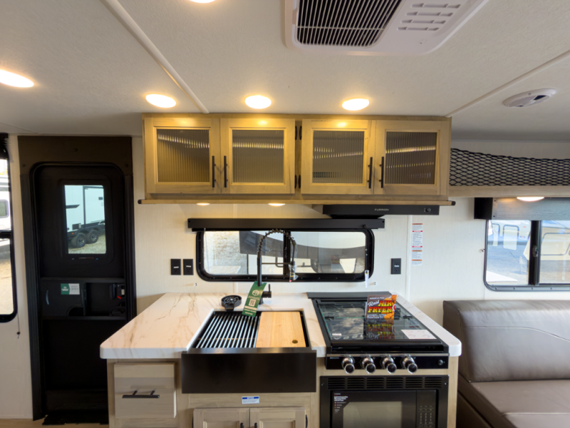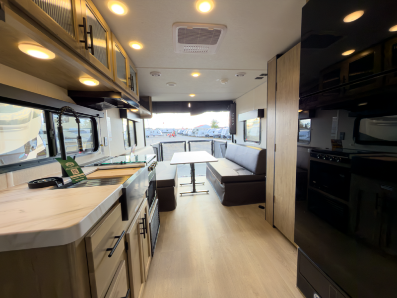 - Kitchen: 12V refrigerator, microwave, range, overhead storage